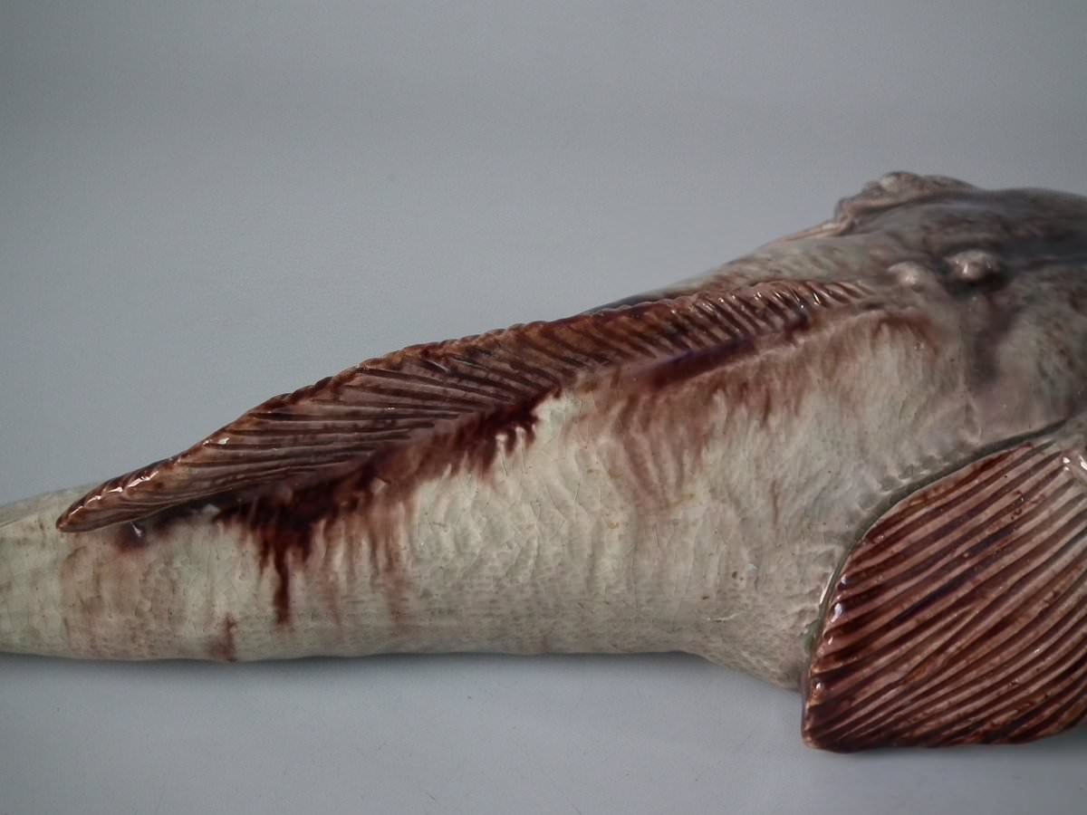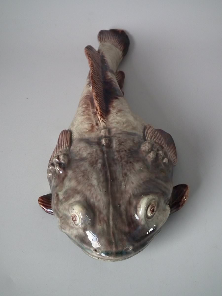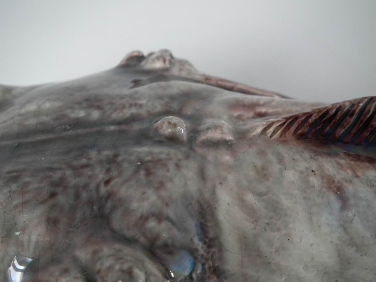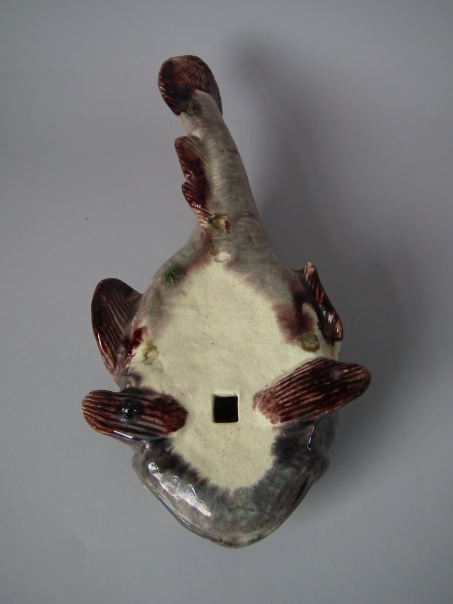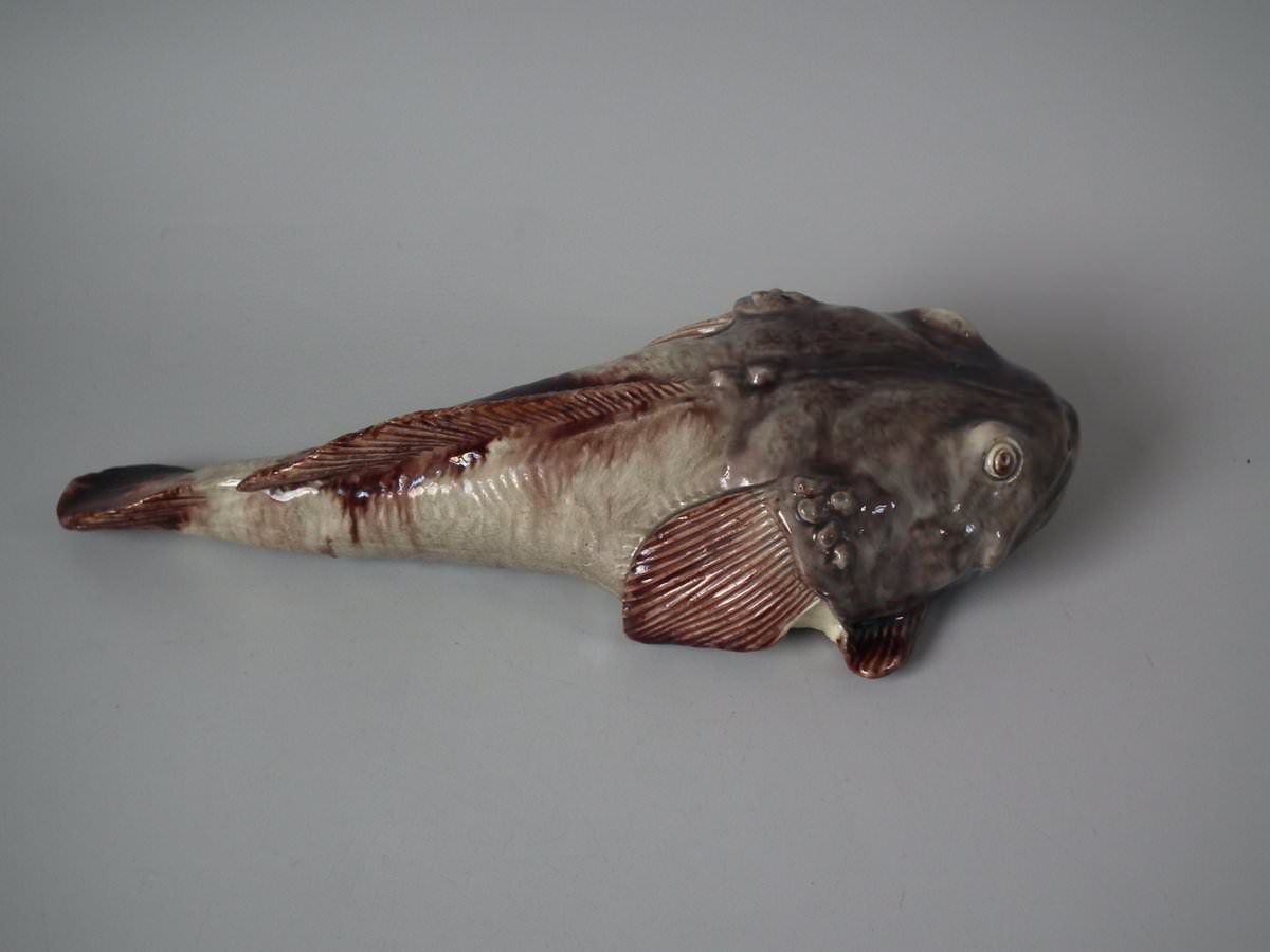 Circa 1890. 2.8ins high, 11.4ins wide, 5.1ins depth. Mafra Portuguese Palissy Majolica wall plaque which features a monkfish.