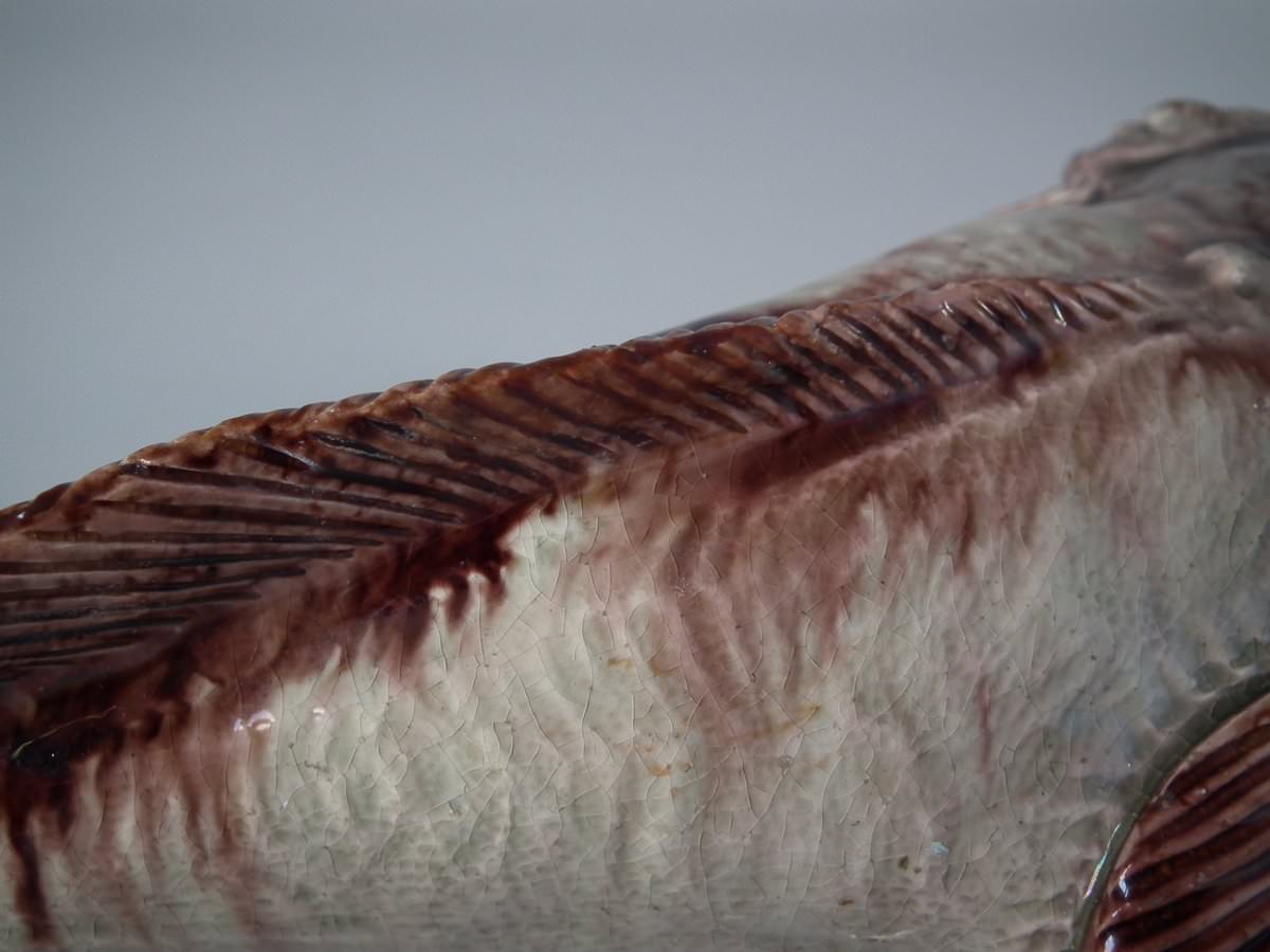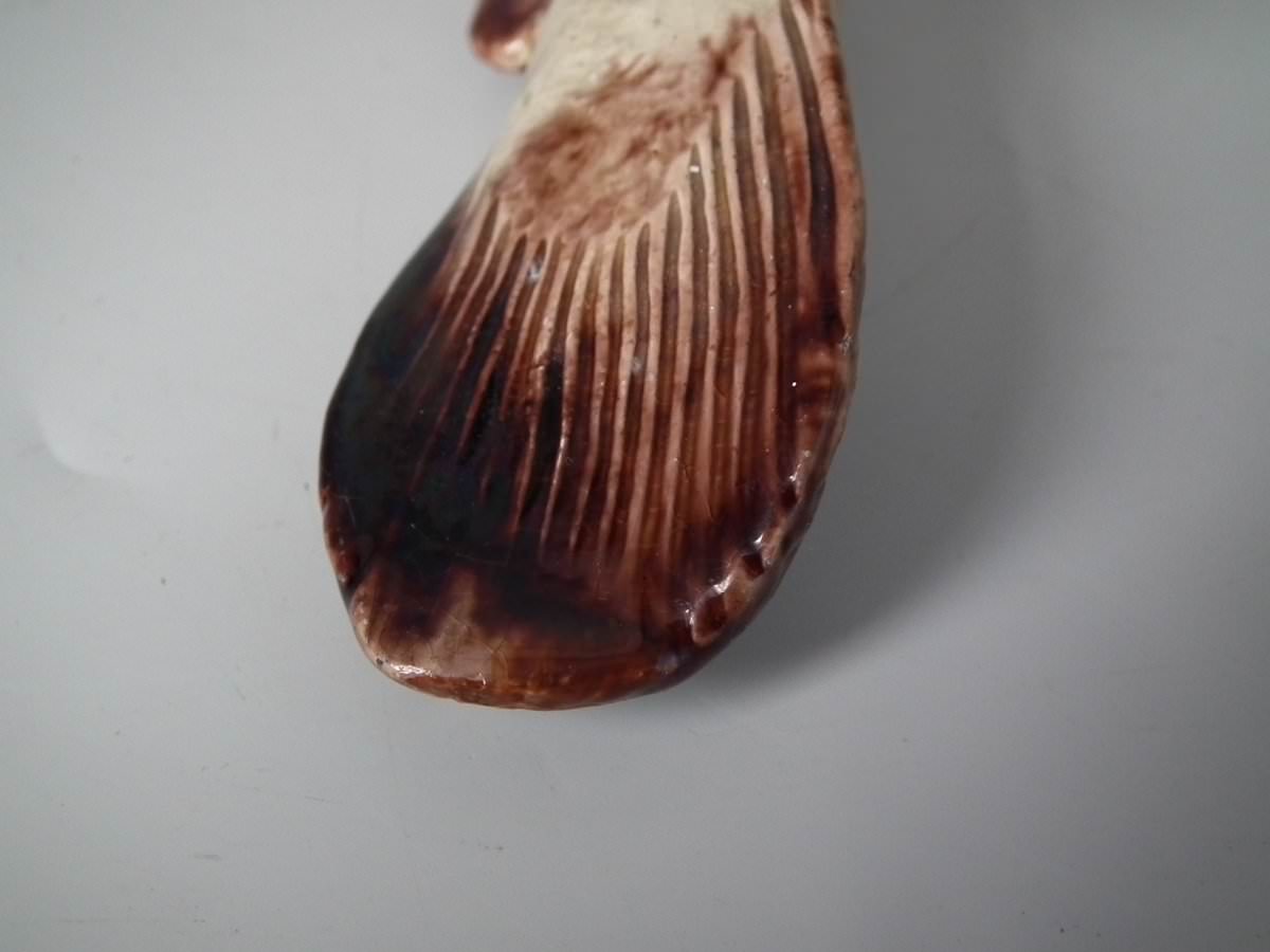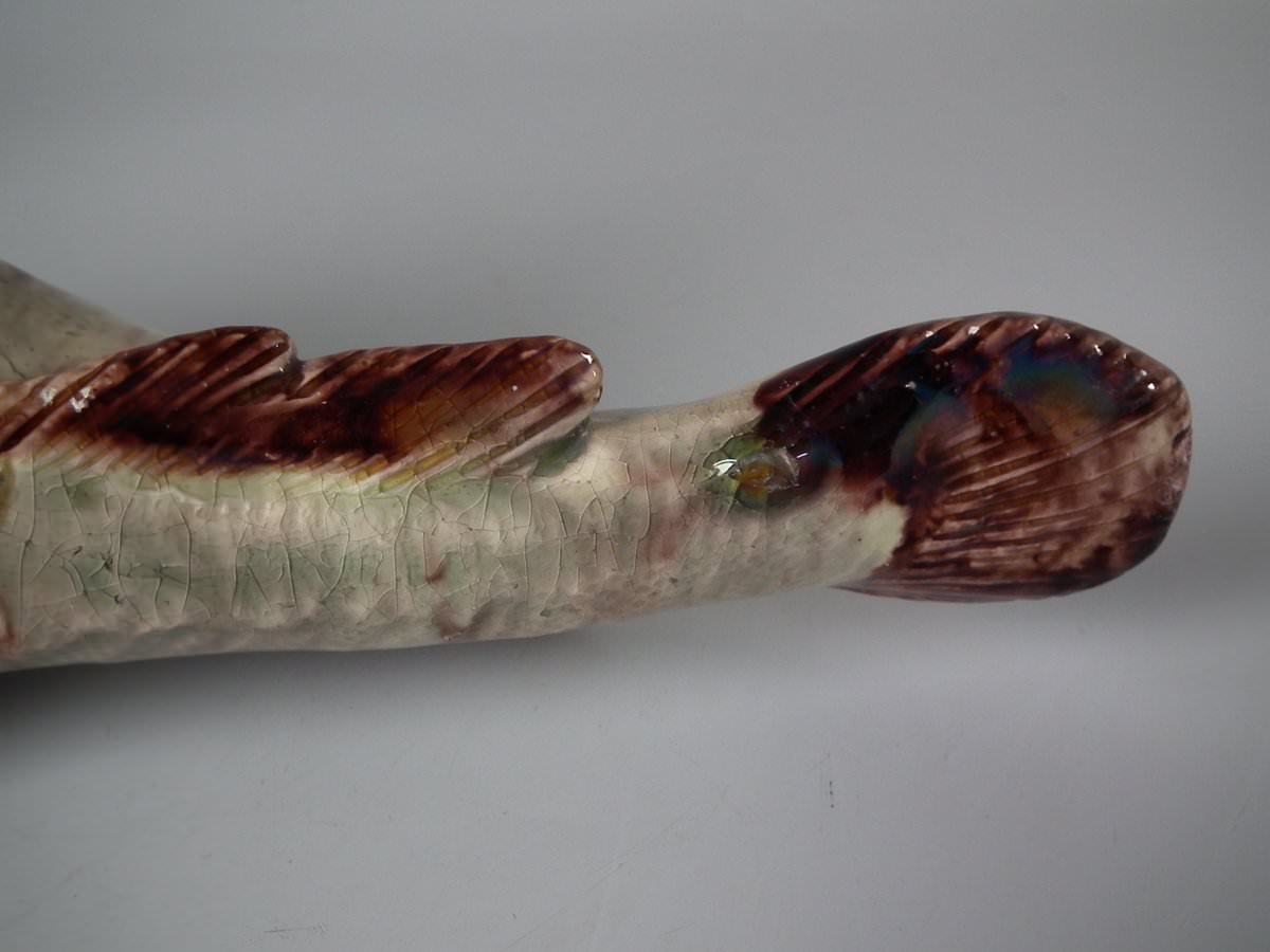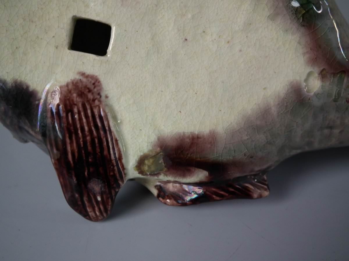 Circa 1890. 2.8ins high, 11.4ins wide, 5.1ins depth. Mafra Portuguese Palissy Majolica wall plaque which features a monkfish.