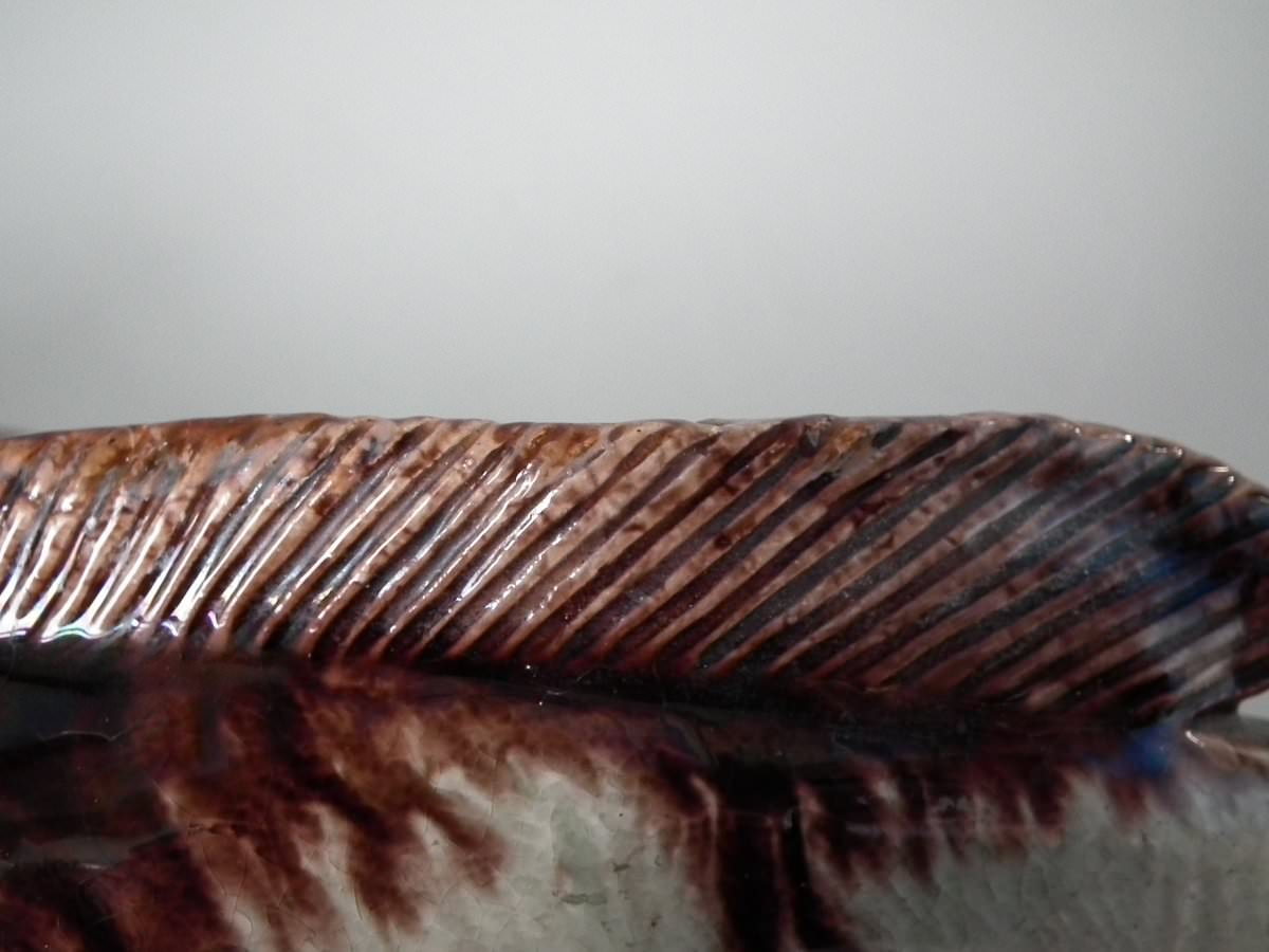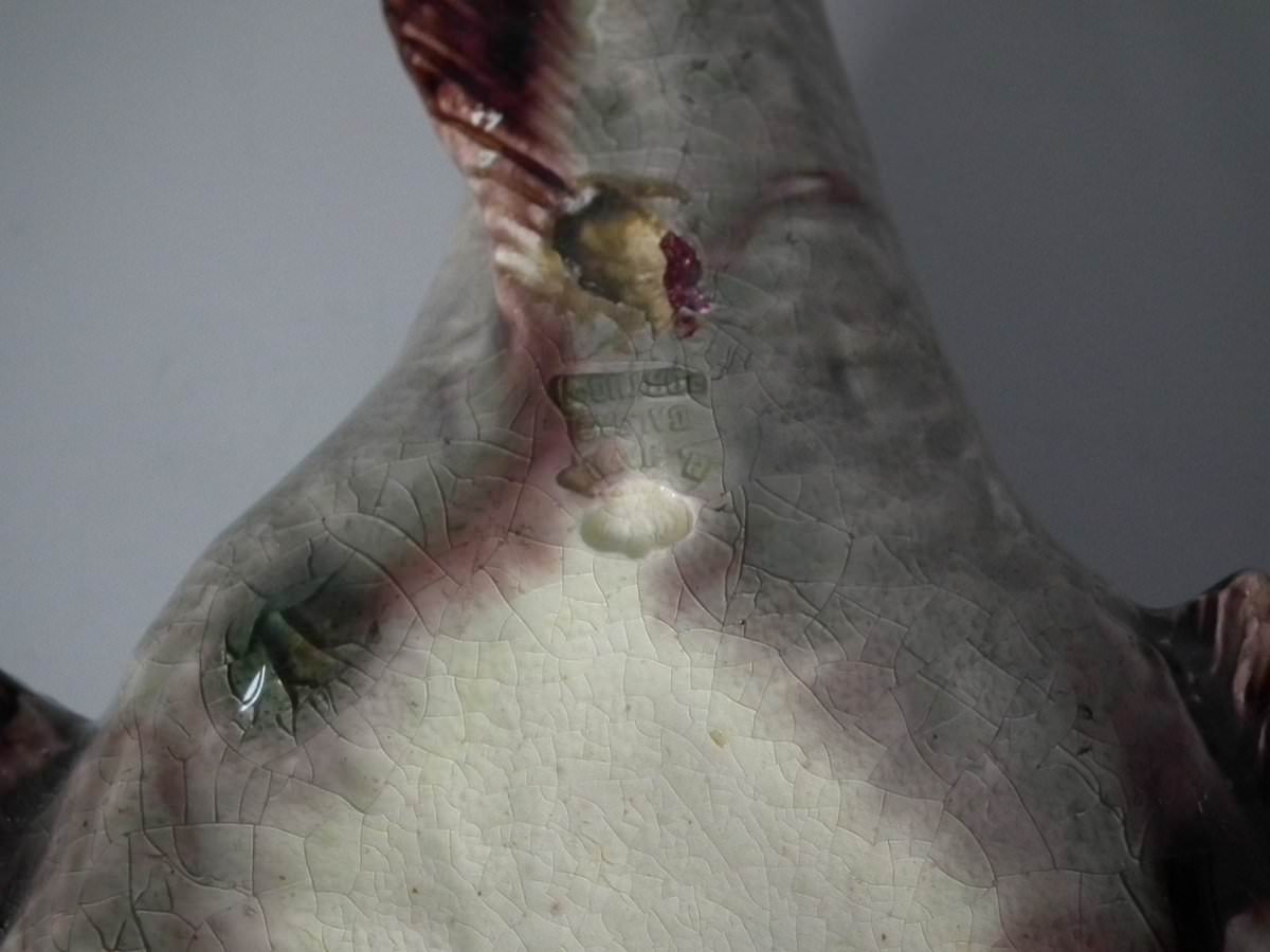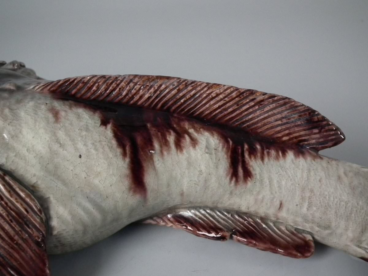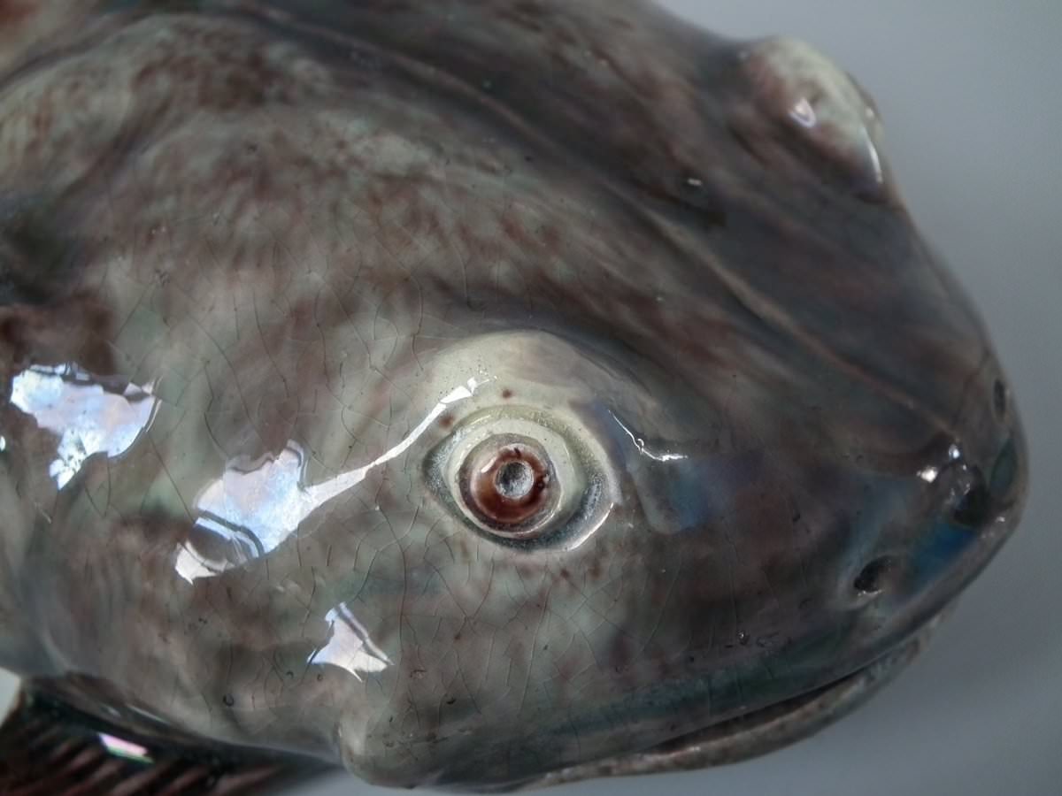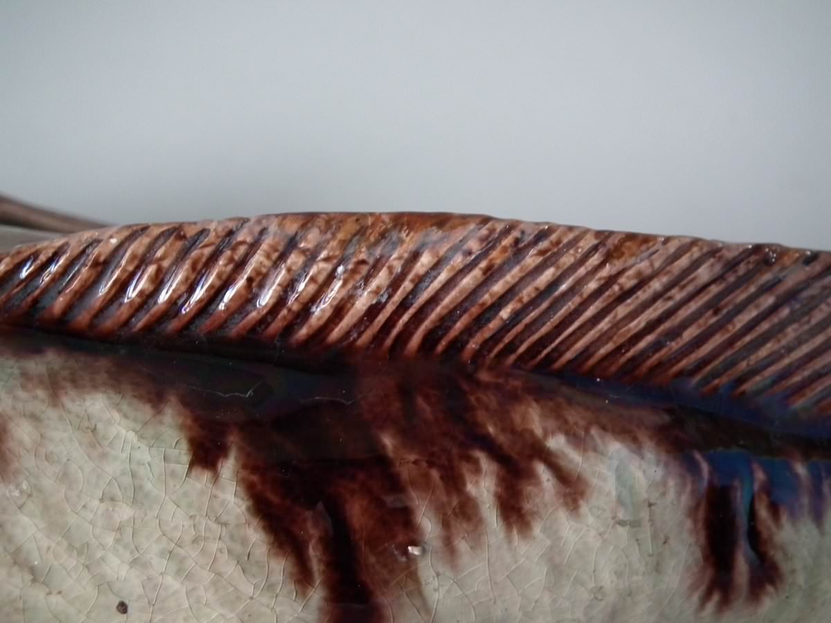 Circa 1890. 2.8ins high, 11.4ins wide, 5.1ins depth. Mafra Portuguese Palissy Majolica wall plaque which features a monkfish.