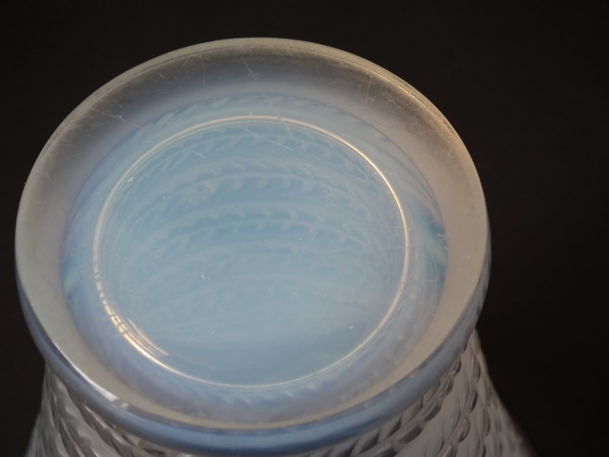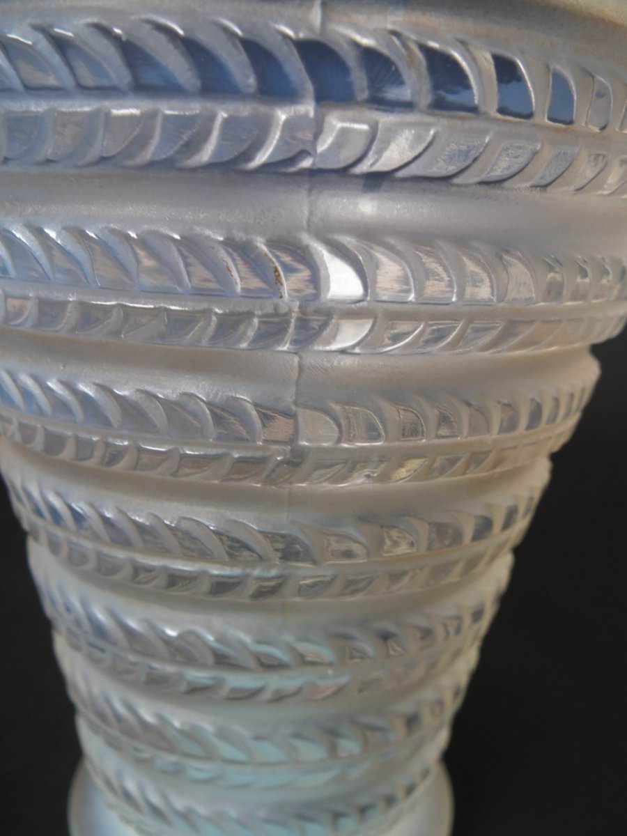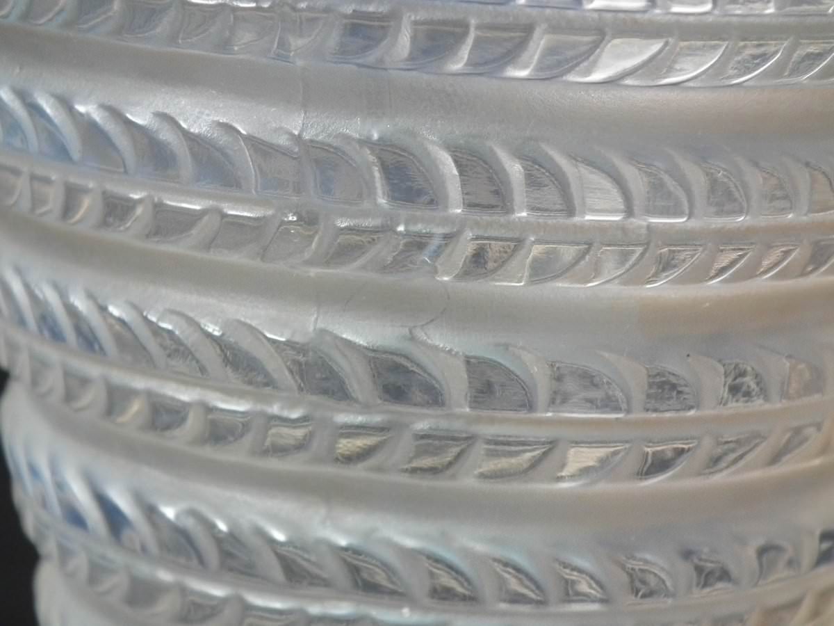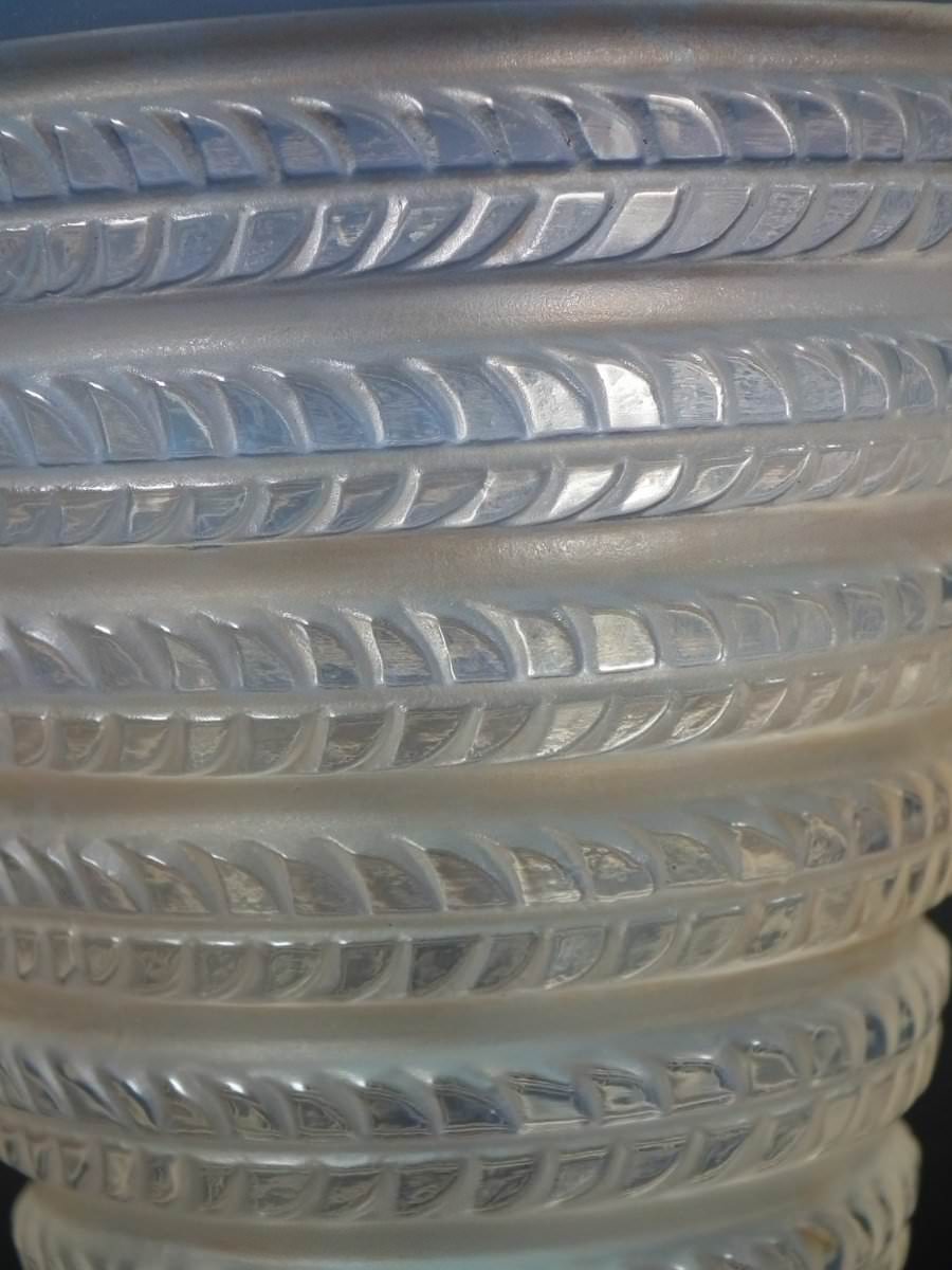 Introduced in 1926. Height: 12.7cm (5ins). Width: 11.6cm (4.57ins). Depth: 11.6cm (4.57ins).Rene Lalique Opalescent Glass 'Cytise' Vase, with sepia stained bands.