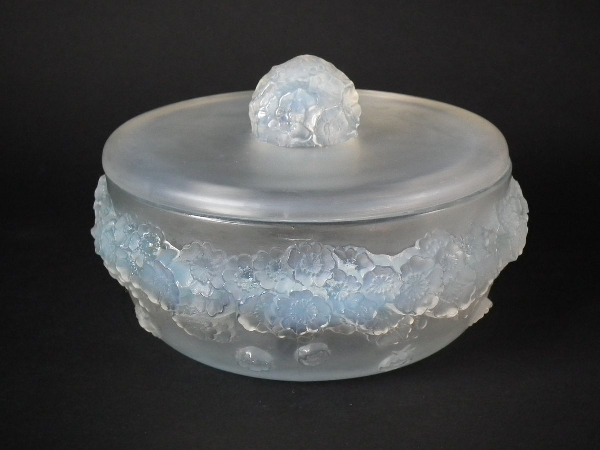 Introduced in 1927. Height: 11.5cm (4.53ins). Width: 16cm (6.3ins). Depth: 16cm (6.3ins).. Rene Lalique opalescent, frosted and clear glass 'Primevères' Box.