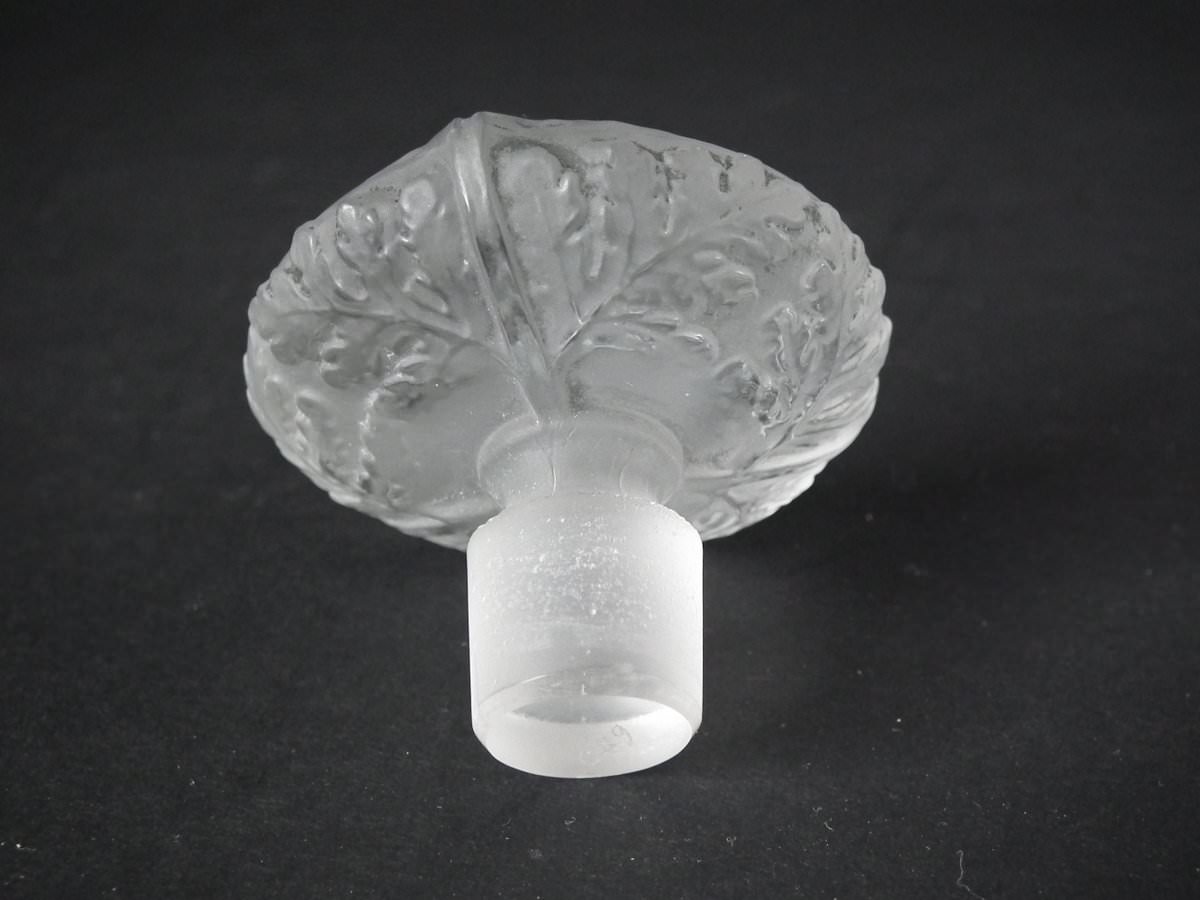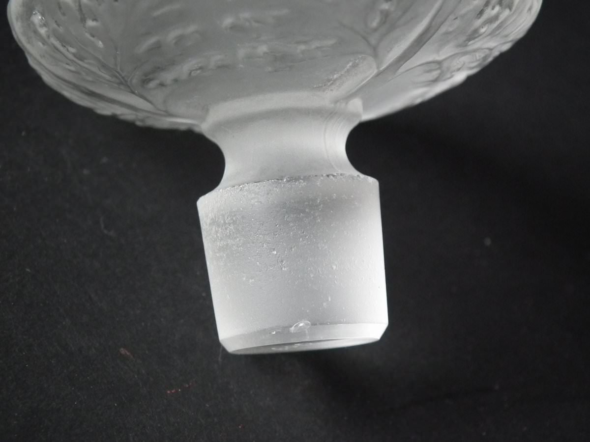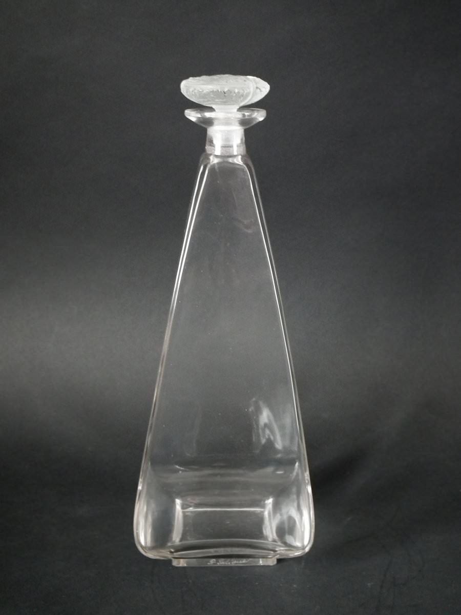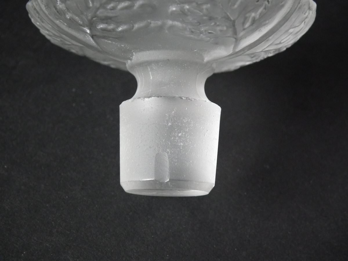 Engraved makers mark, 'R. Lalique' to the side of the base. Also, '600' engraved into the underside and on the stopper bung.