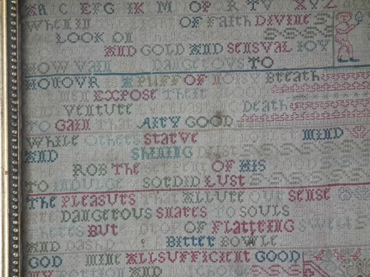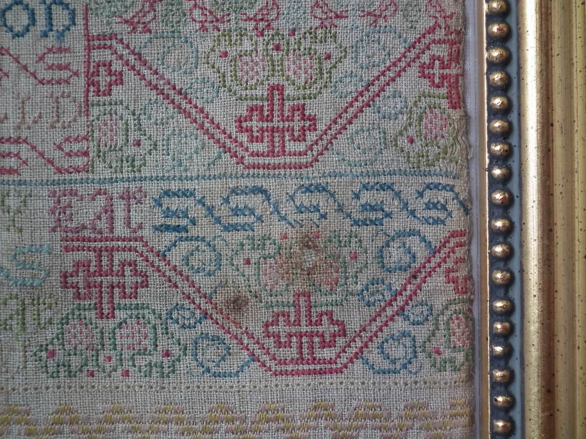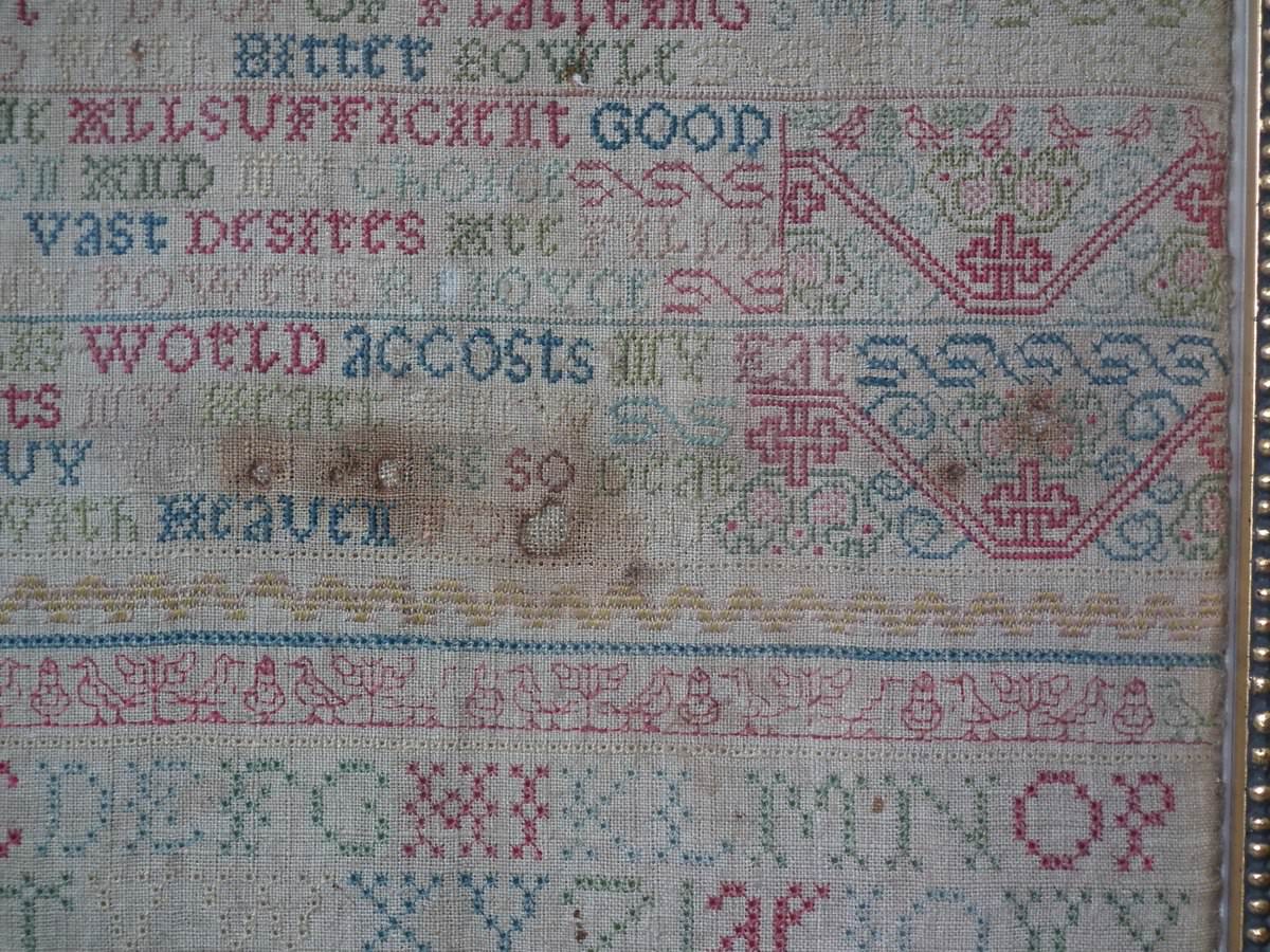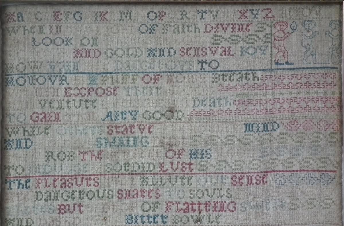 George I, dated 1717. 16.5ins high by 9.25ins wide. Antique Sampler, 1717 Band Sampler by Anna Prentice. The sampler is worked in silk on linen ground, in a variety of stitches.