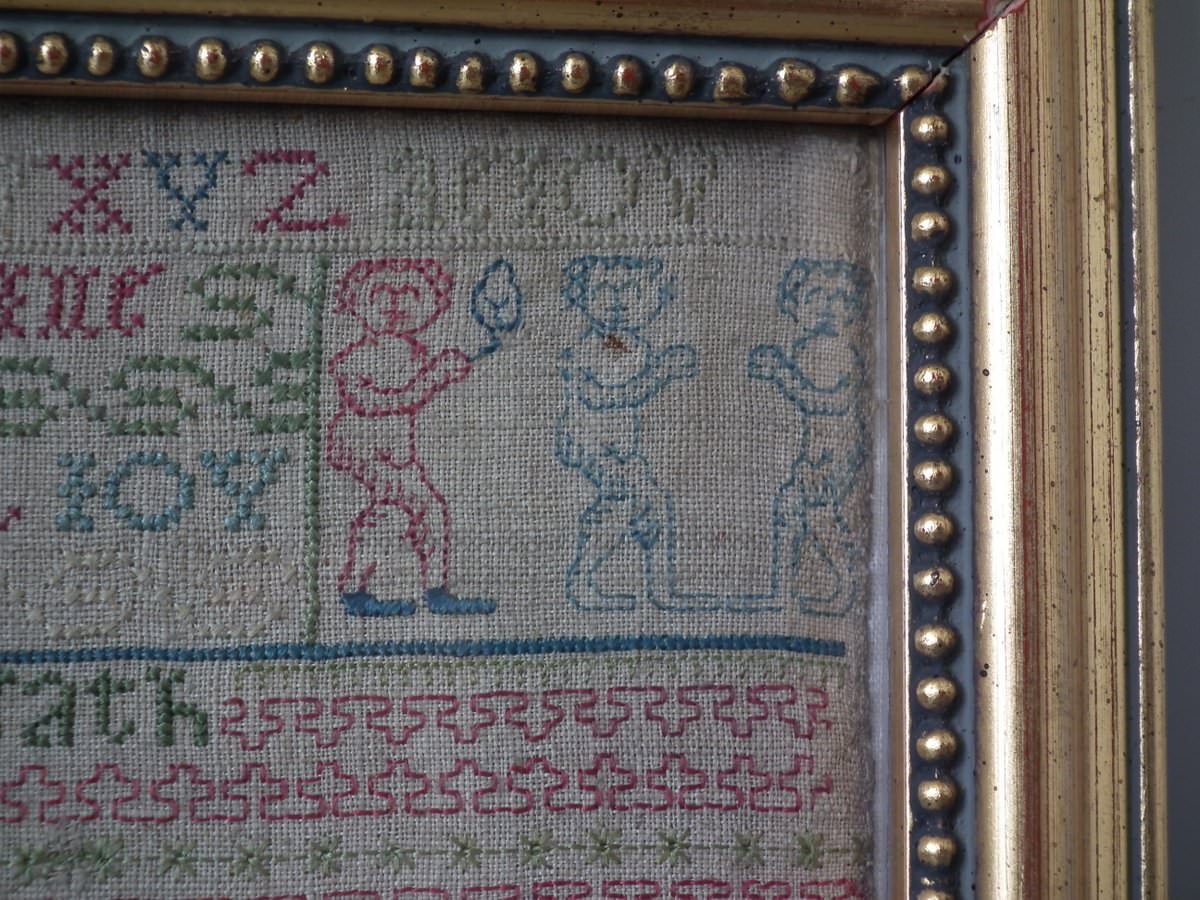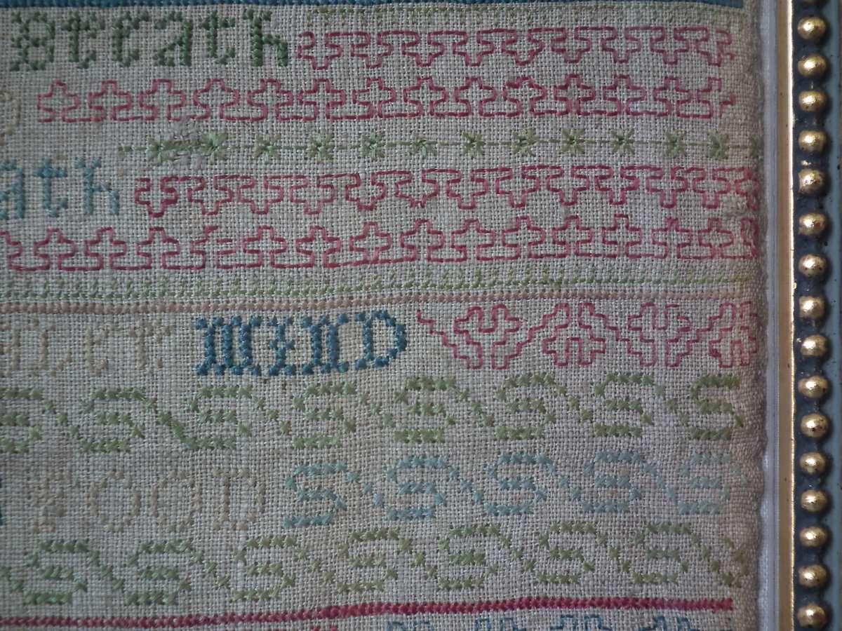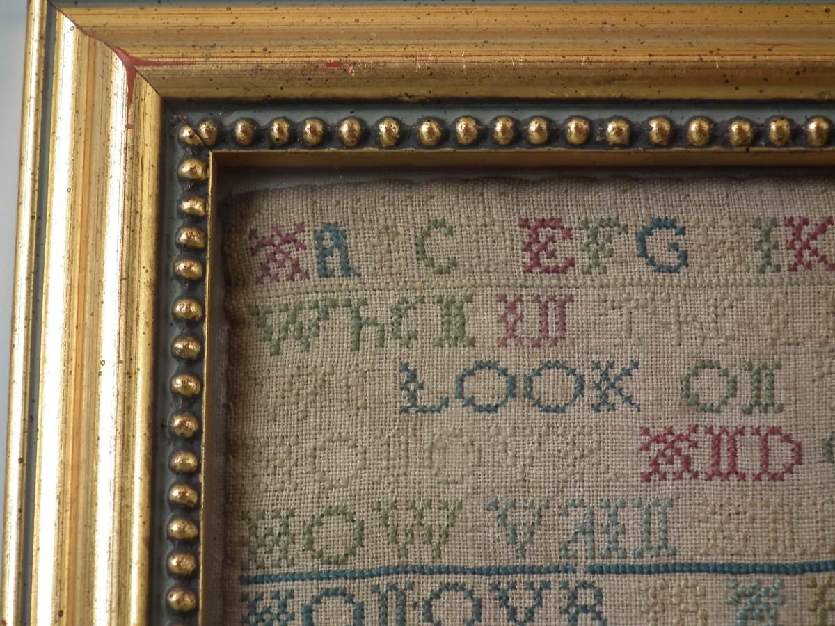 George I, dated 1717. 16.5ins high by 9.25ins wide. Antique Sampler, 1717 Band Sampler by Anna Prentice. The sampler is worked in silk on linen ground, in a variety of stitches.
