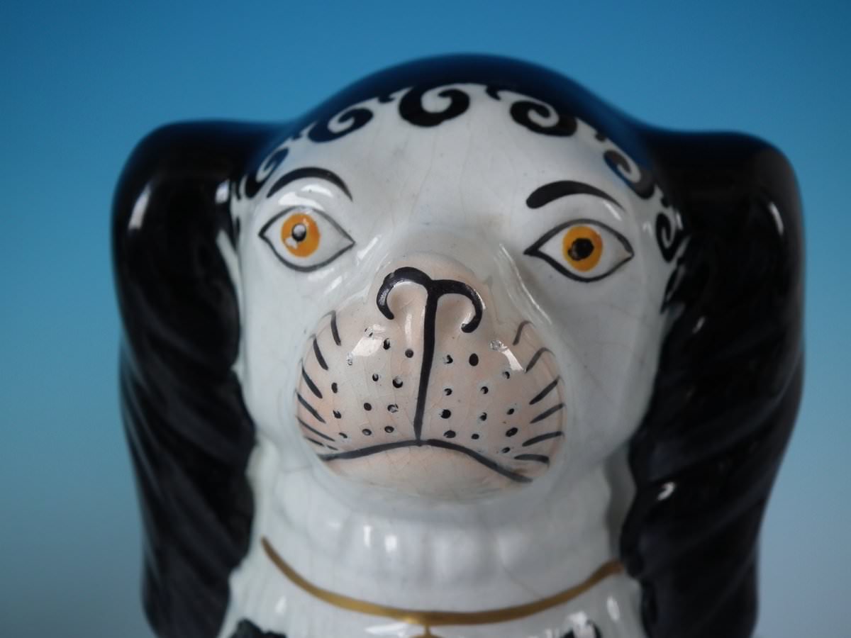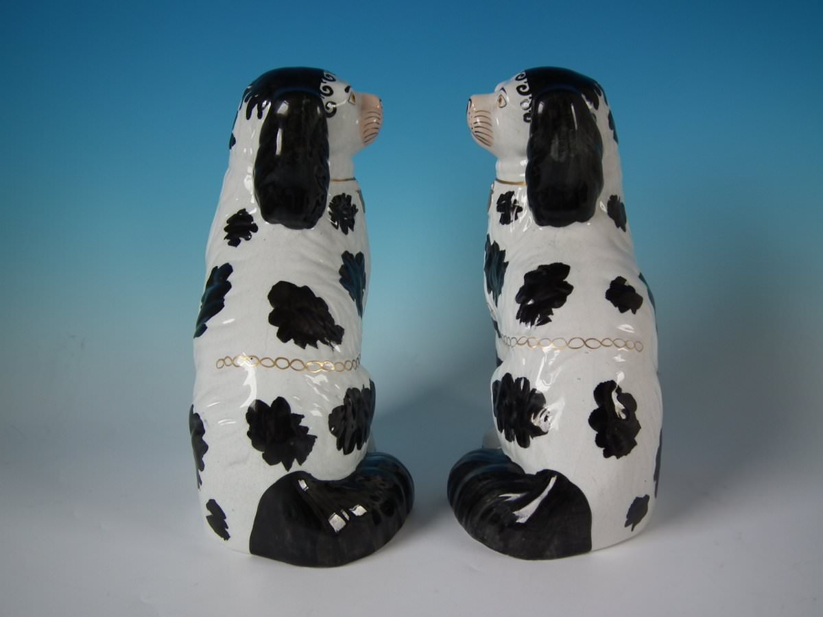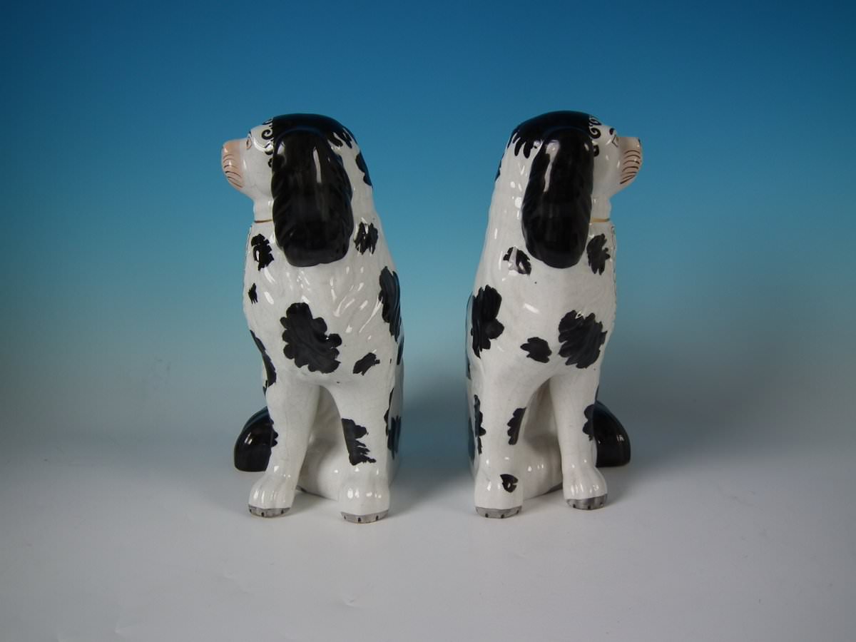 Victorian, circa 1860. Tallest is 10.2ins high, 7.5ins wide, 4.7ins depth. Pair of Staffordshire Pottery models which feature a spaniel with Disraeli curls to head, front leg free, seated directly on the ground, no base.