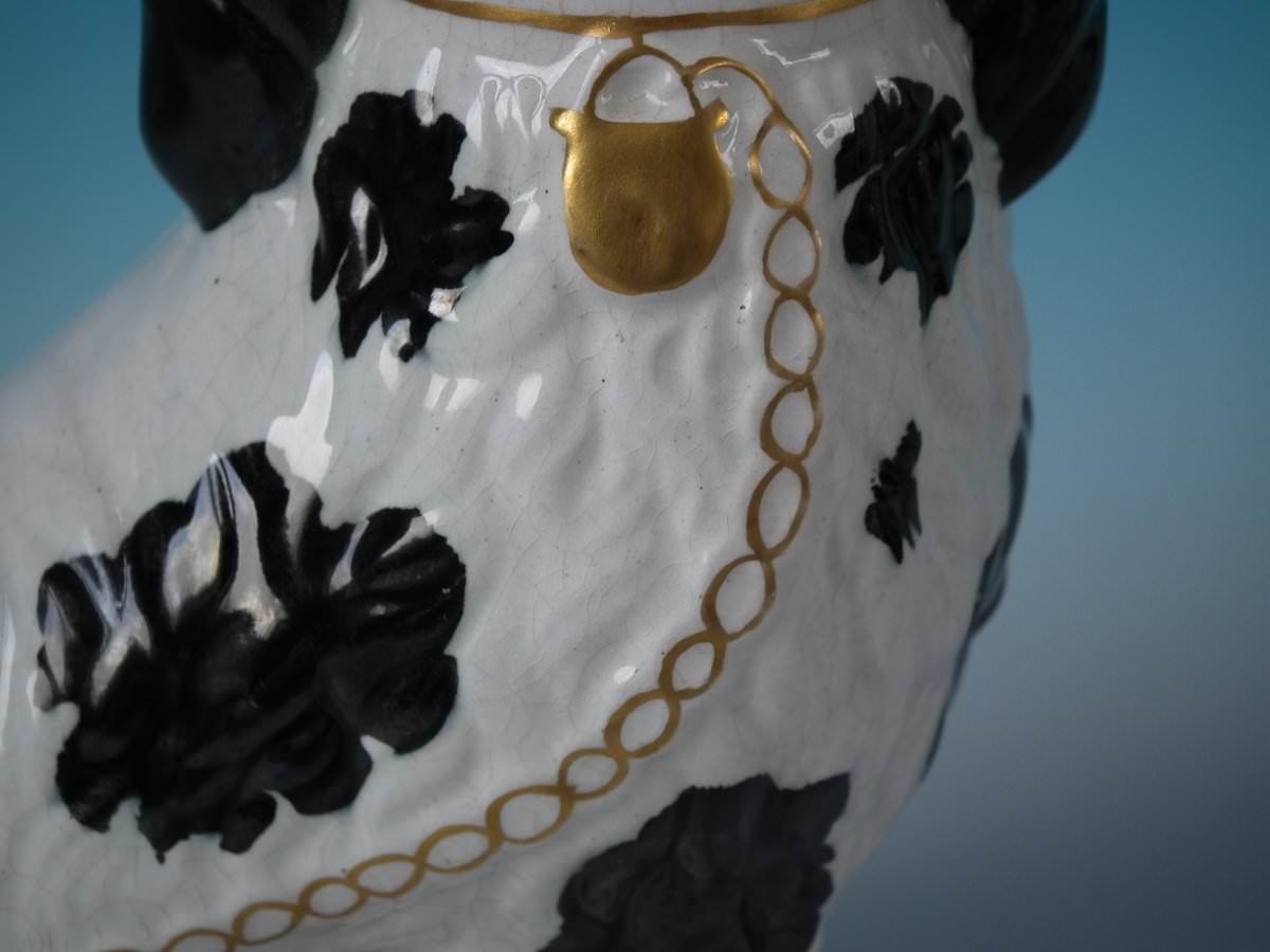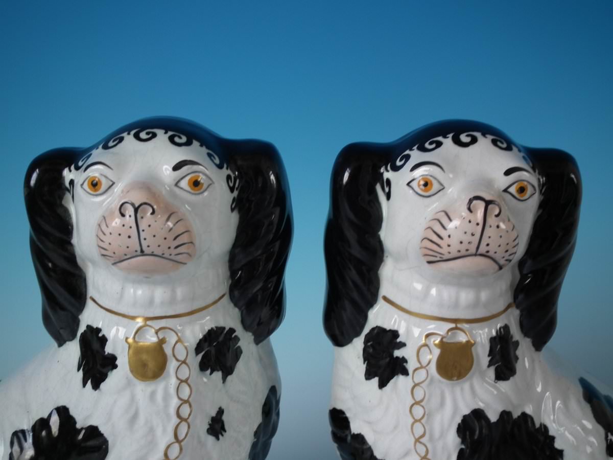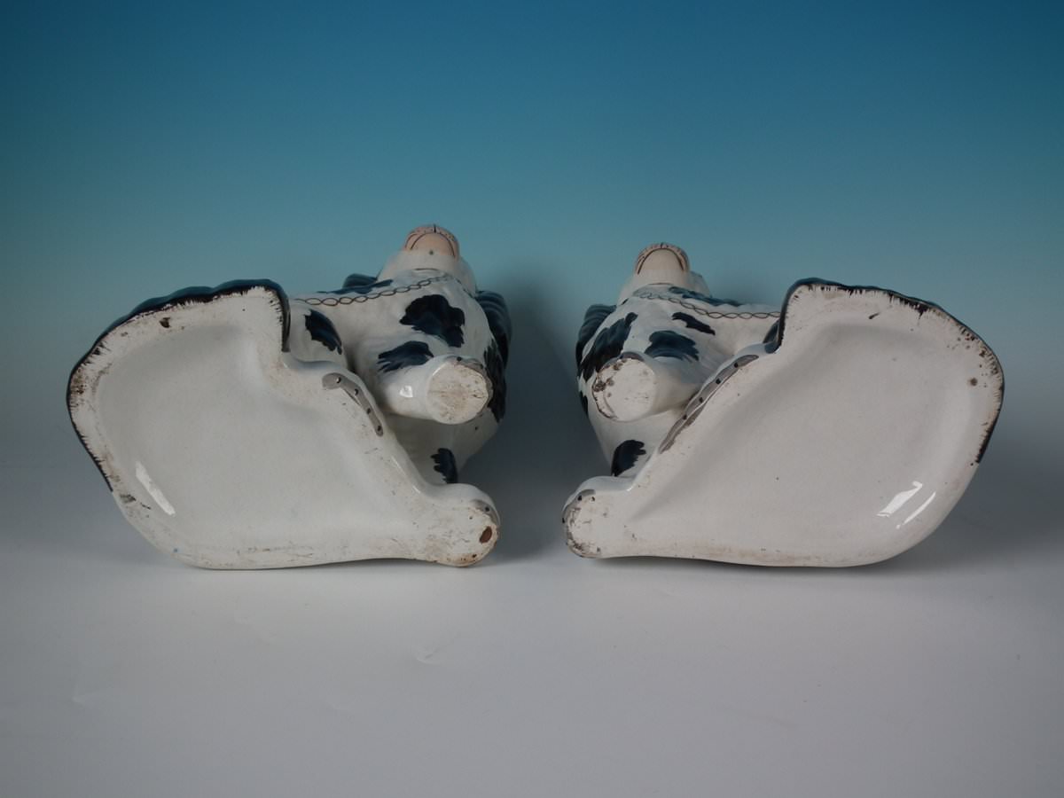 Victorian, circa 1860. Tallest is 10.2ins high, 7.5ins wide, 4.7ins depth. Pair of Staffordshire Pottery models which feature a spaniel with Disraeli curls to head, front leg free, seated directly on the ground, no base.