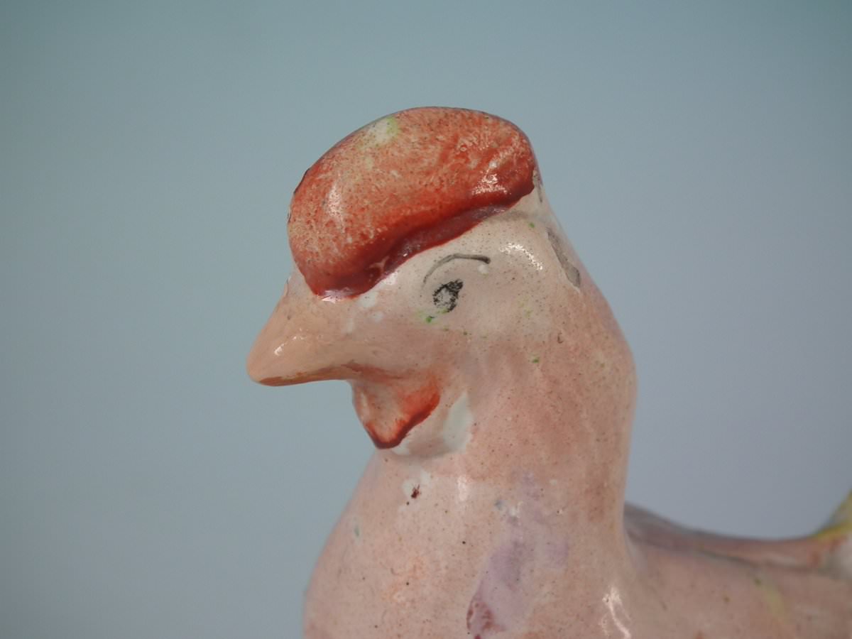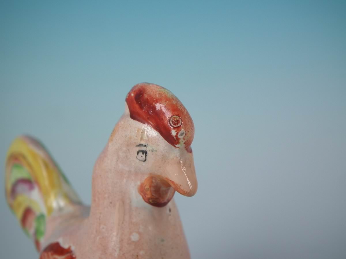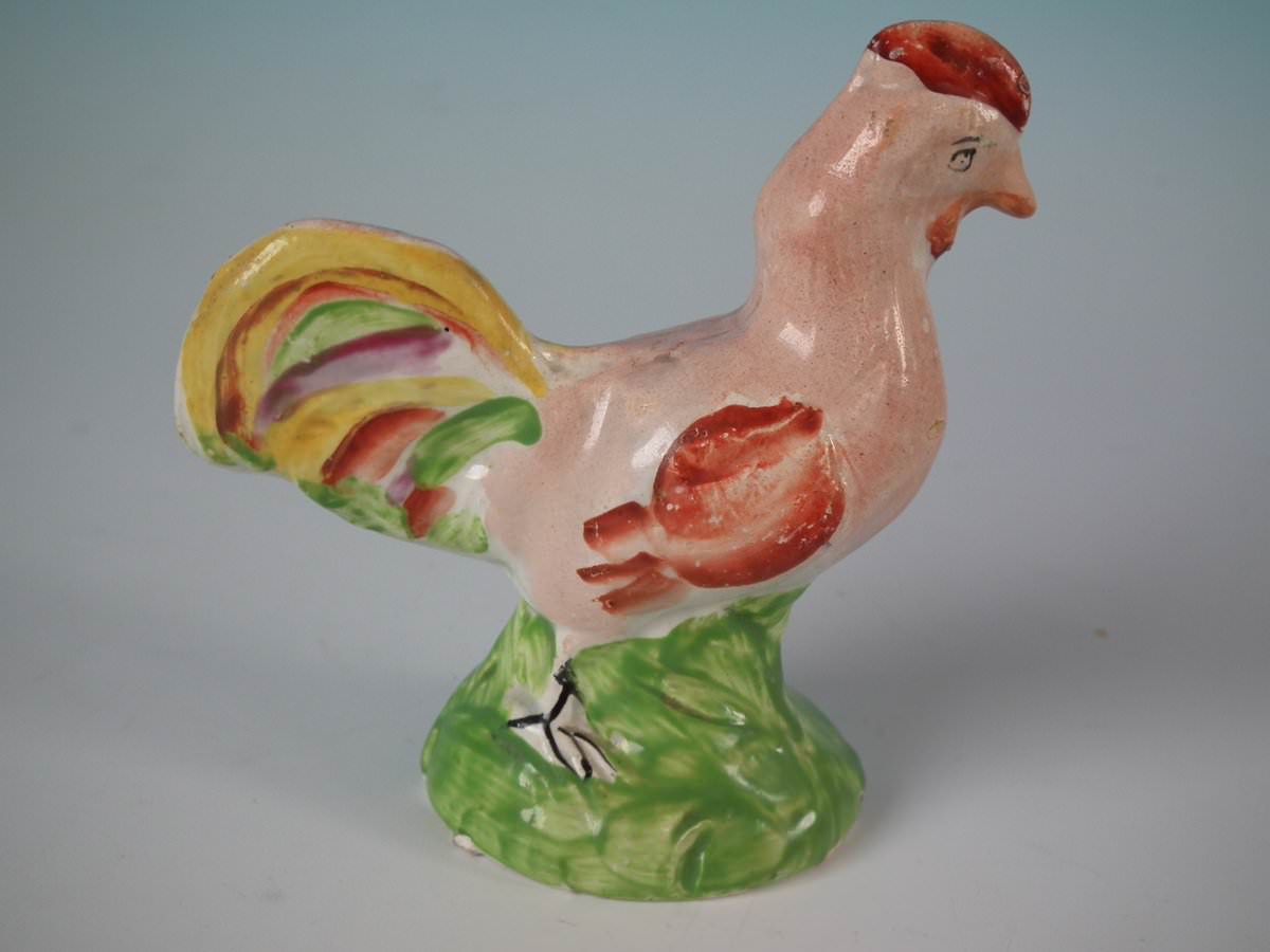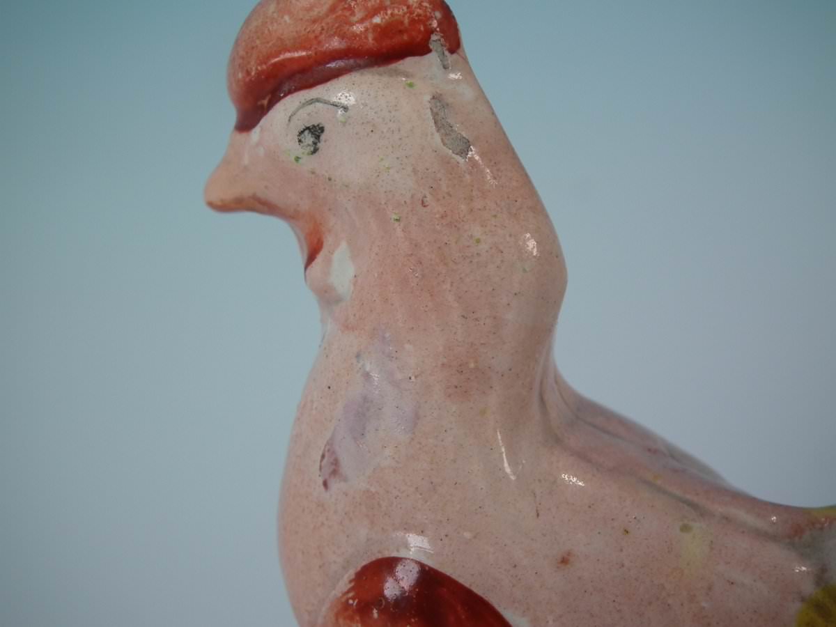 pre-Victorian, circa 1820. 3.5ins high, 3.5ins wide, 1.6ins depth. Staffordshire Pottery pearlware figure with a pastoral theme which features a cockerel/rooster, stood on a round hollow base.