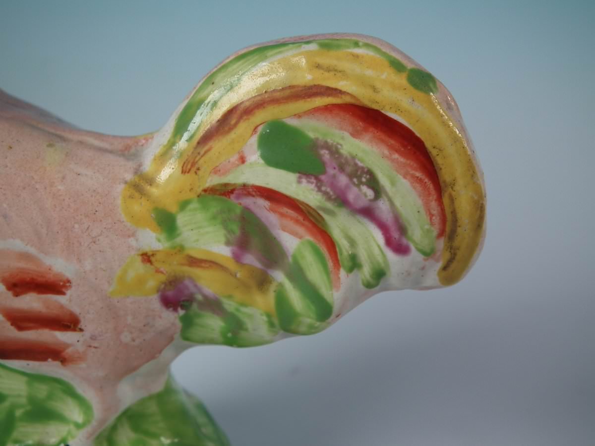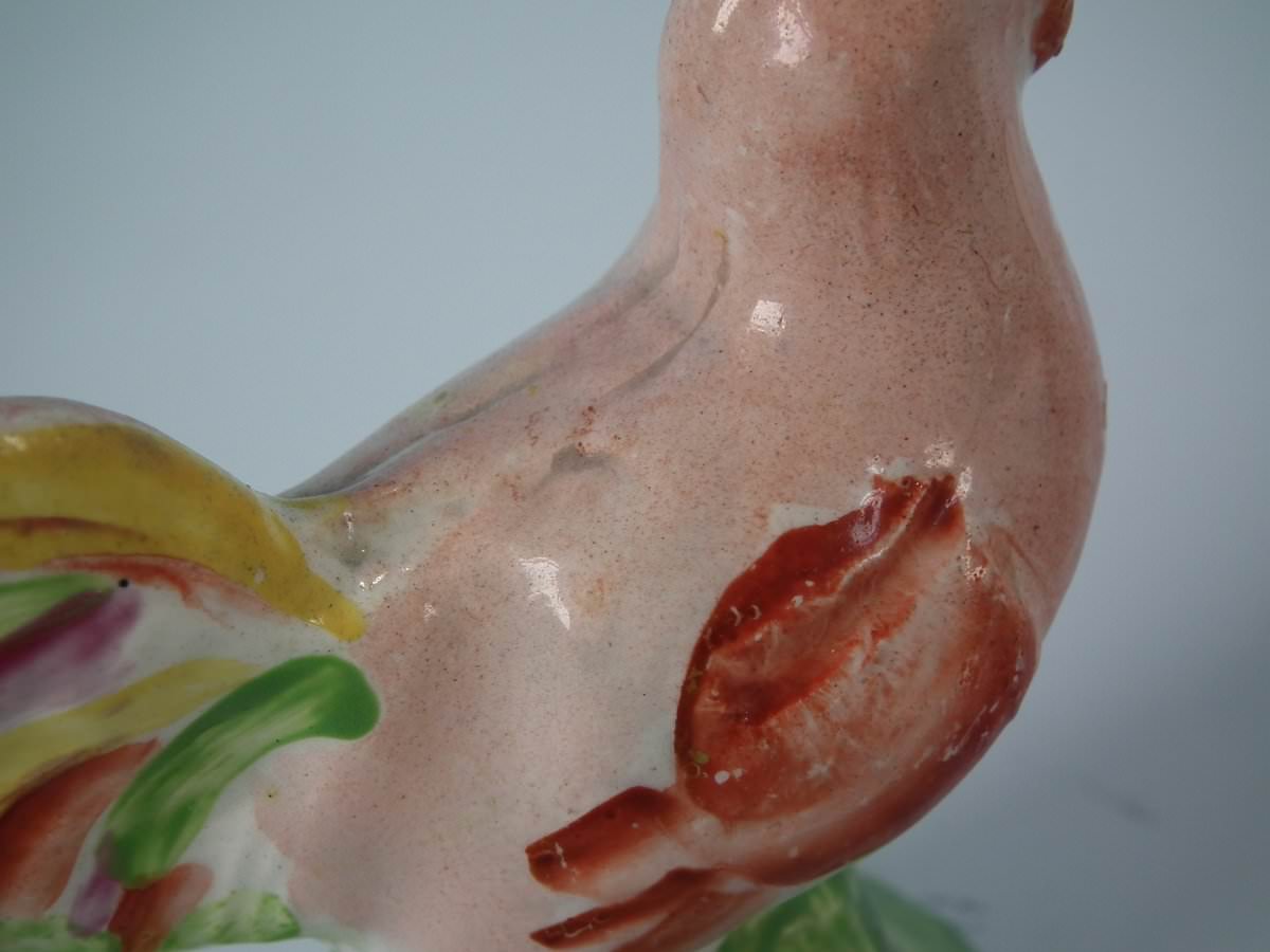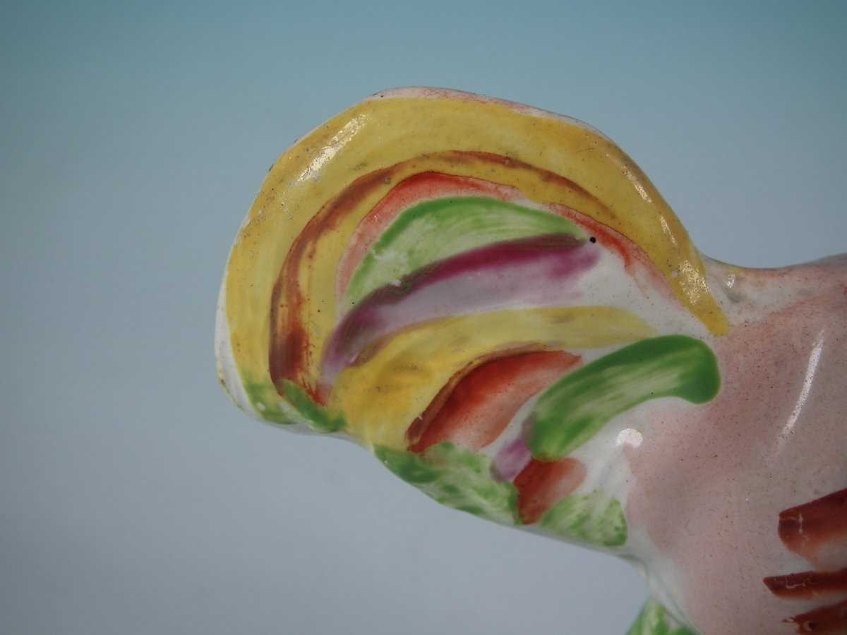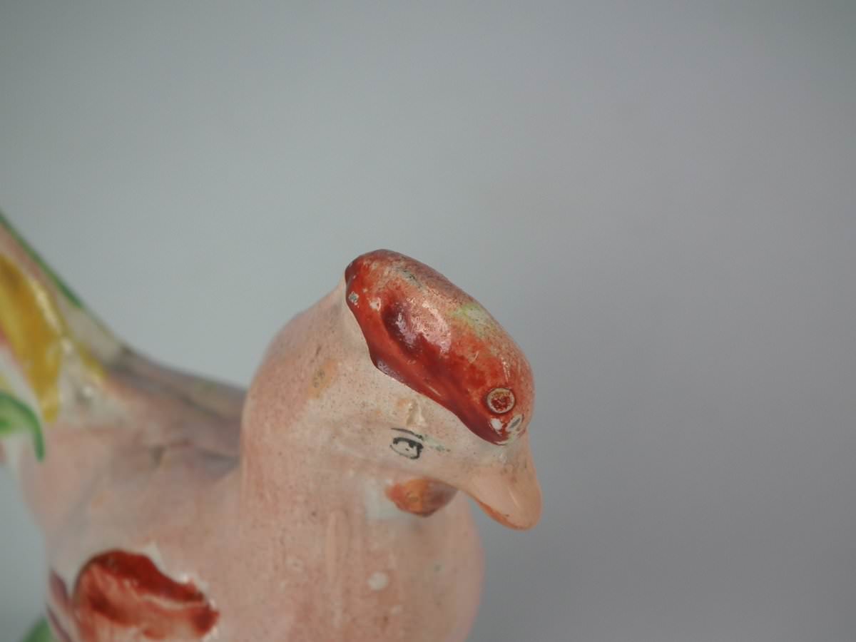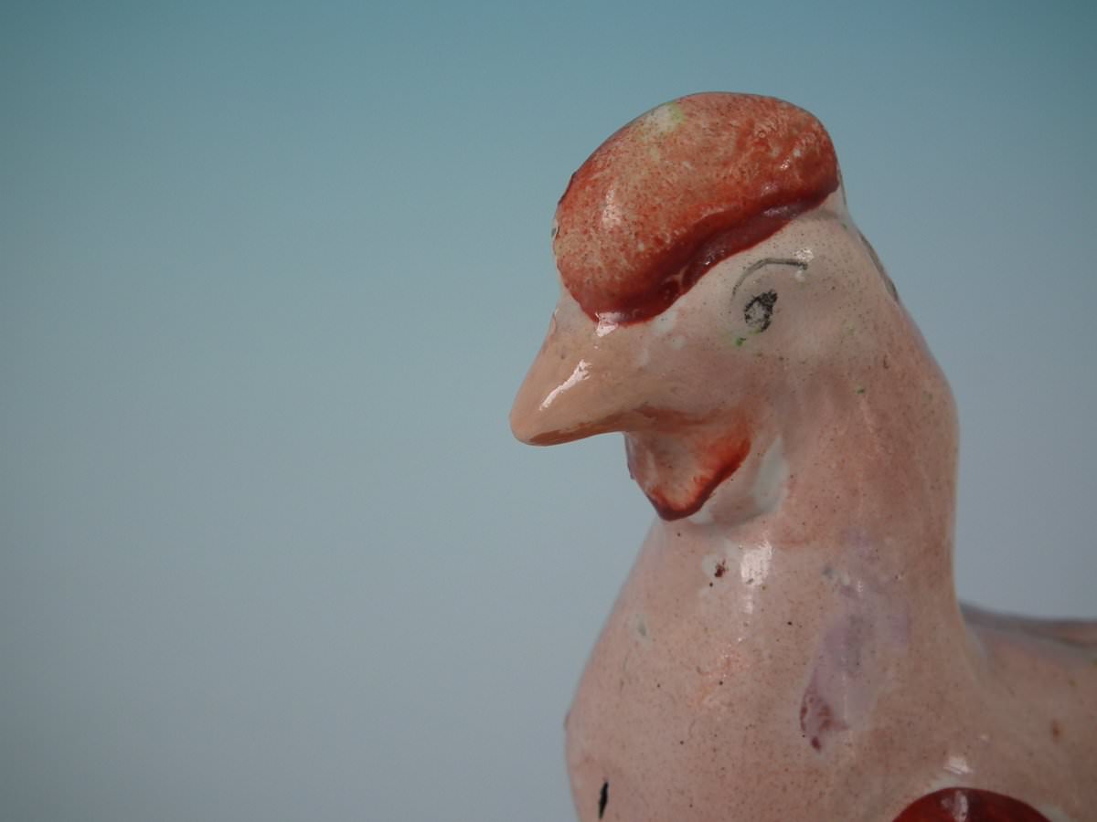 pre-Victorian, circa 1820. 3.5ins high, 3.5ins wide, 1.6ins depth. Staffordshire Pottery pearlware figure with a pastoral theme which features a cockerel/rooster, stood on a round hollow base.