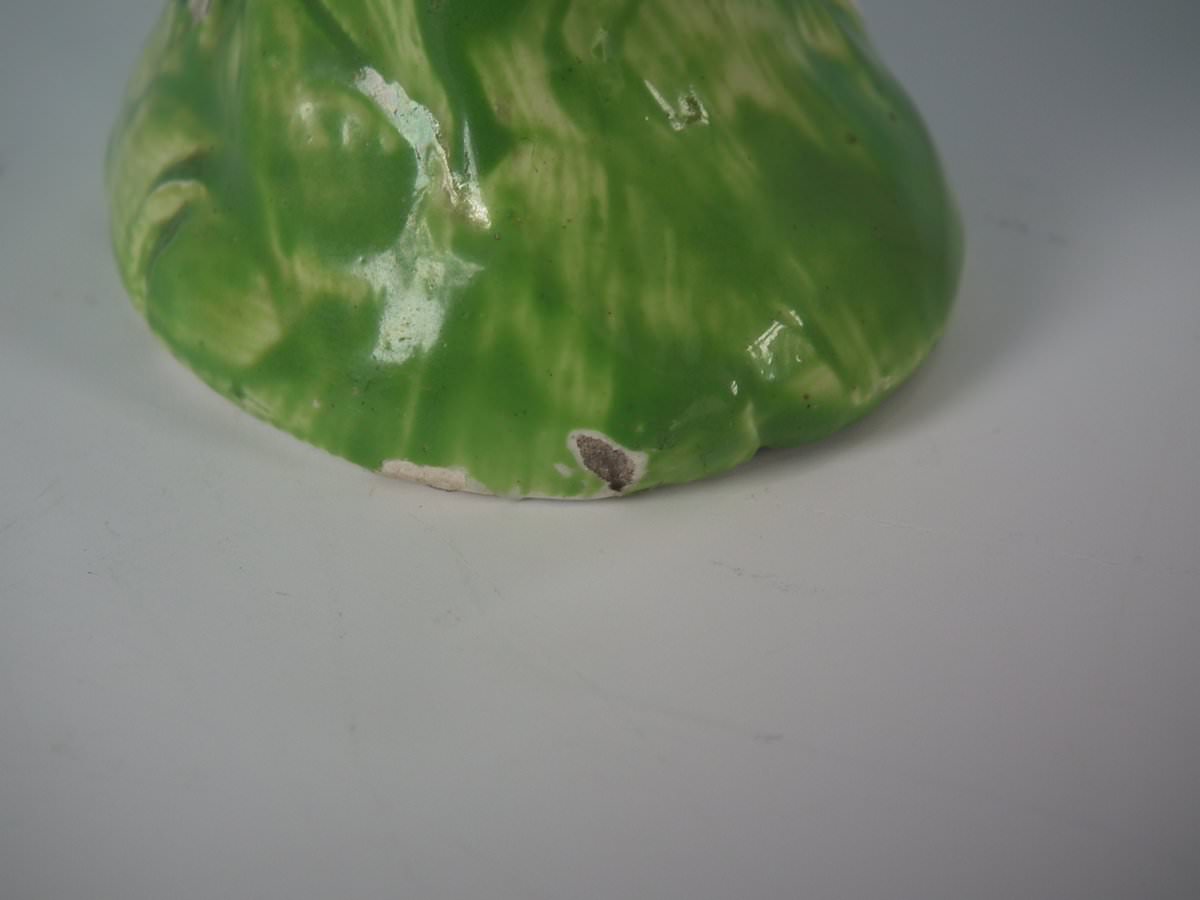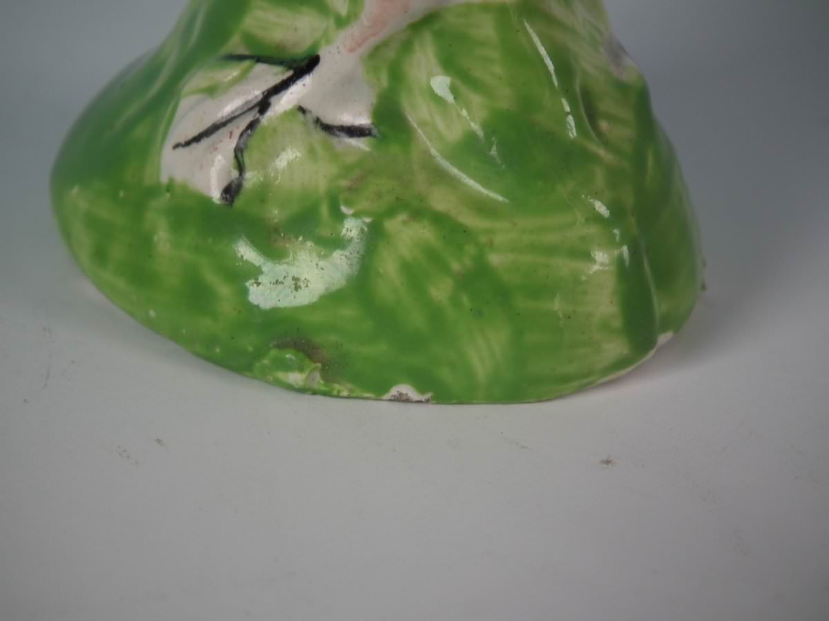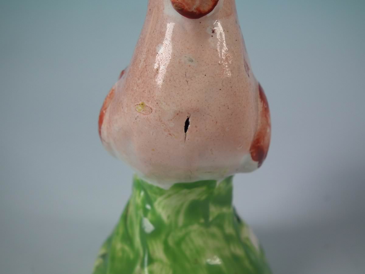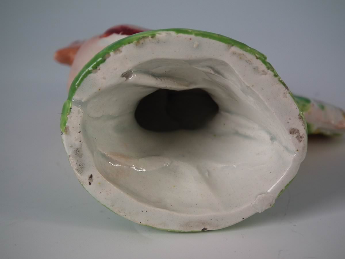 pre-Victorian, circa 1820. 3.5ins high, 3.5ins wide, 1.6ins depth. Staffordshire Pottery pearlware figure with a pastoral theme which features a cockerel/rooster, stood on a round hollow base.