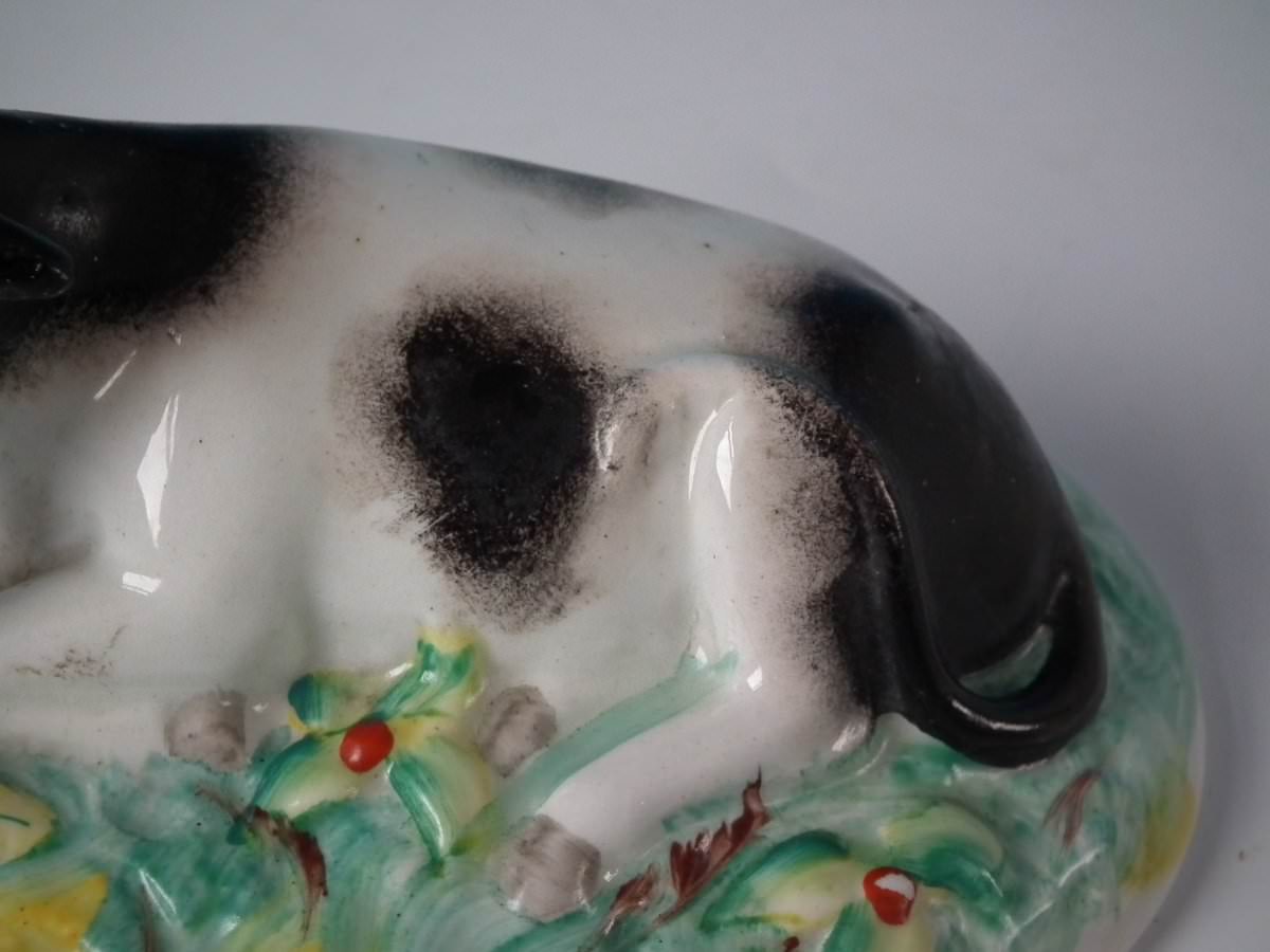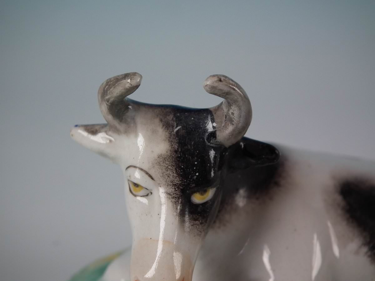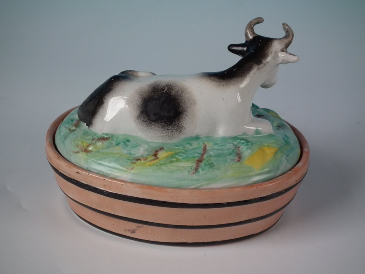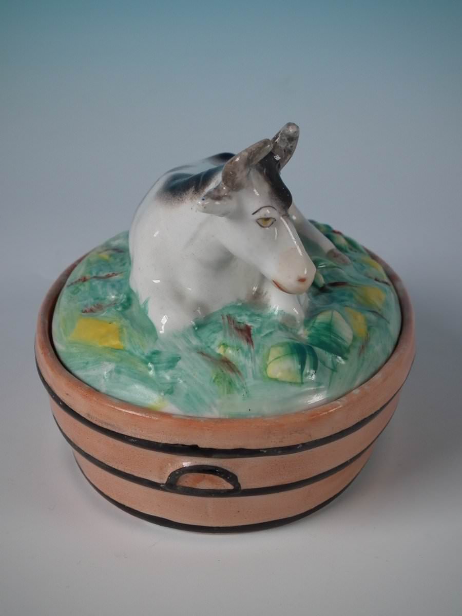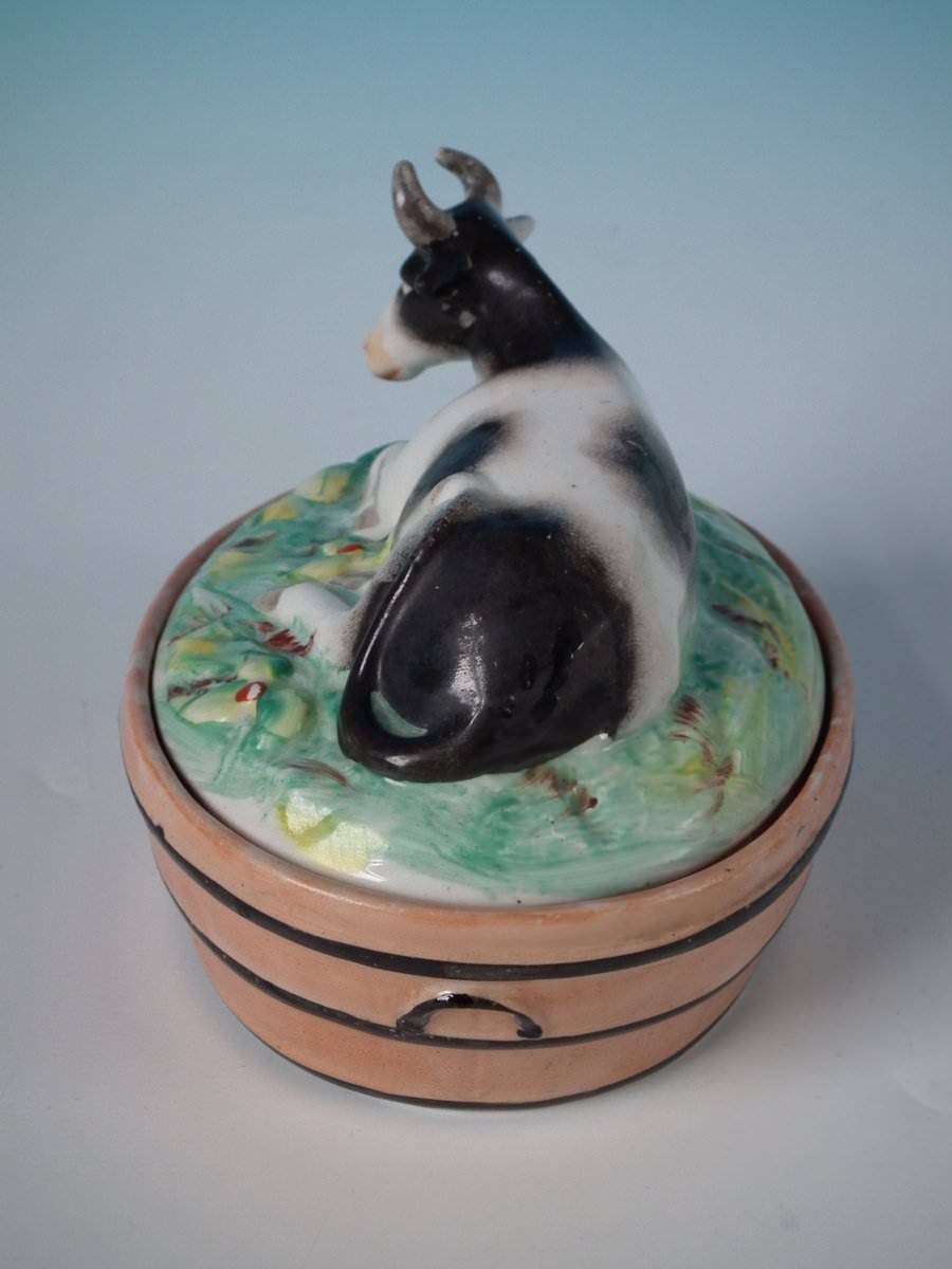 Victorian, circa 1870. 4.3ins high, 5.7ins wide, 4.3ins depth. Staffordshire Pottery butter dish with a pastoral theme which features a cow on the lid, resting on an oval milk churn-like dish base.
