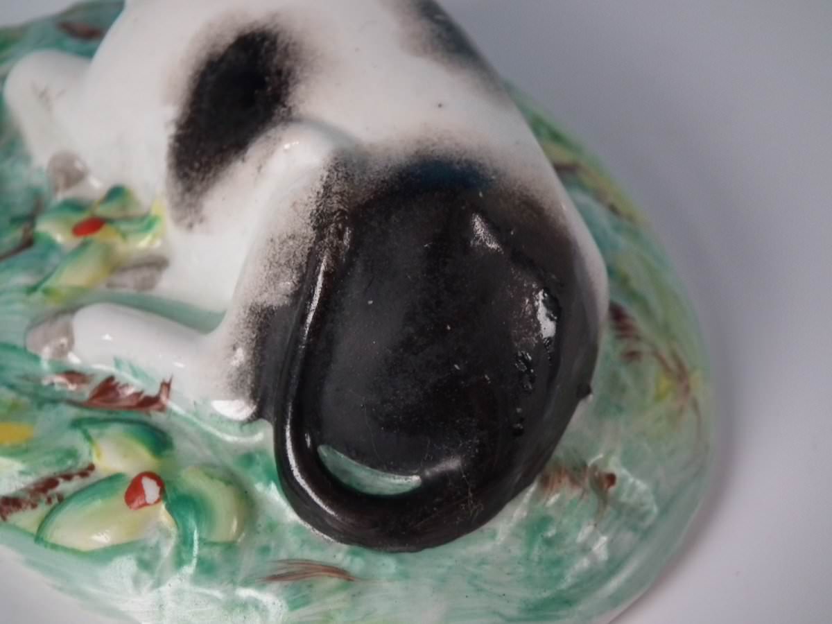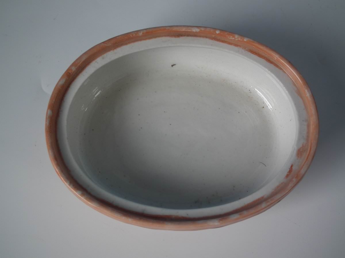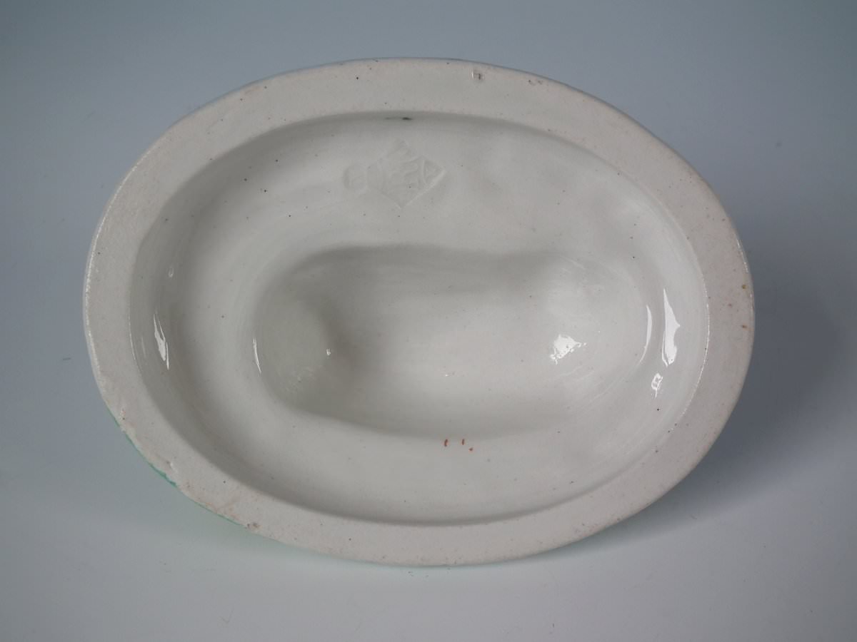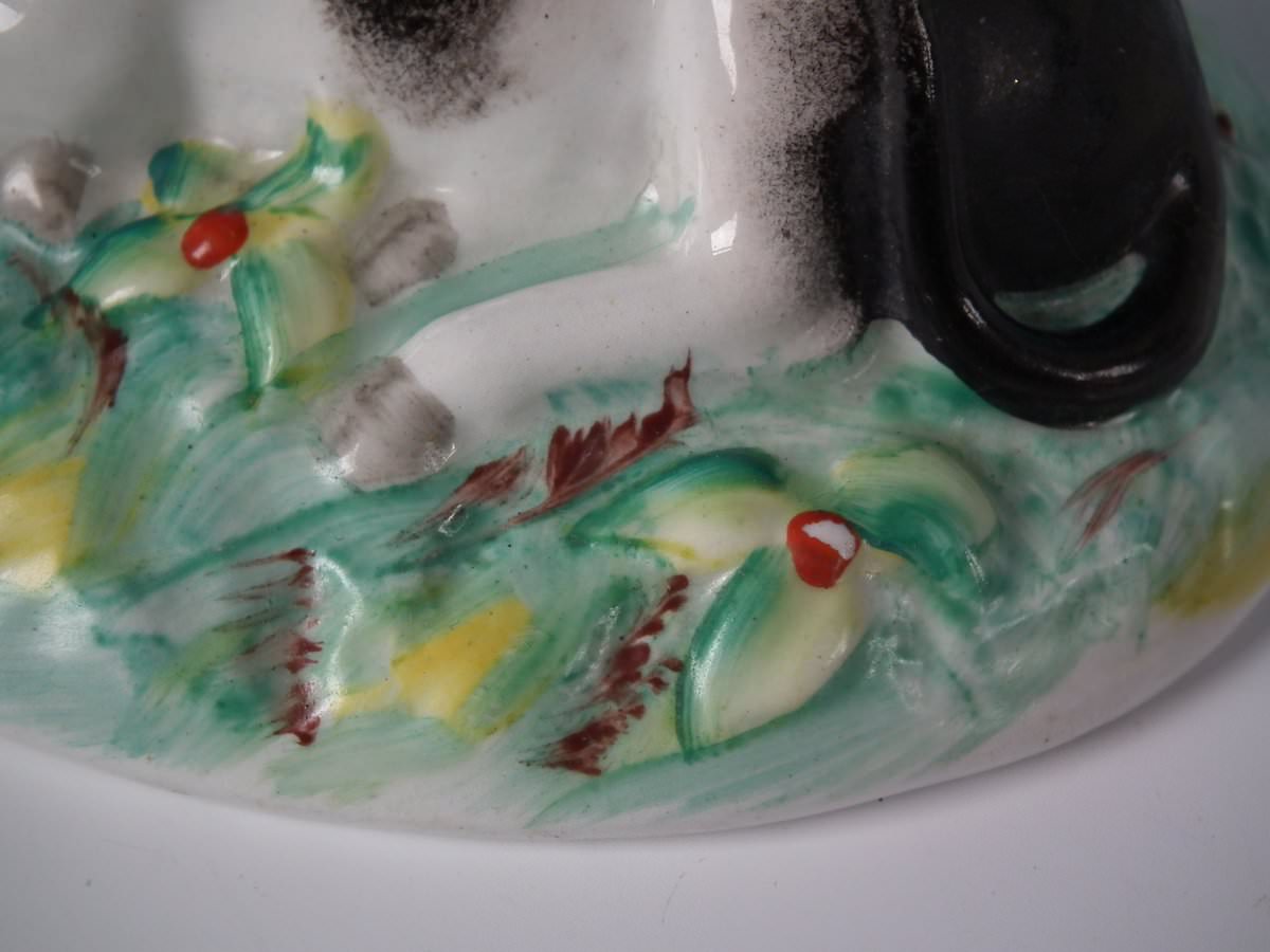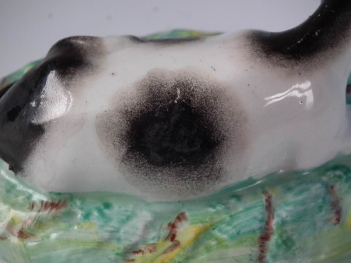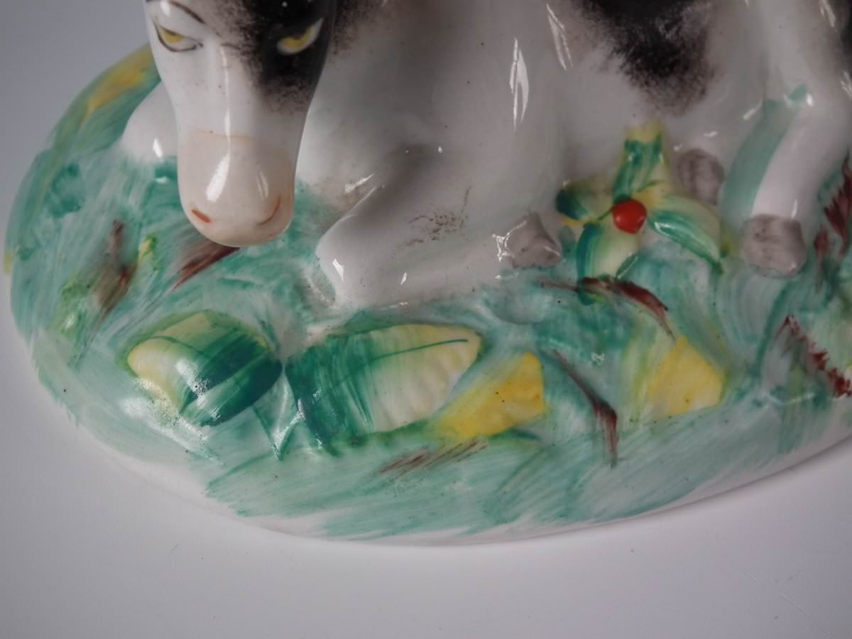 Victorian, circa 1870. 4.3ins high, 5.7ins wide, 4.3ins depth. Staffordshire Pottery butter dish with a pastoral theme which features a cow on the lid, resting on an oval milk churn-like dish base.