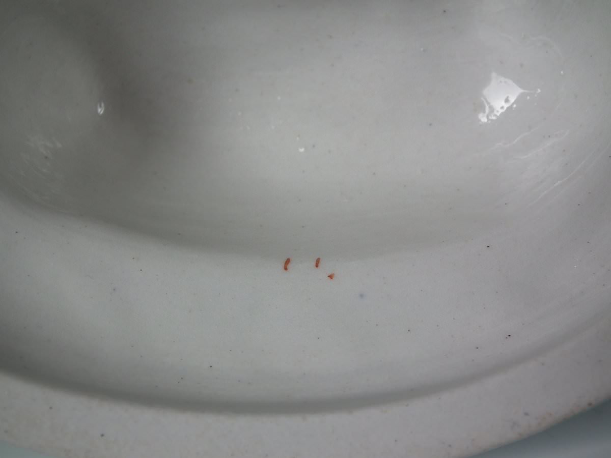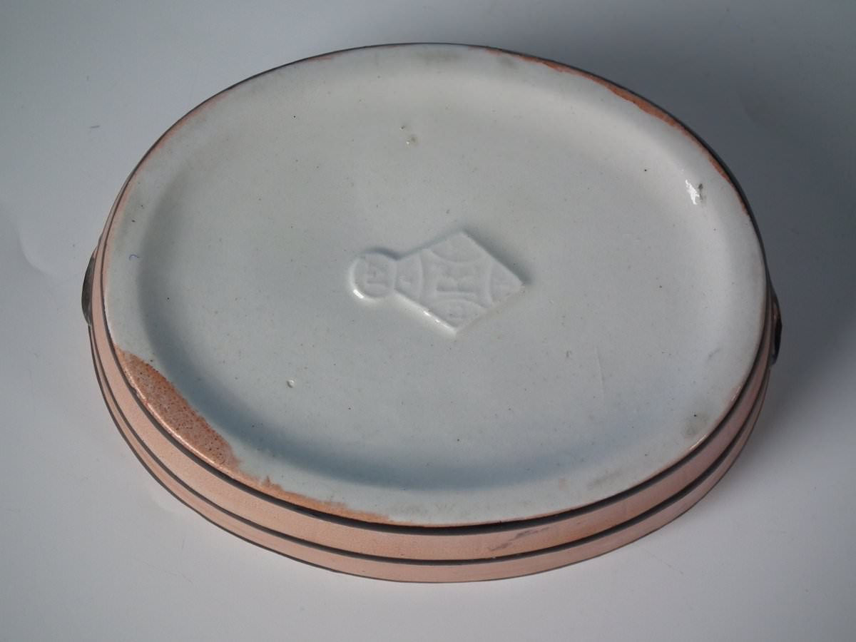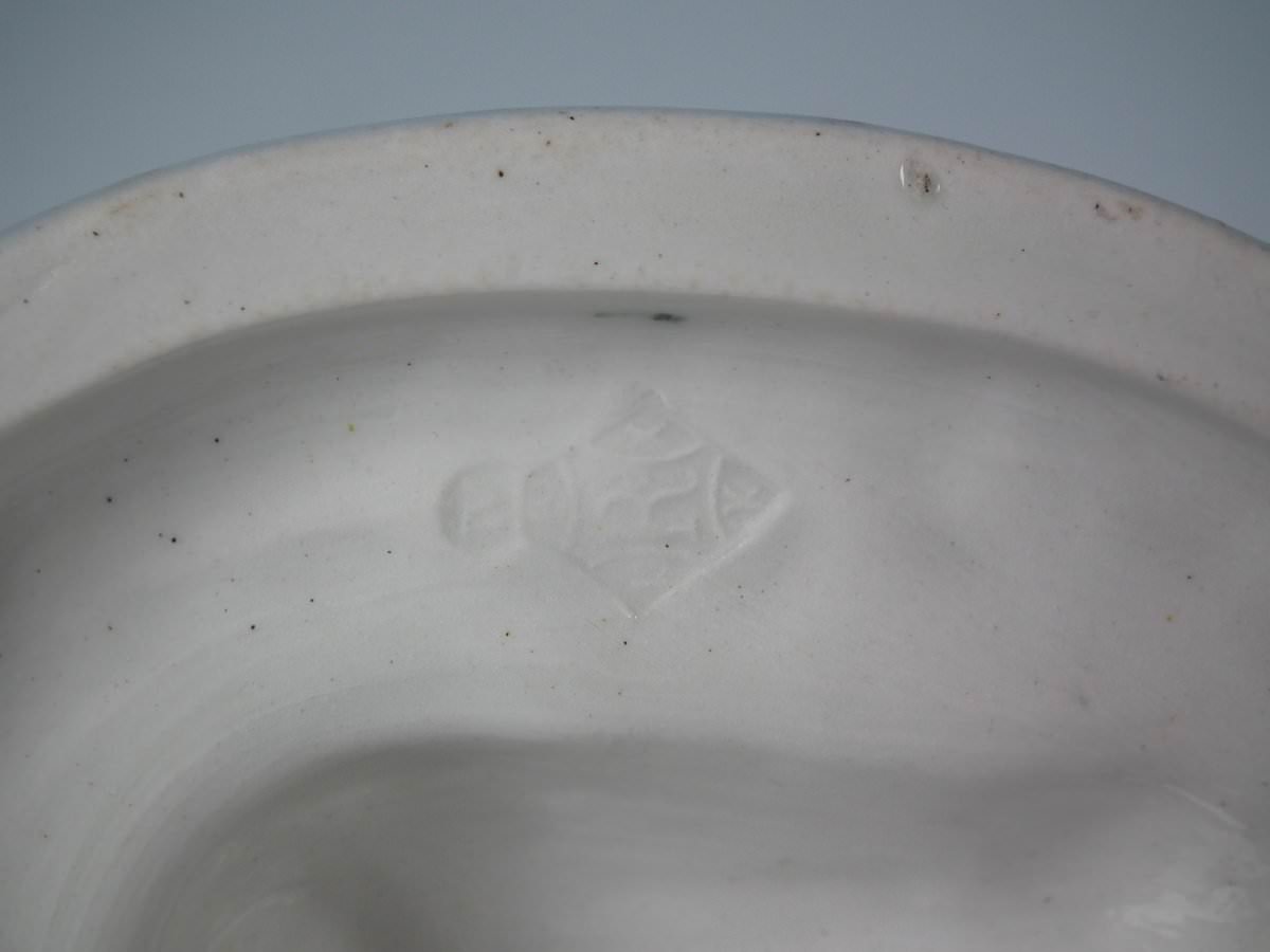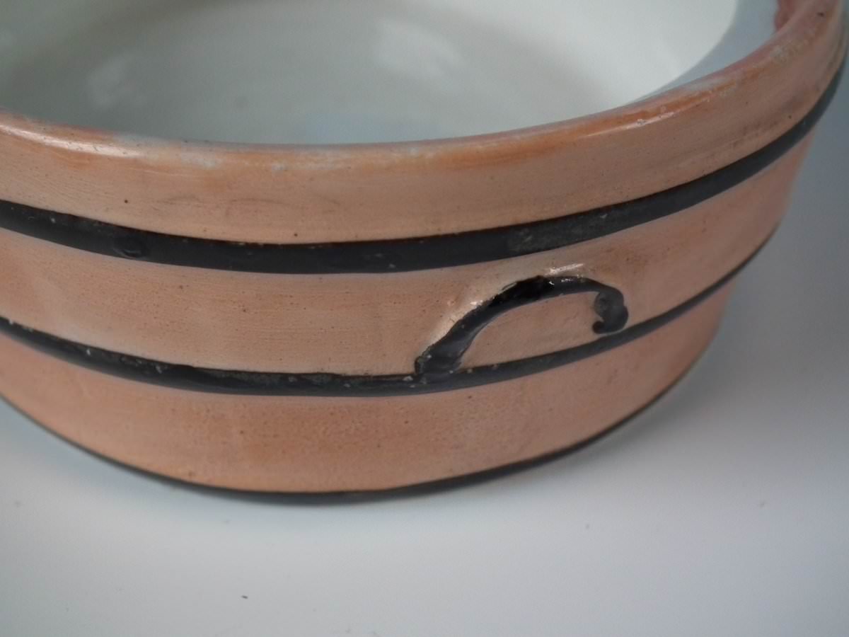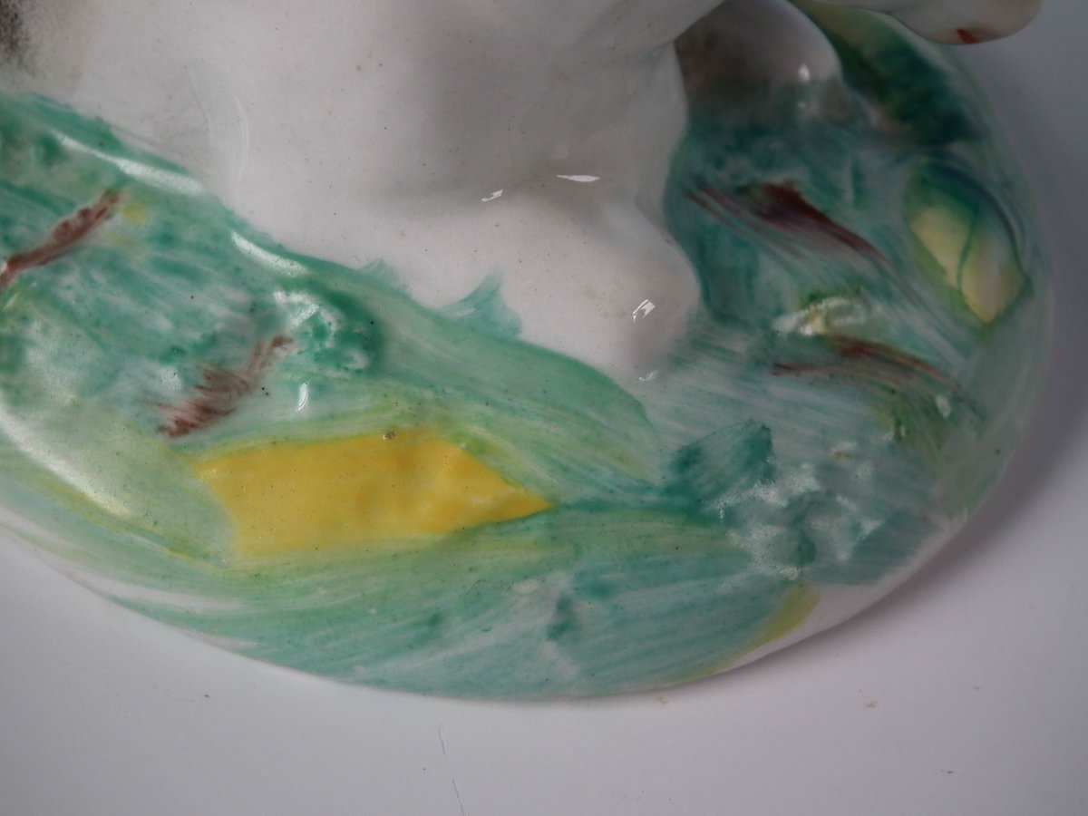 Victorian, circa 1870. 4.3ins high, 5.7ins wide, 4.3ins depth. Staffordshire Pottery butter dish with a pastoral theme which features a cow on the lid, resting on an oval milk churn-like dish base.