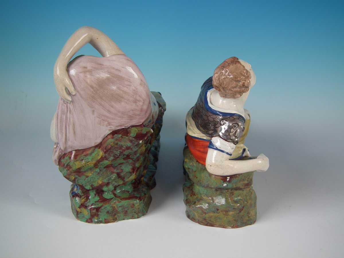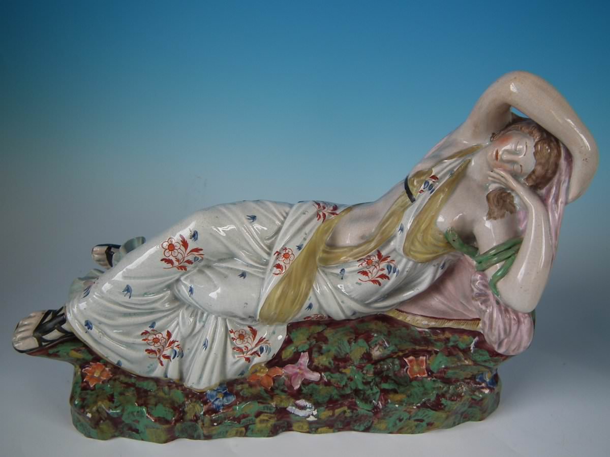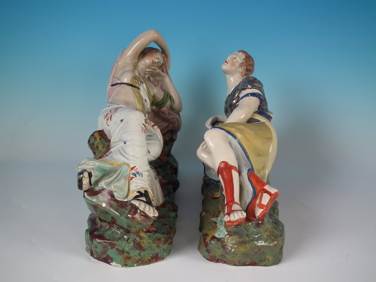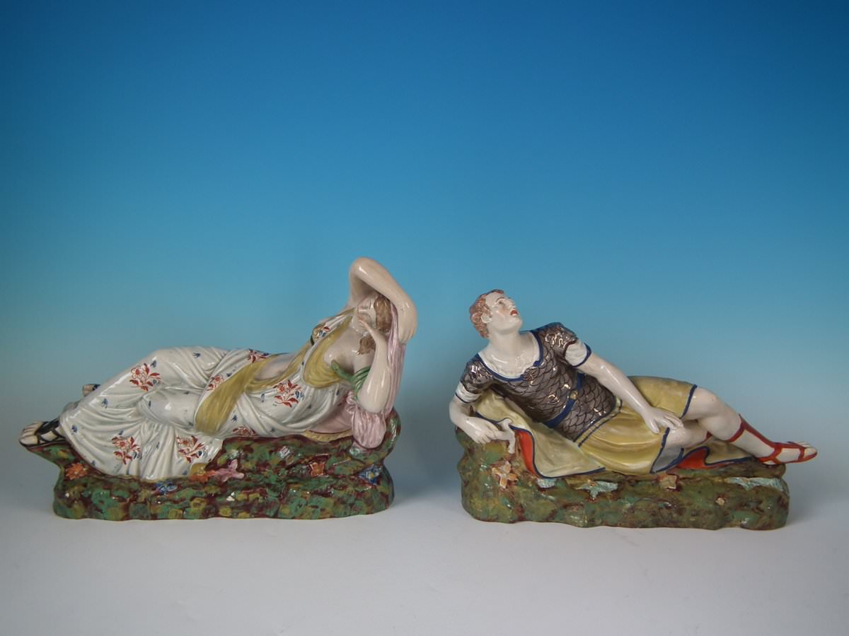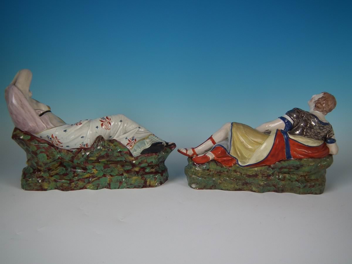pre-Victorian, circa 1820. Tallest is 9.1ins high, 13ins wide, 4.3ins depth. Pair of Staffordshire Pottery pearlware figures with a theatrical and literary theme which feature Mark Antony and Cleopatra, recumbent on a shaped base.