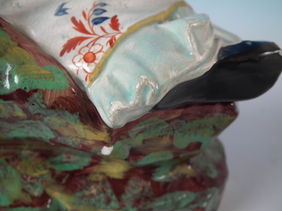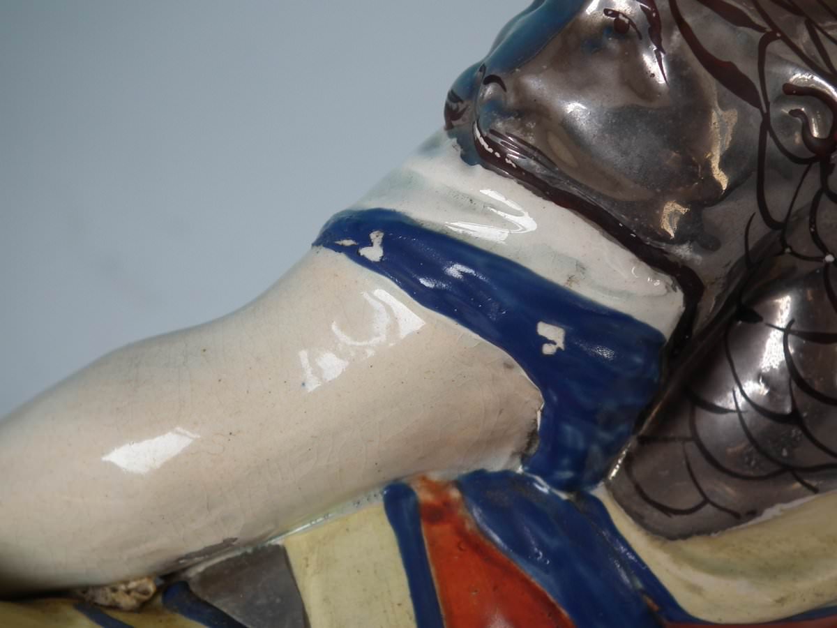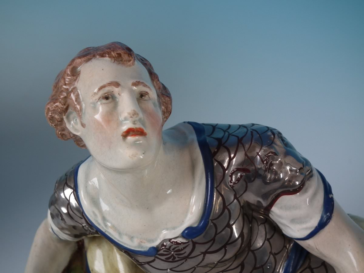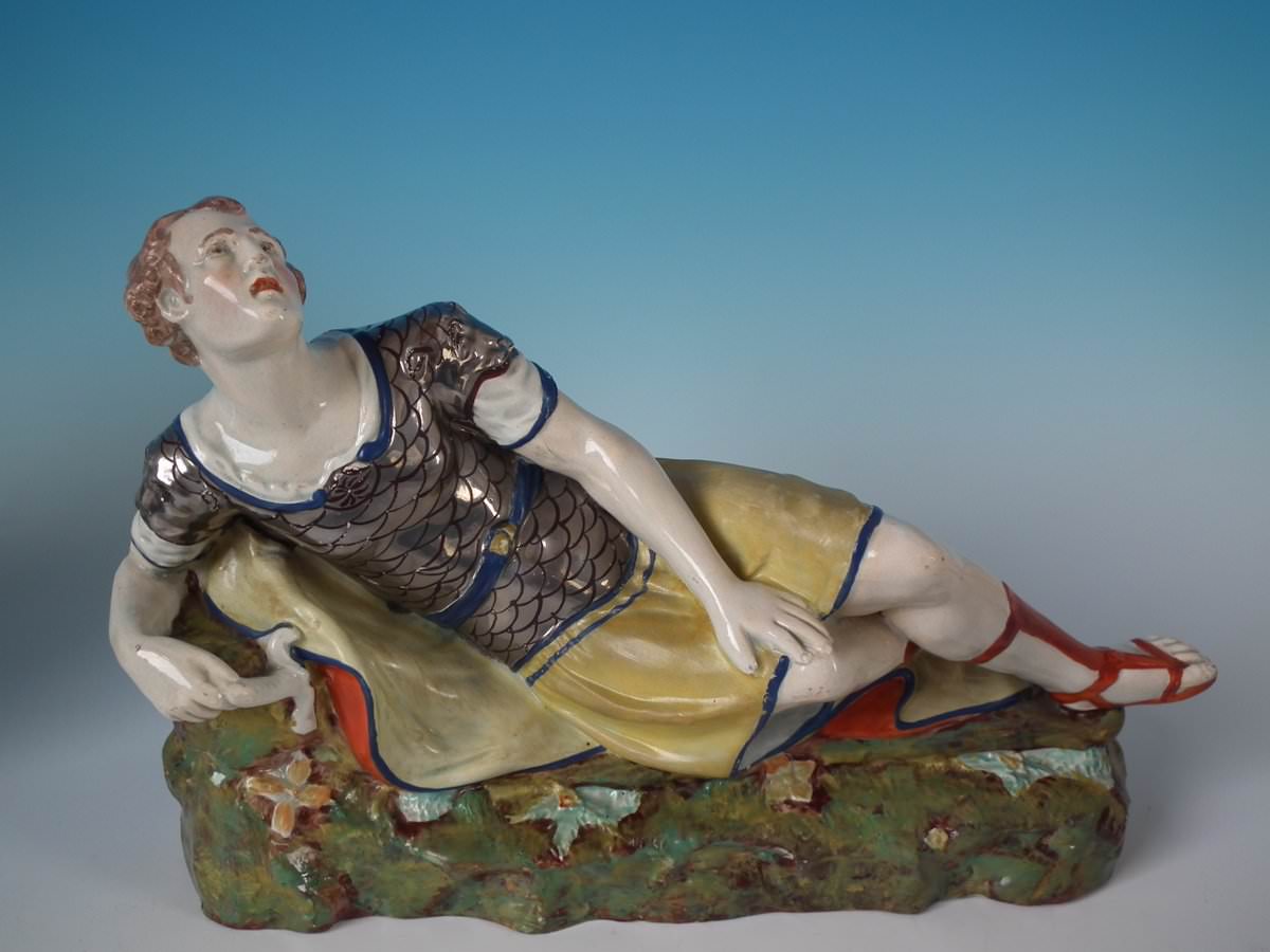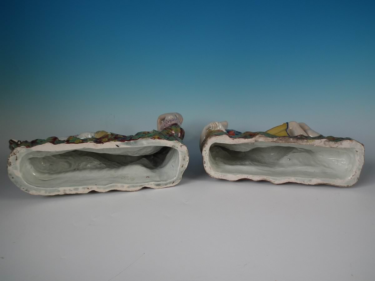 pre-Victorian, circa 1820. Tallest is 9.1ins high, 13ins wide, 4.3ins depth. Pair of Staffordshire Pottery pearlware figures with a theatrical and literary theme which feature Mark Antony and Cleopatra, recumbent on a shaped base.