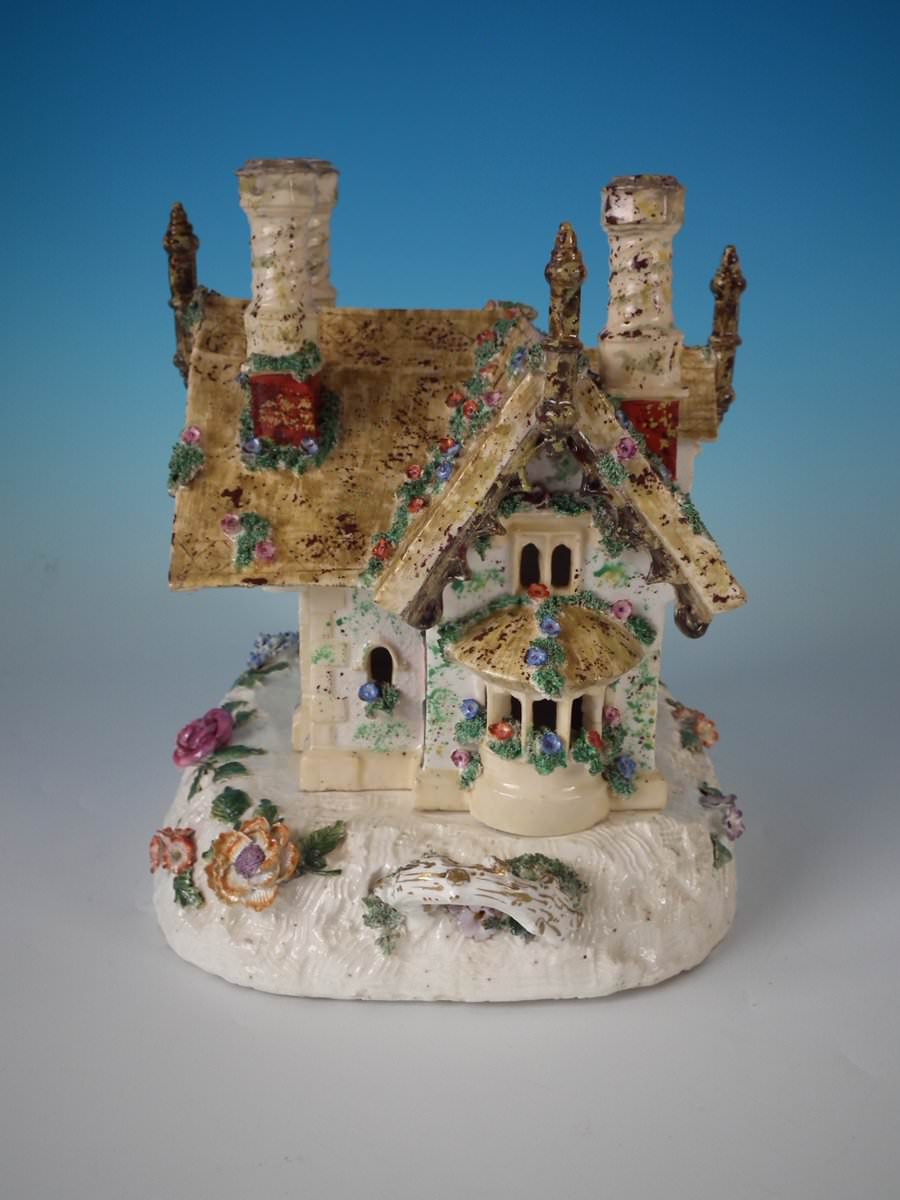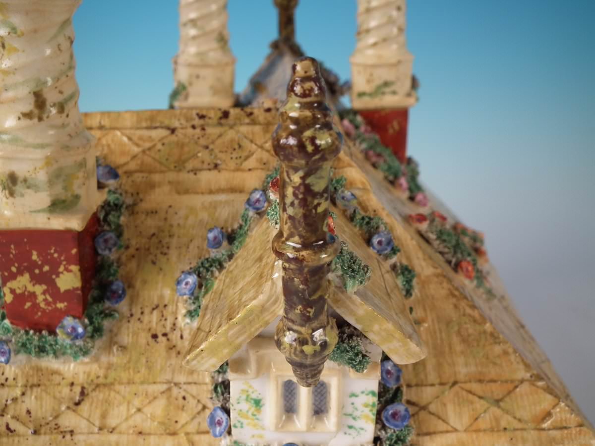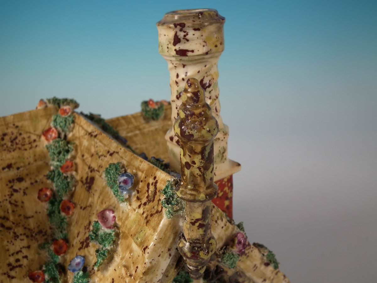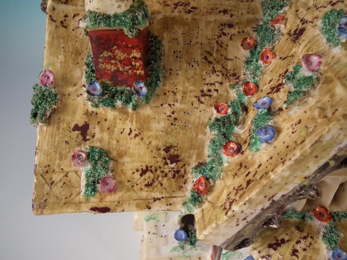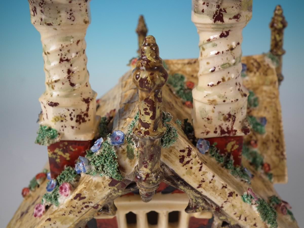 Victorian, circa 1850. 8.7ins high, 11.4ins wide, 9.1ins depth. Staffordshire Pottery potpourri holder which features a large, ornate country cottage/house, stood on a shaped base.