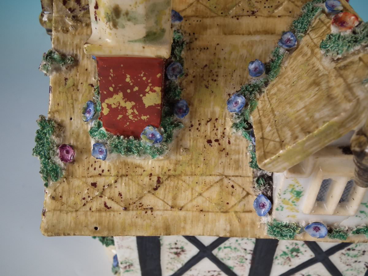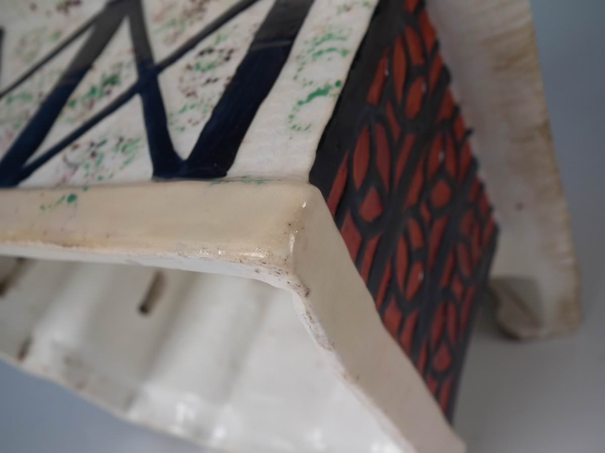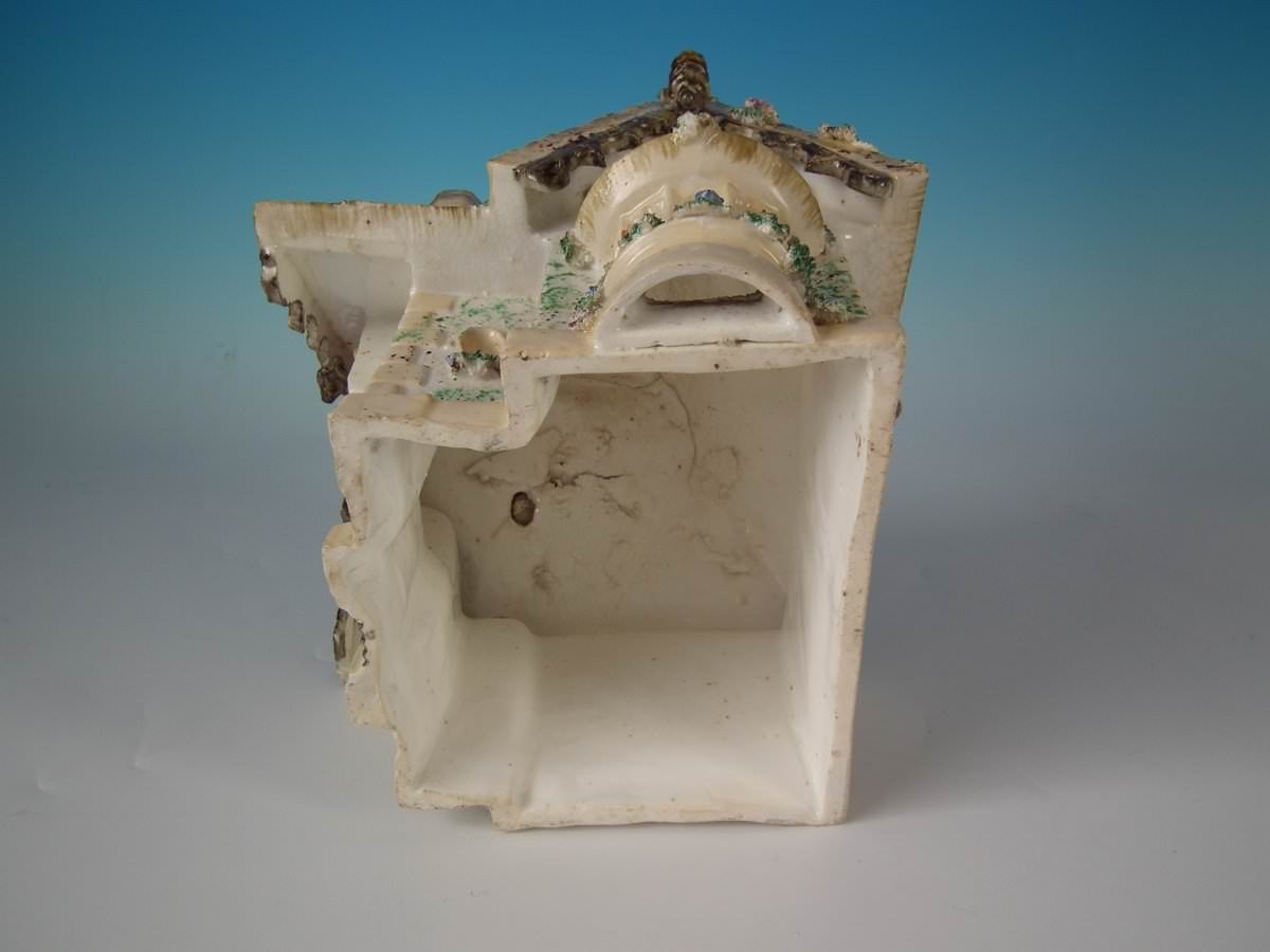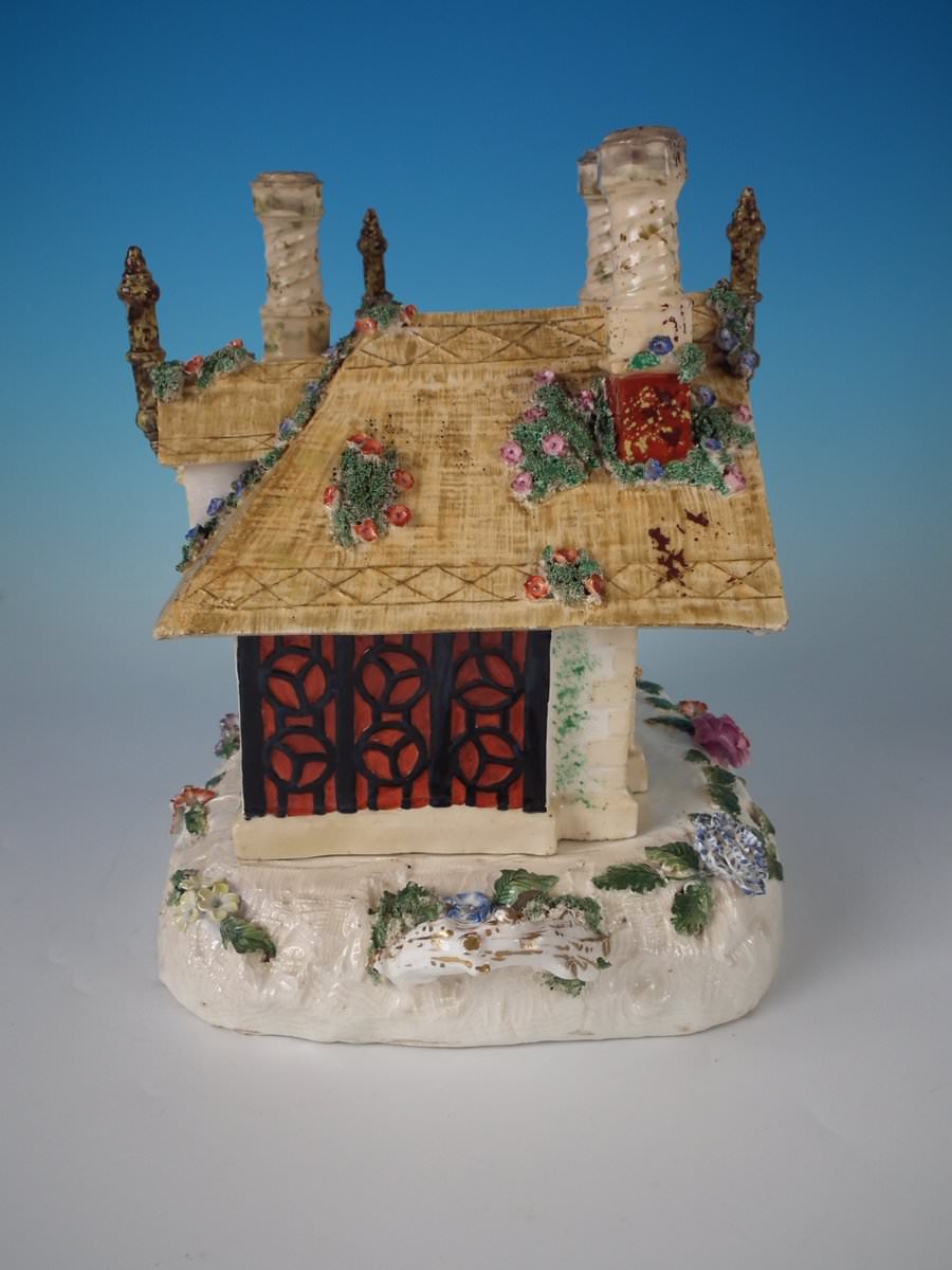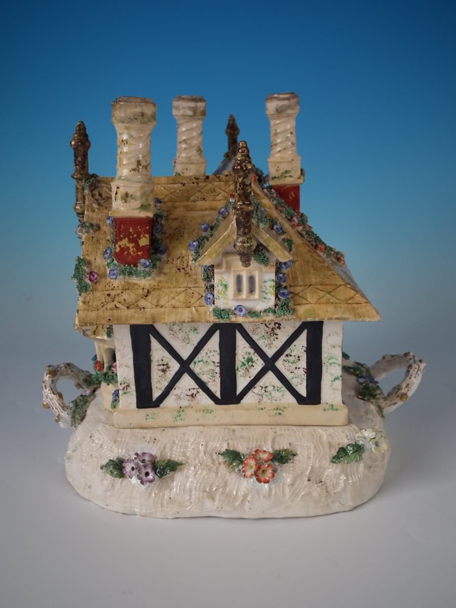 Victorian, circa 1850. 8.7ins high, 11.4ins wide, 9.1ins depth. Staffordshire Pottery potpourri holder which features a large, ornate country cottage/house, stood on a shaped base.