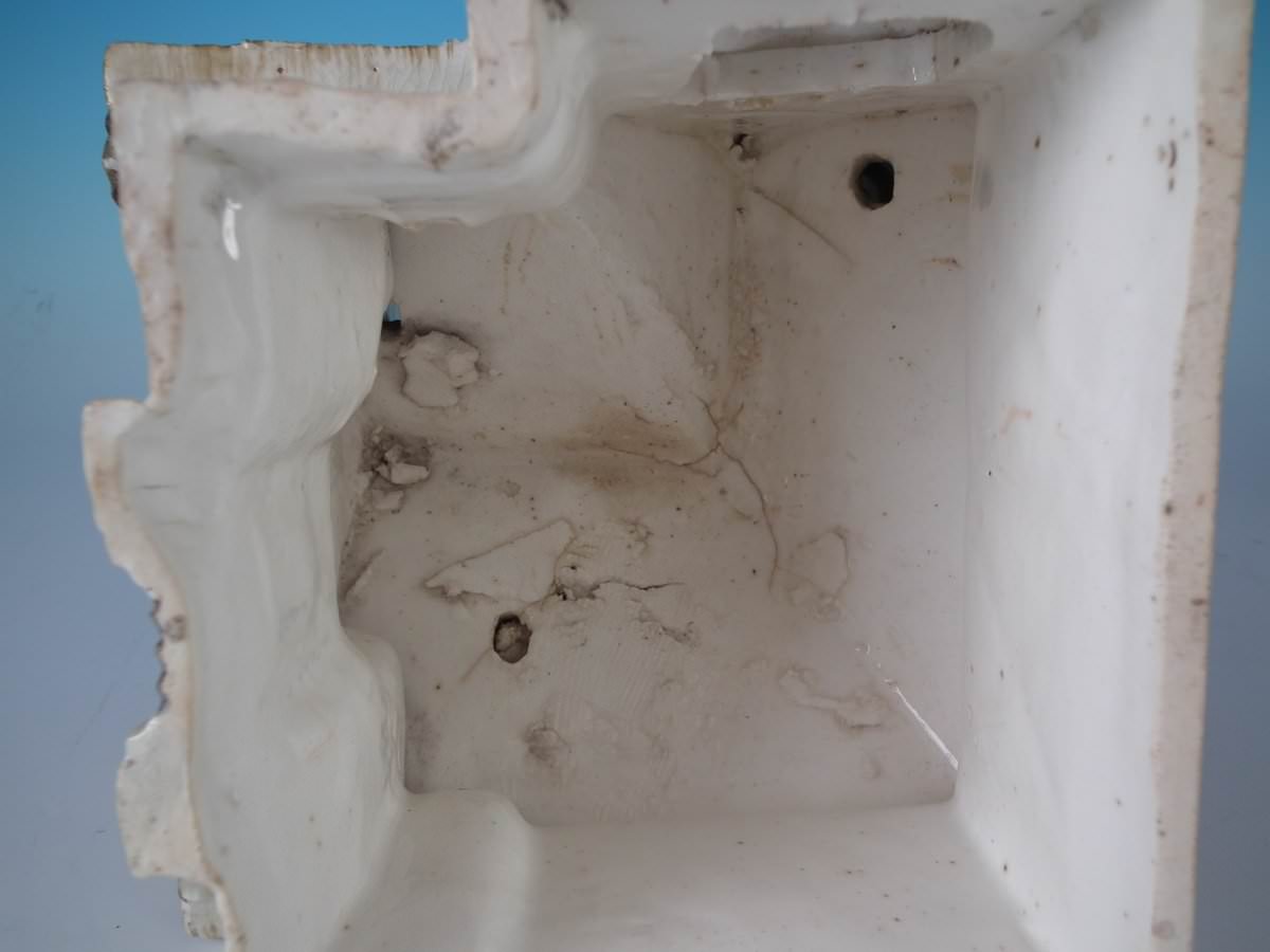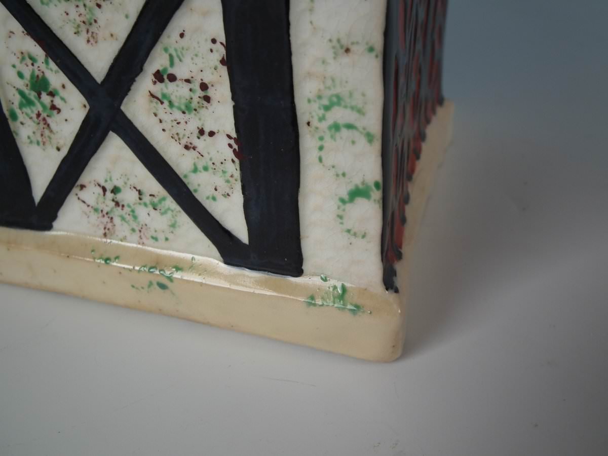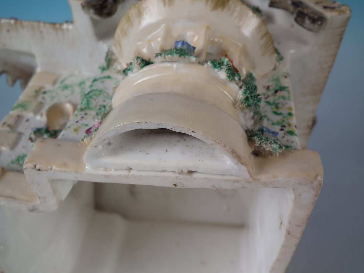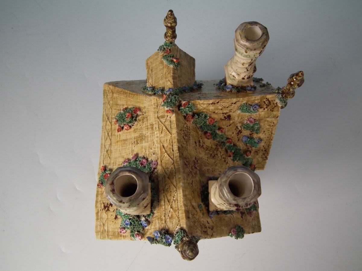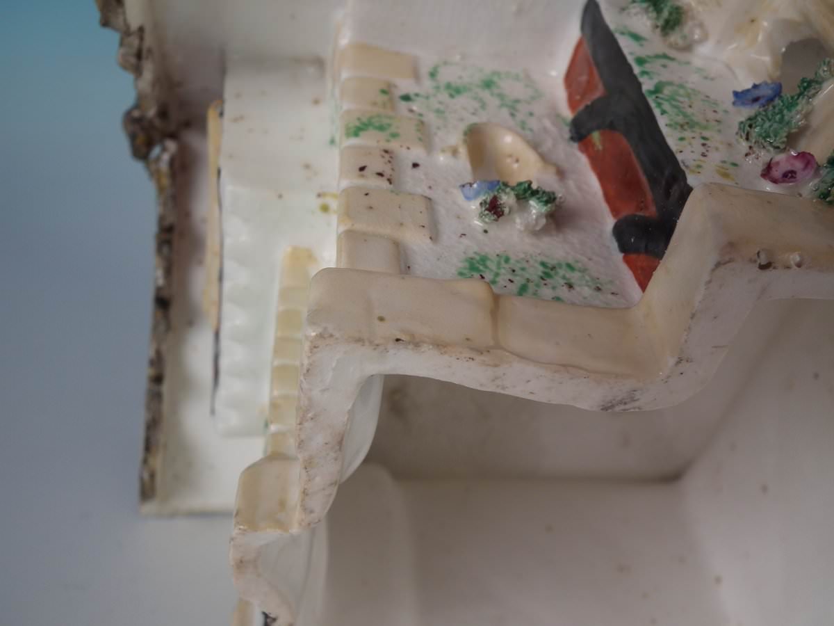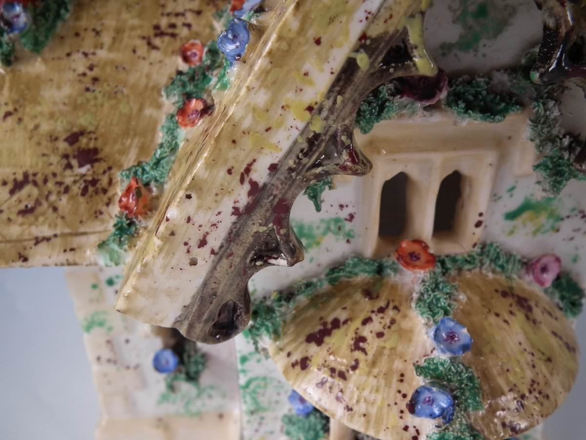 Victorian, circa 1850. 8.7ins high, 11.4ins wide, 9.1ins depth. Staffordshire Pottery potpourri holder which features a large, ornate country cottage/house, stood on a shaped base.