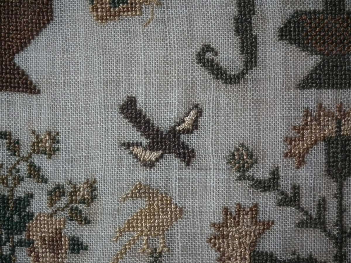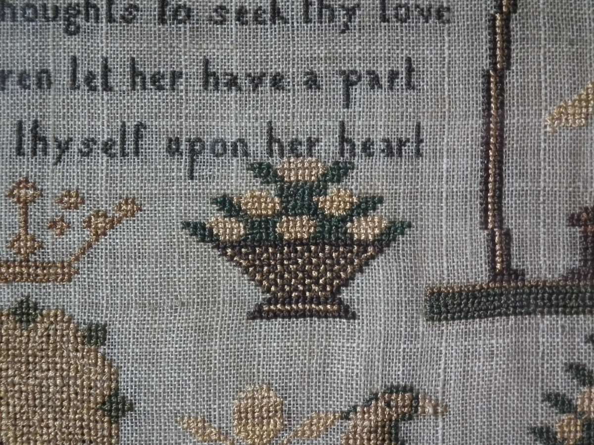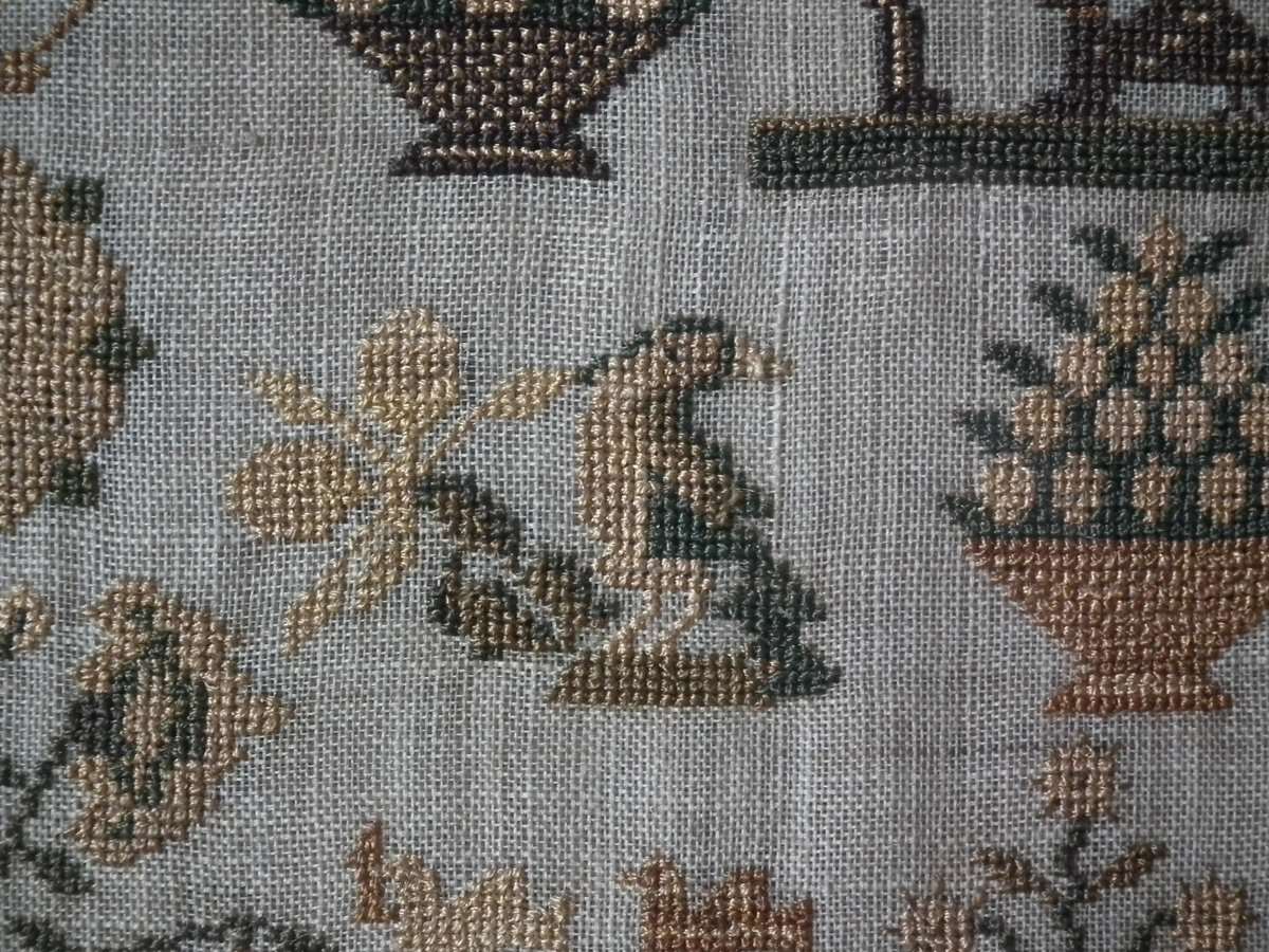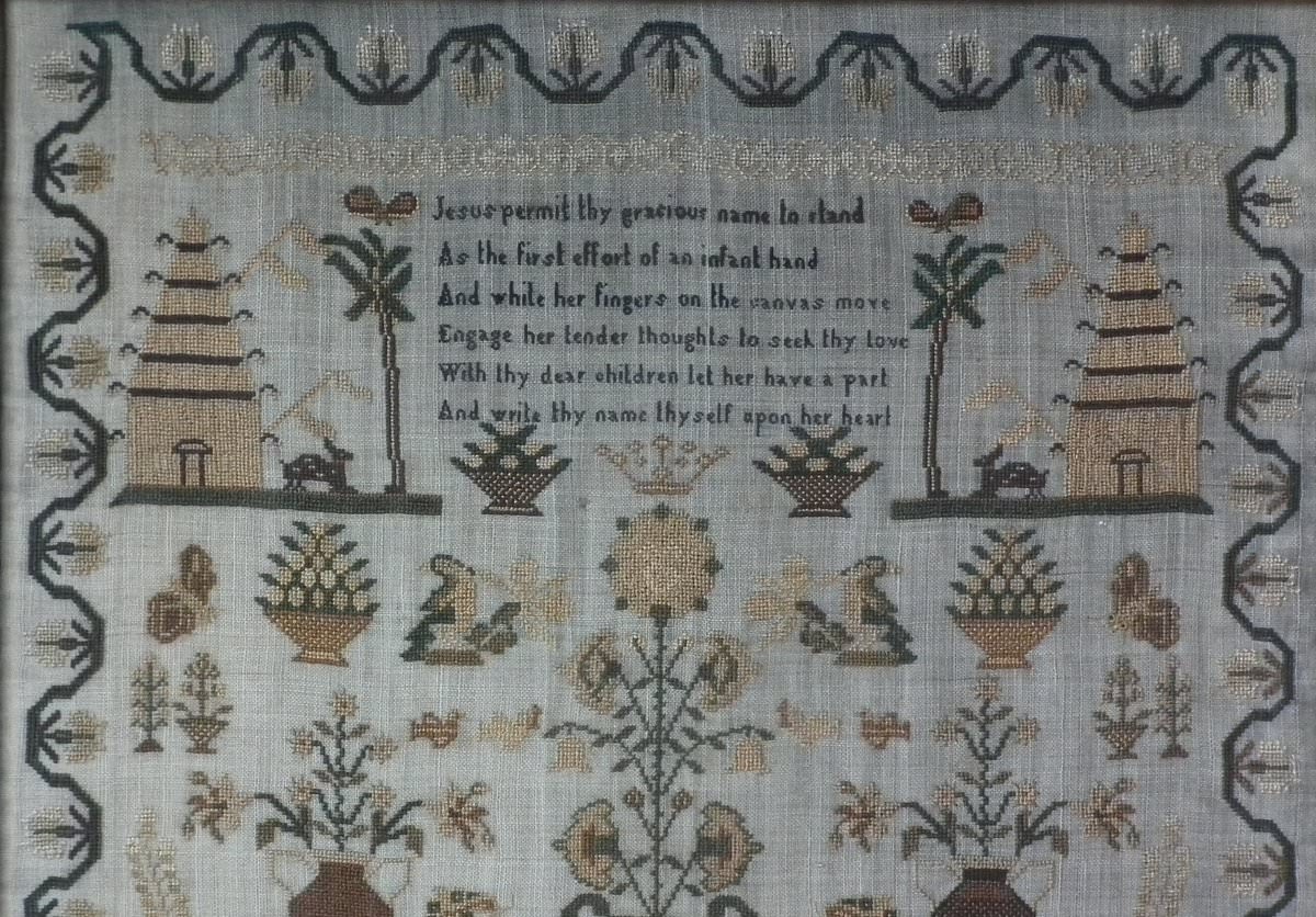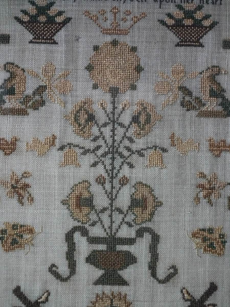 The sampler is worked in silk on linen ground, in cross stitch and Algerian eye.