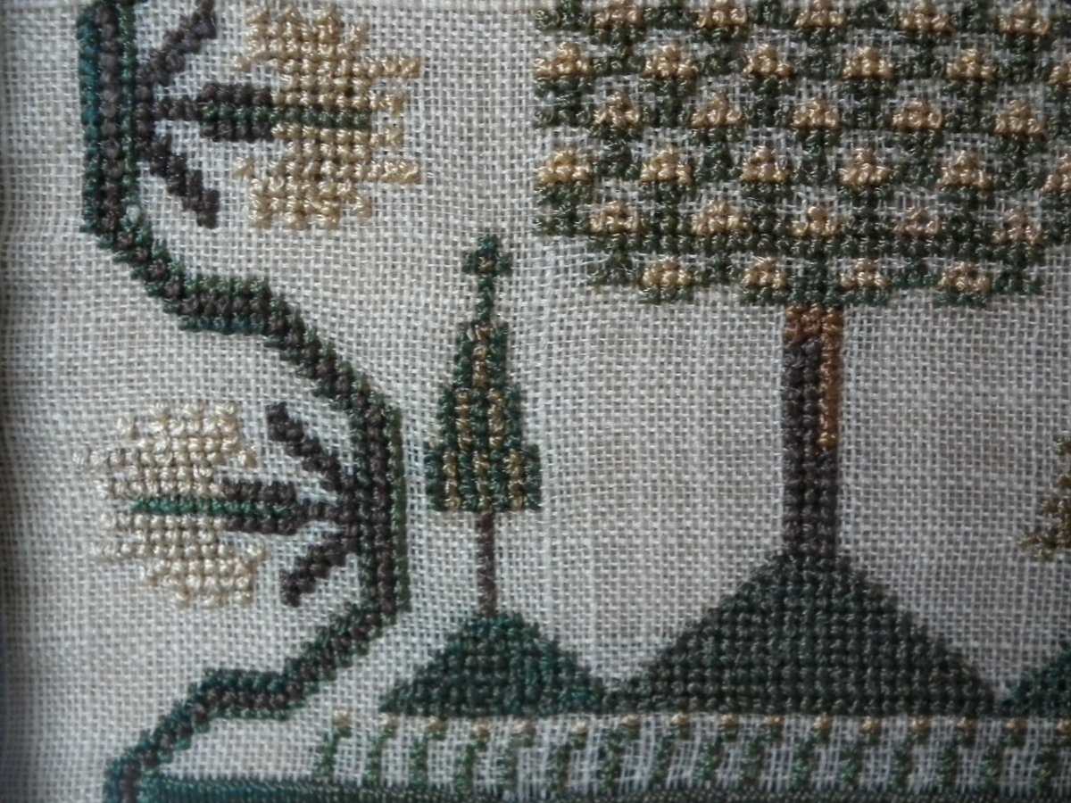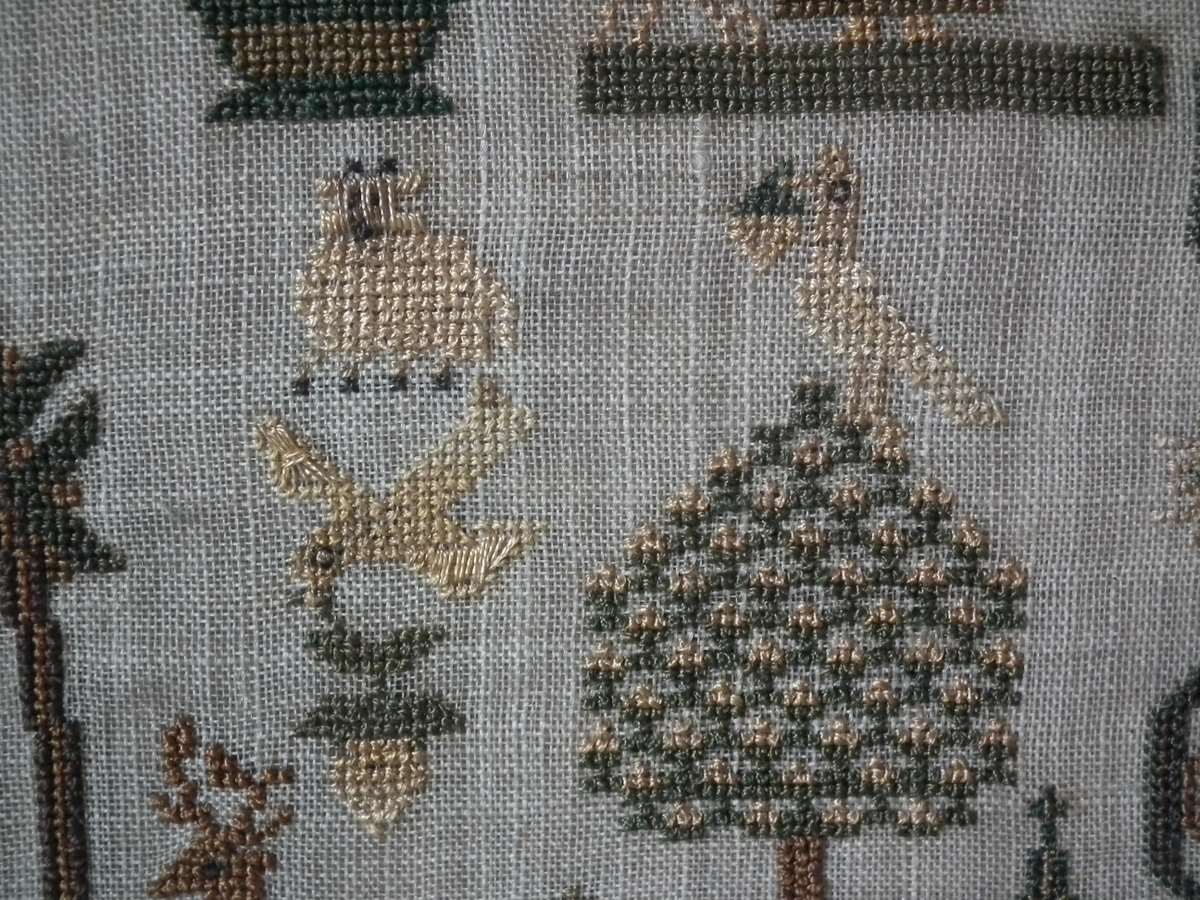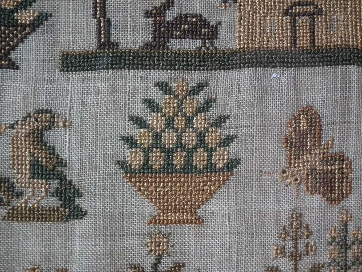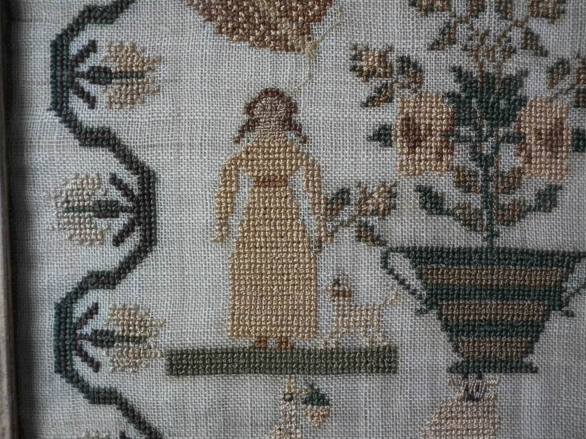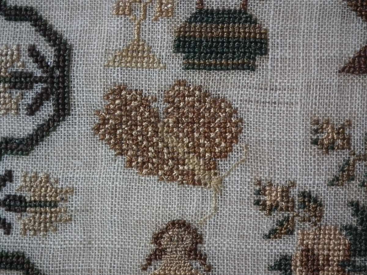 The sampler is worked in silk on linen ground, in cross stitch and Algerian eye.