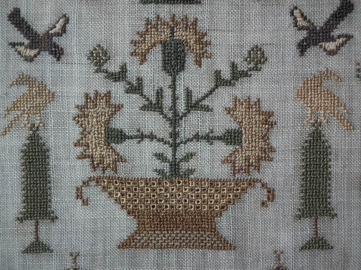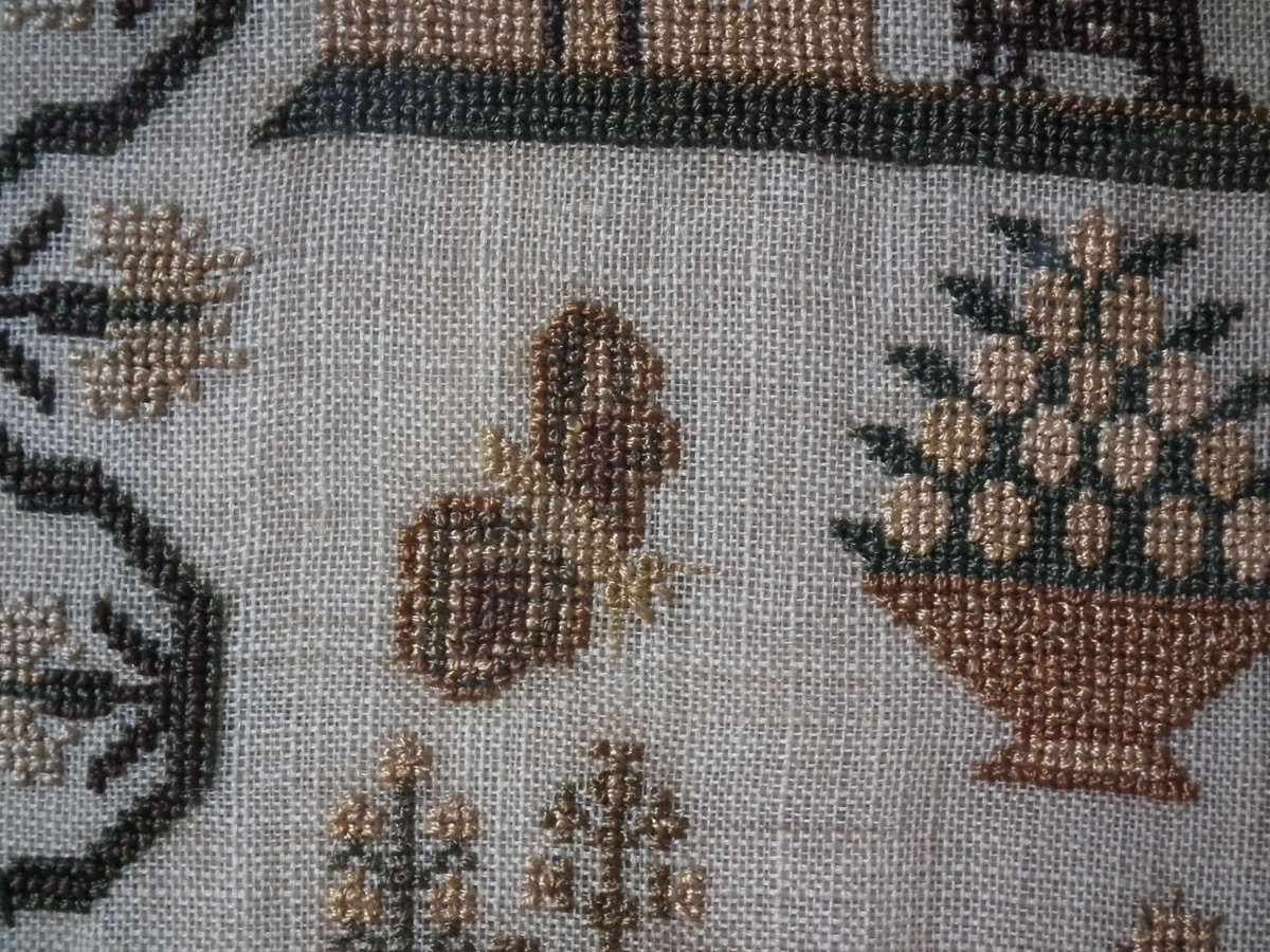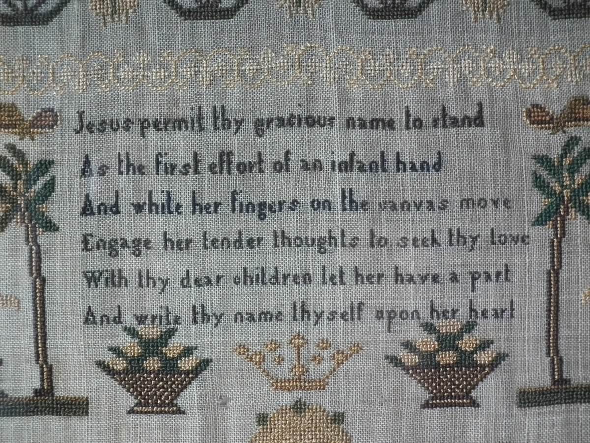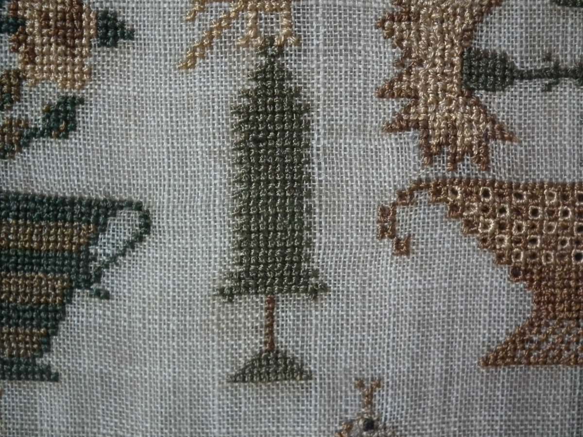 The sampler is worked in silk on linen ground, in cross stitch and Algerian eye.
