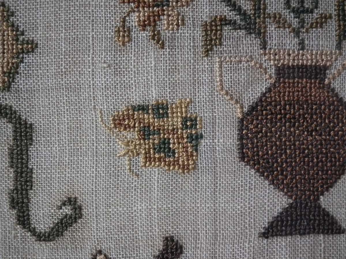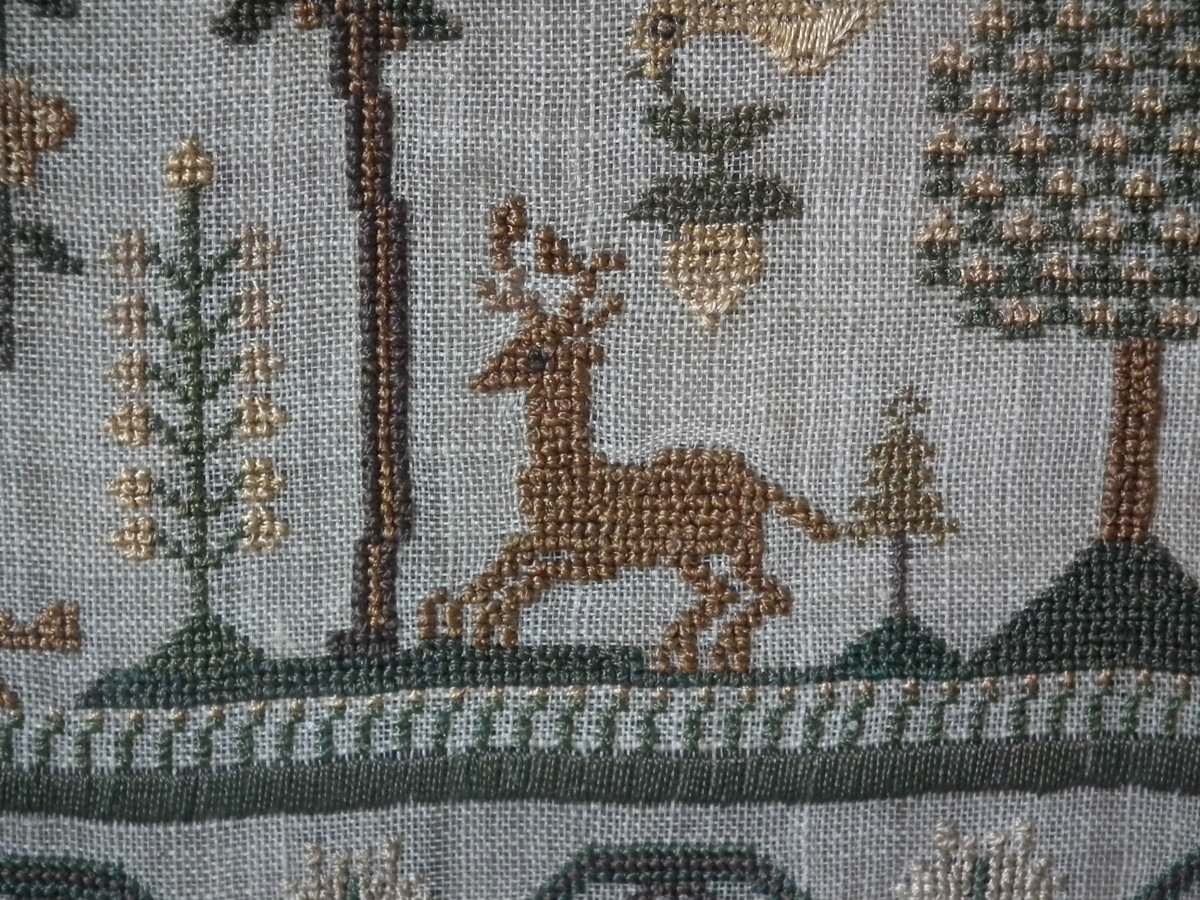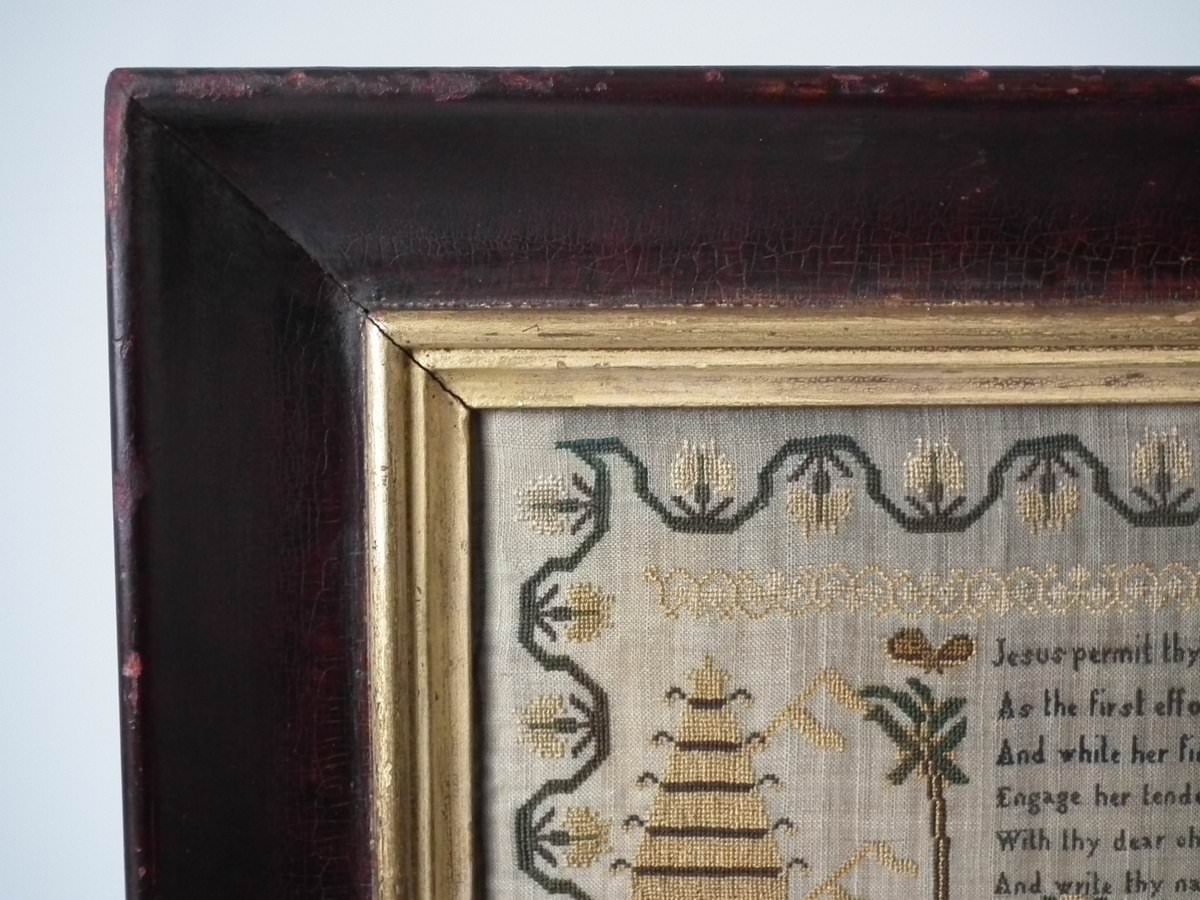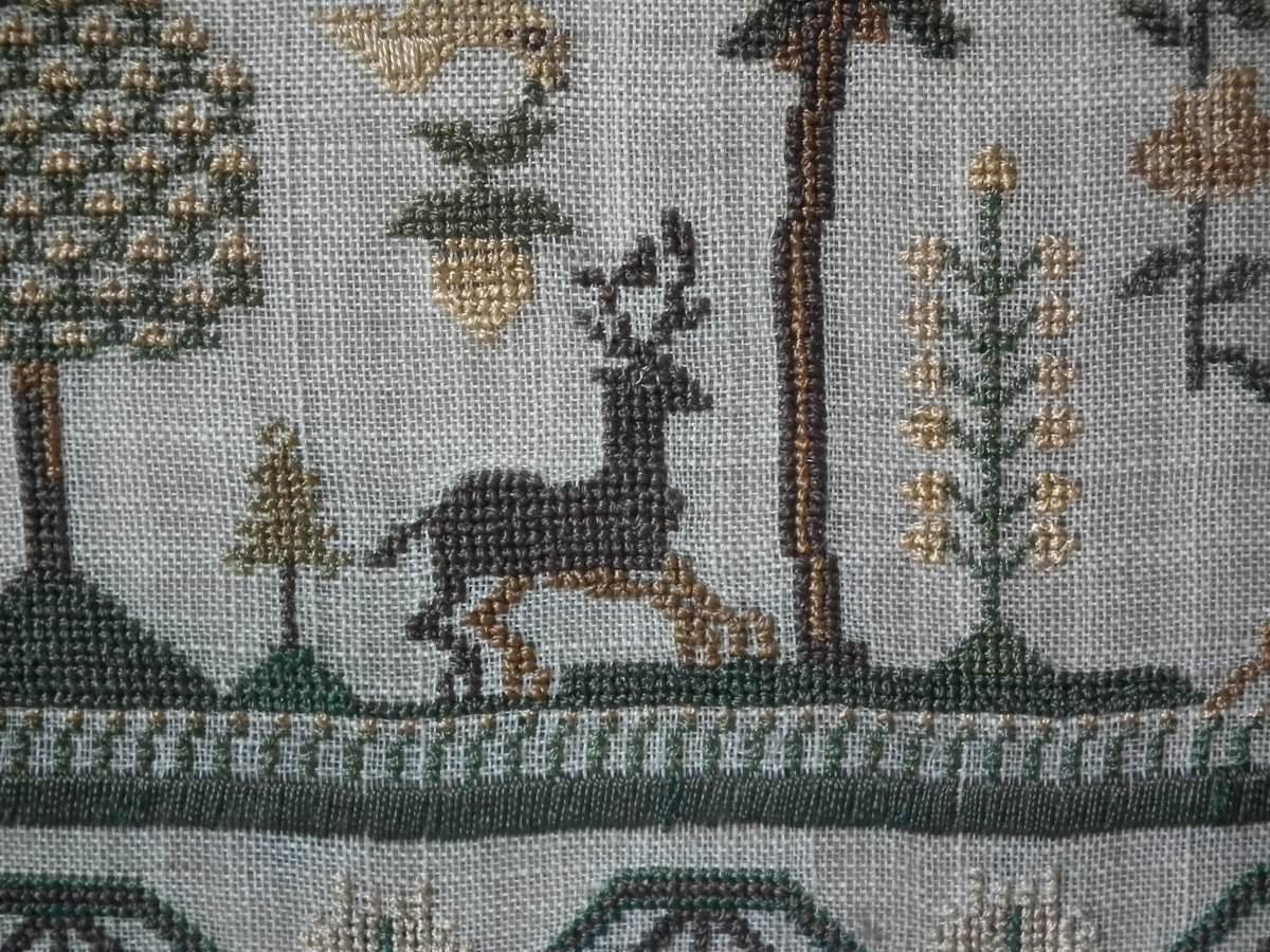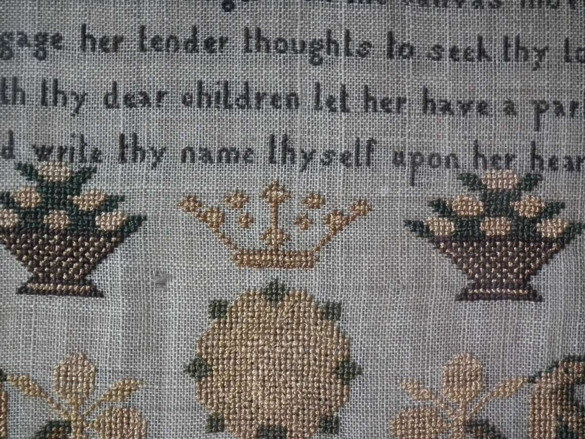 The sampler is worked in silk on linen ground, in cross stitch and Algerian eye.