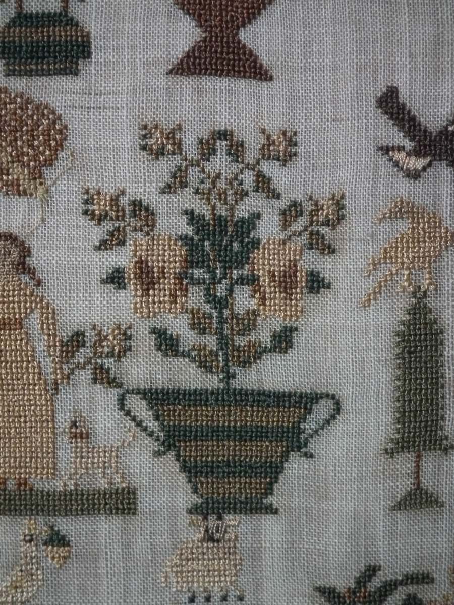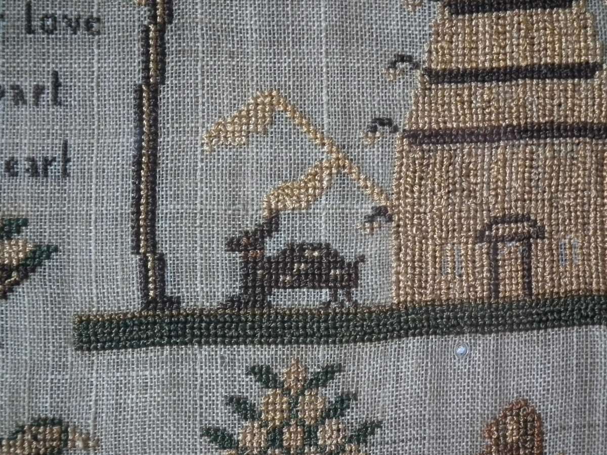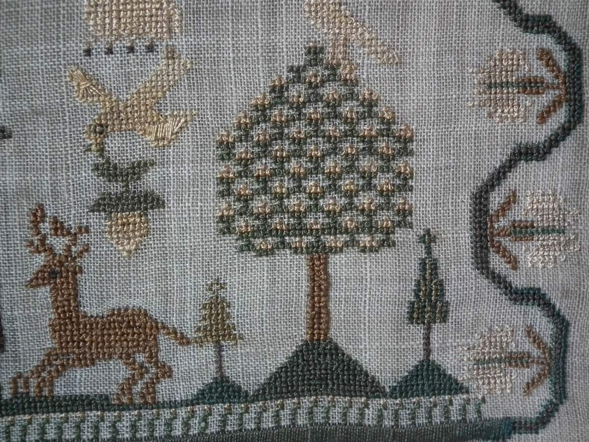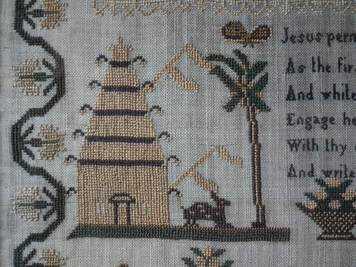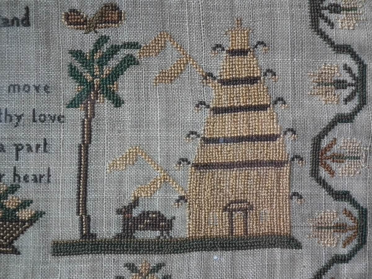 The sampler is worked in silk on linen ground, in cross stitch and Algerian eye.