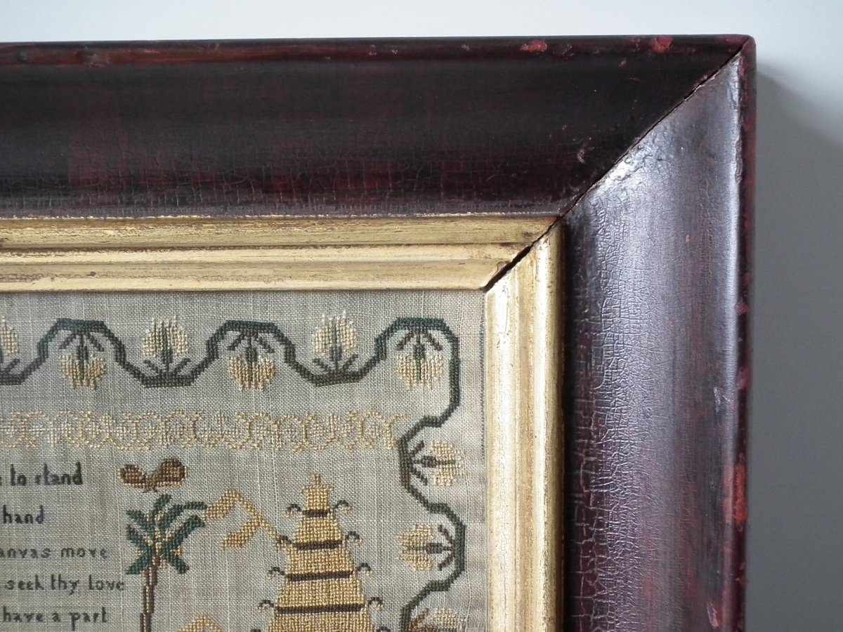 Mounting: The sampler is stitched to linen mount and tacked to a wood stretcher frame. Frame backed with wood.