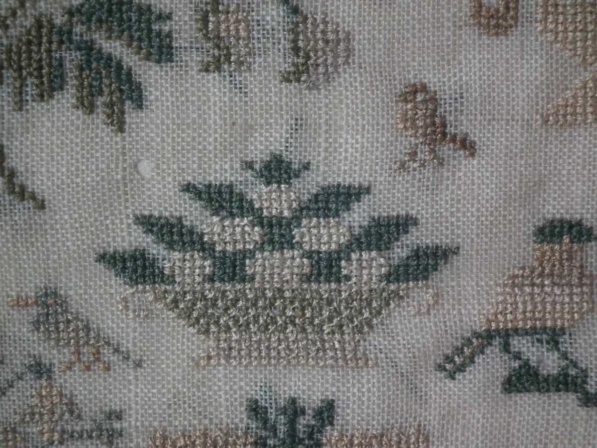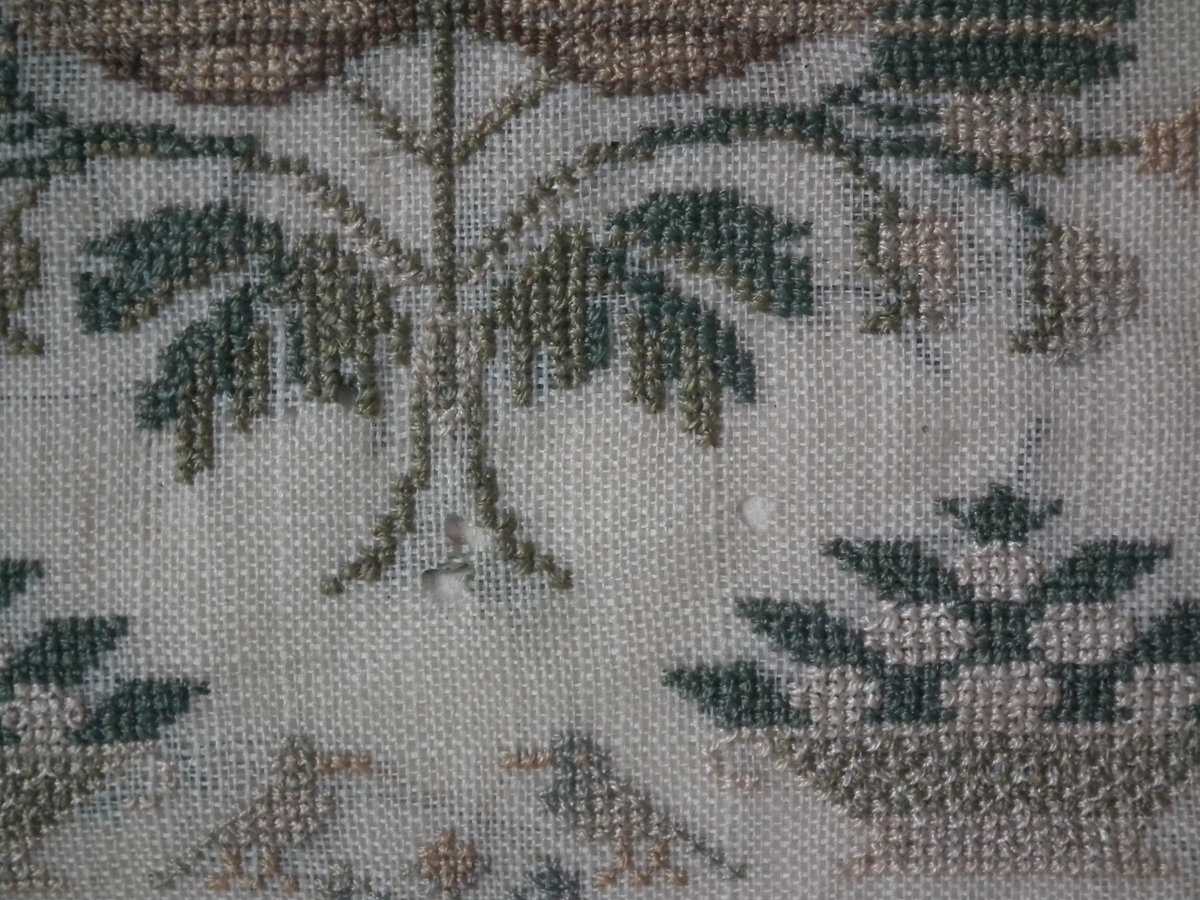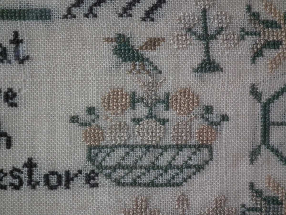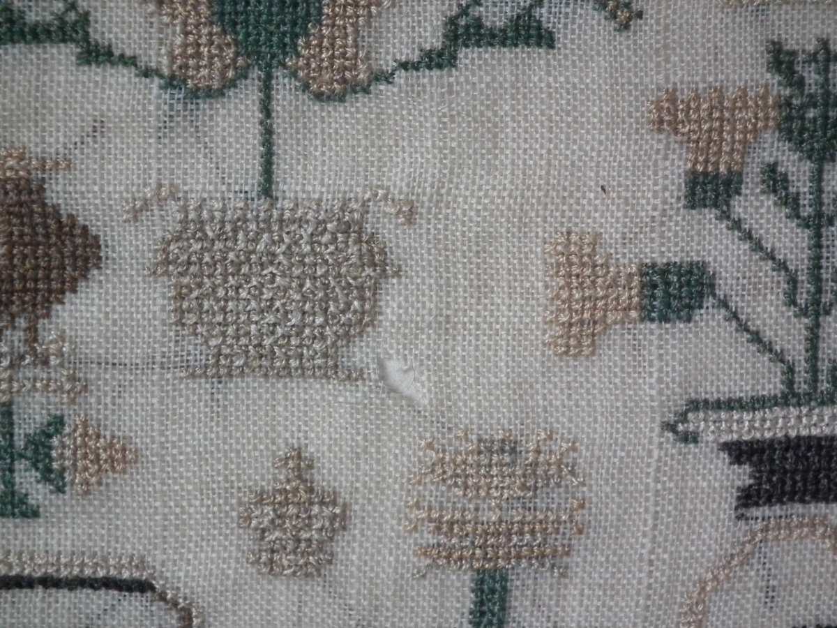 The sampler is worked in silk on linen ground, in cross stitch throughout.