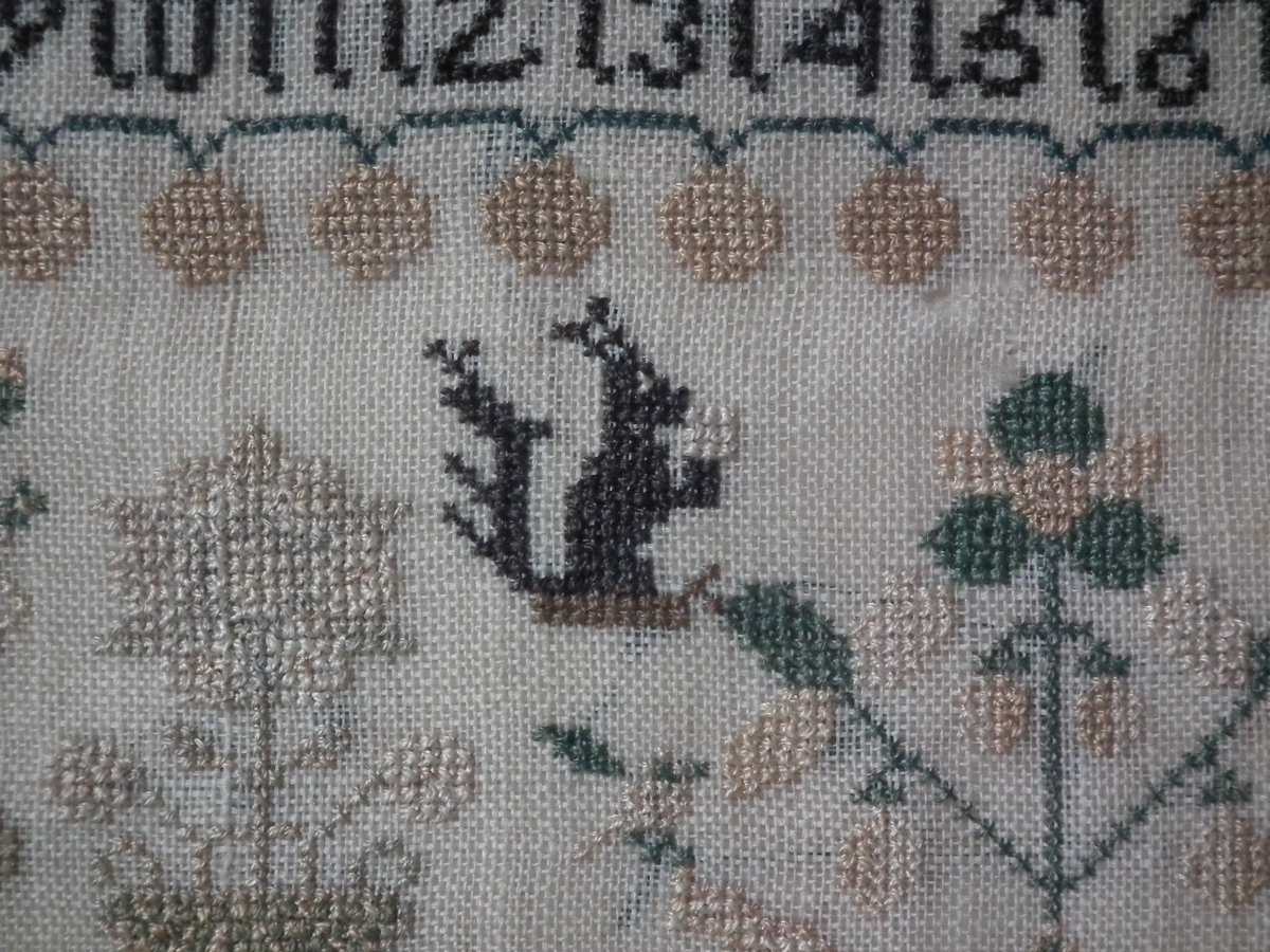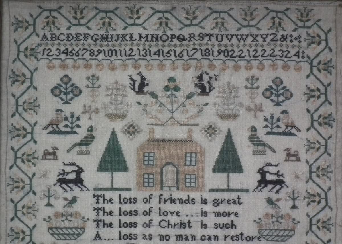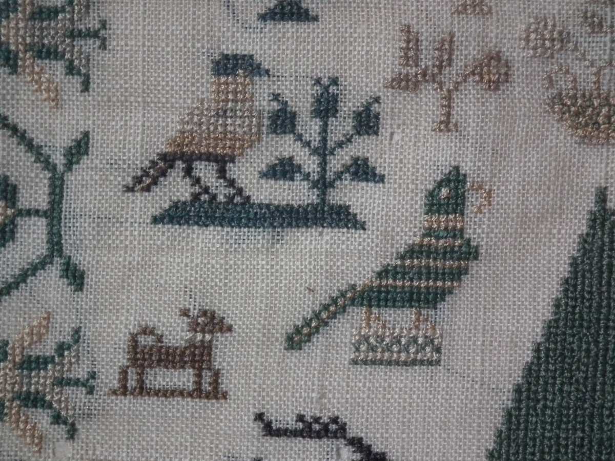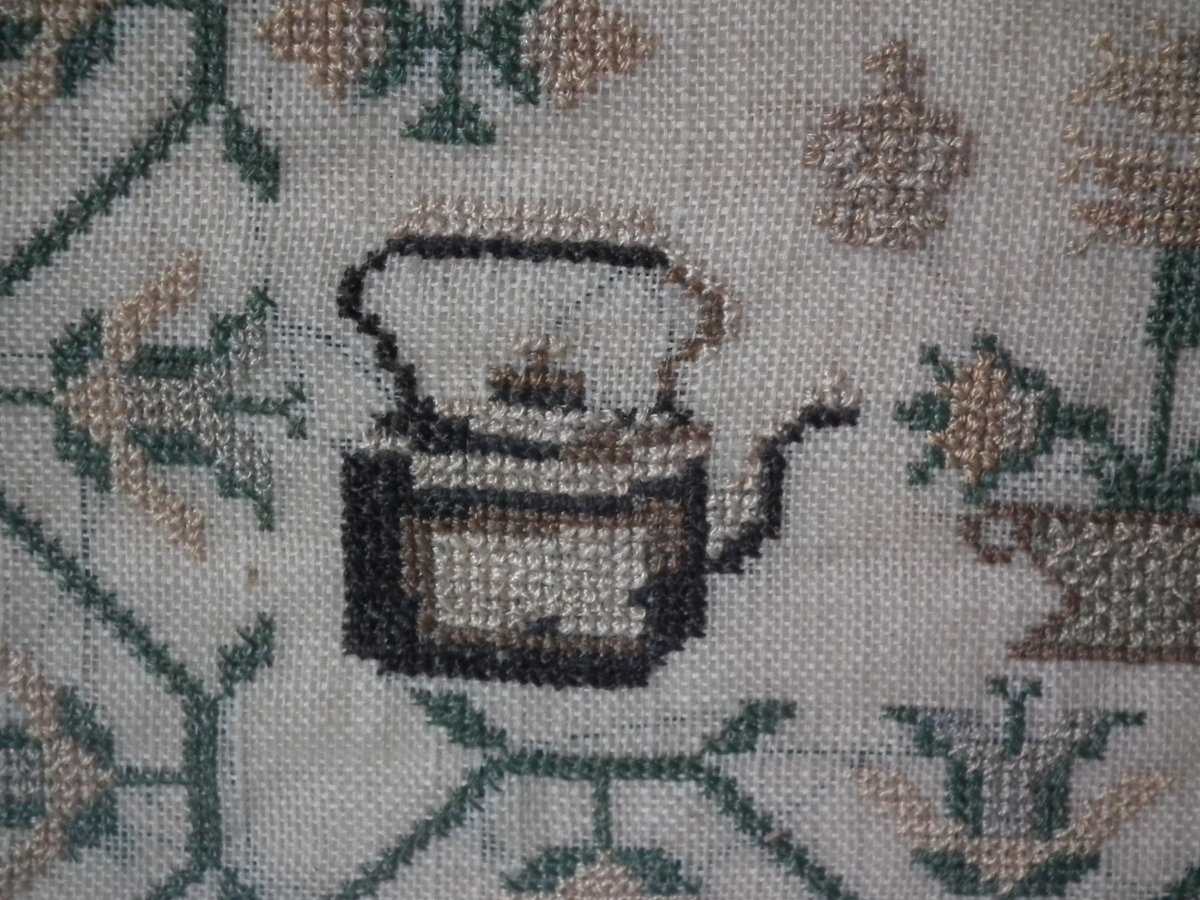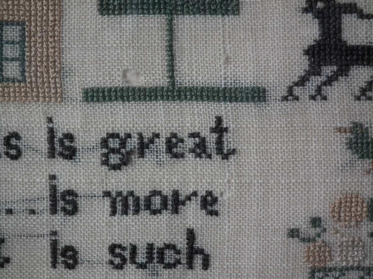 The sampler is worked in silk on linen ground, in cross stitch throughout.