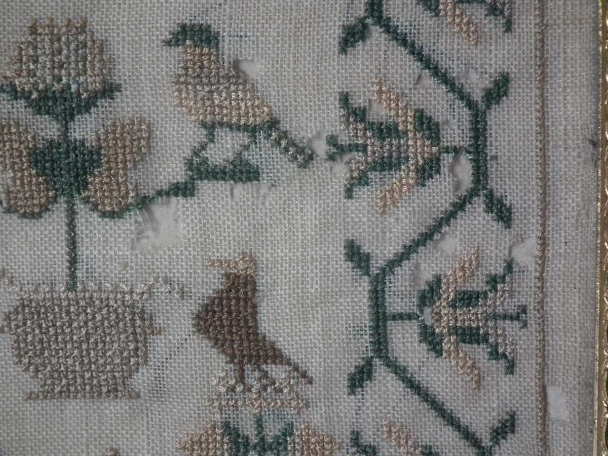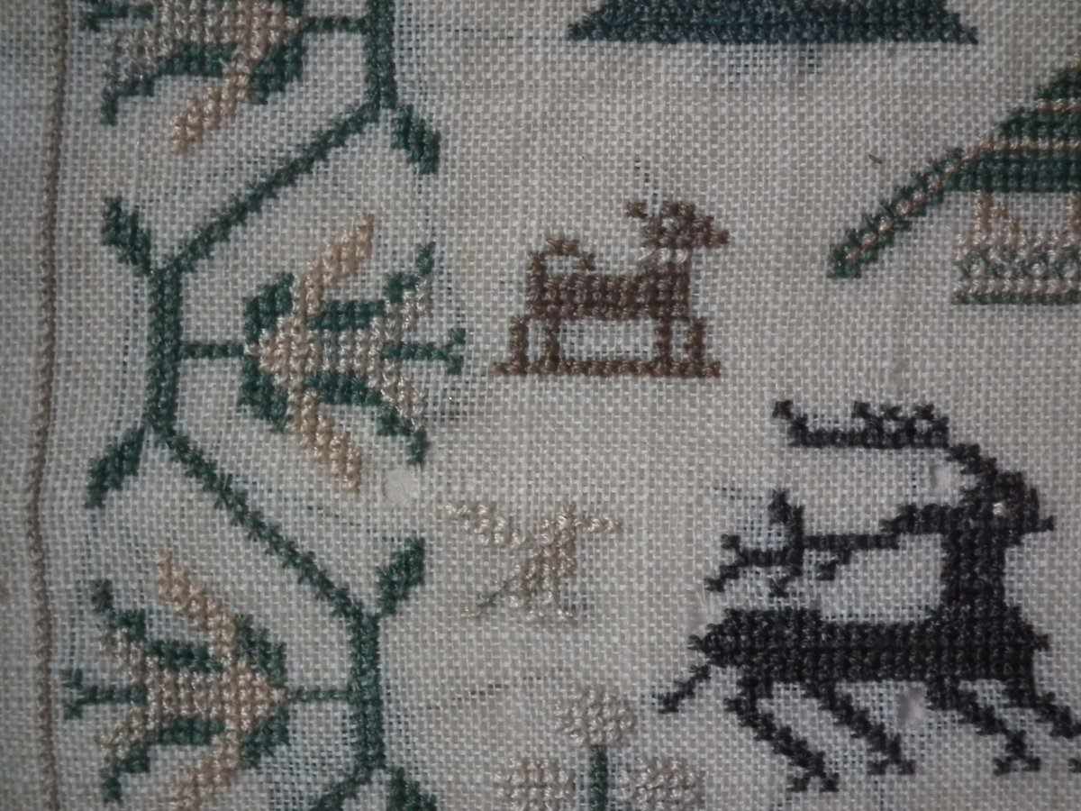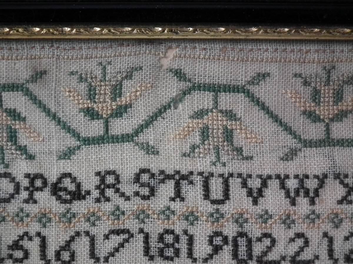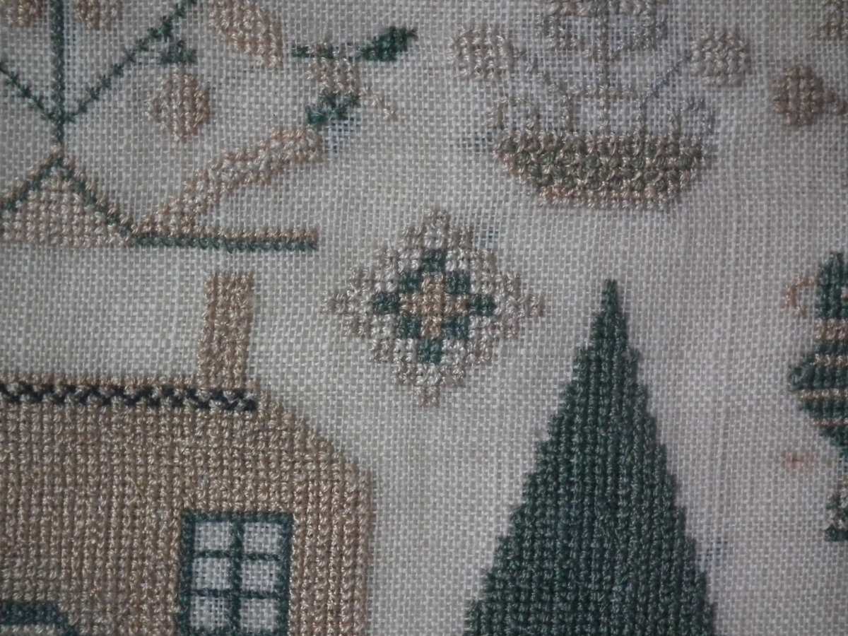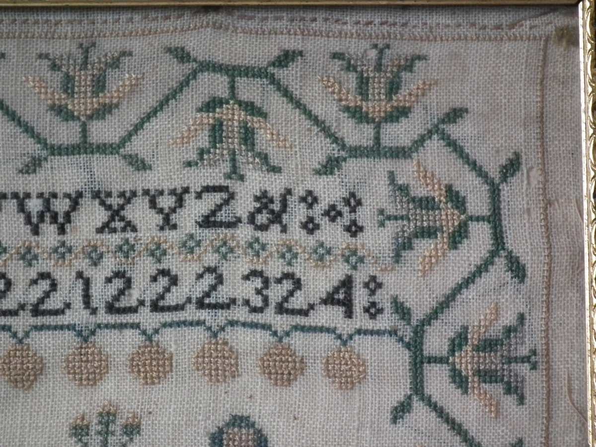 The sampler is worked in silk on linen ground, in cross stitch throughout.