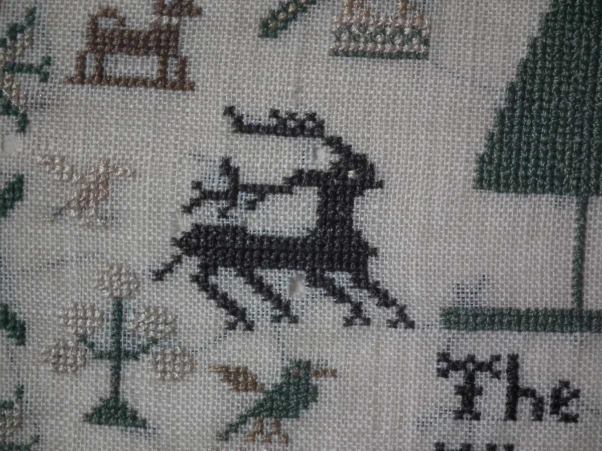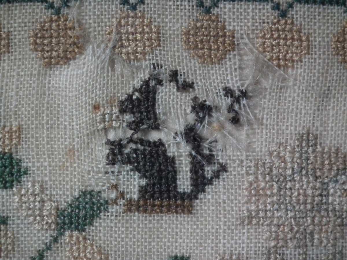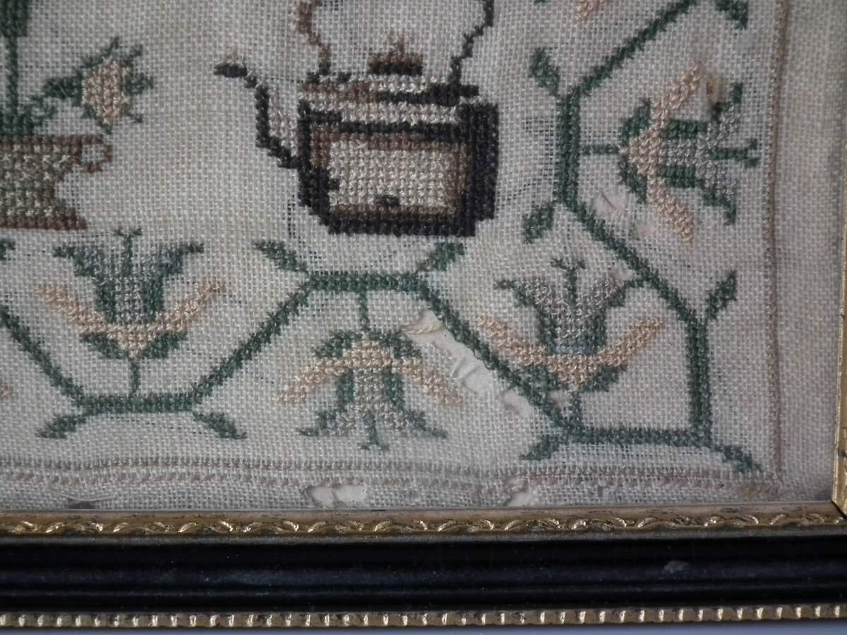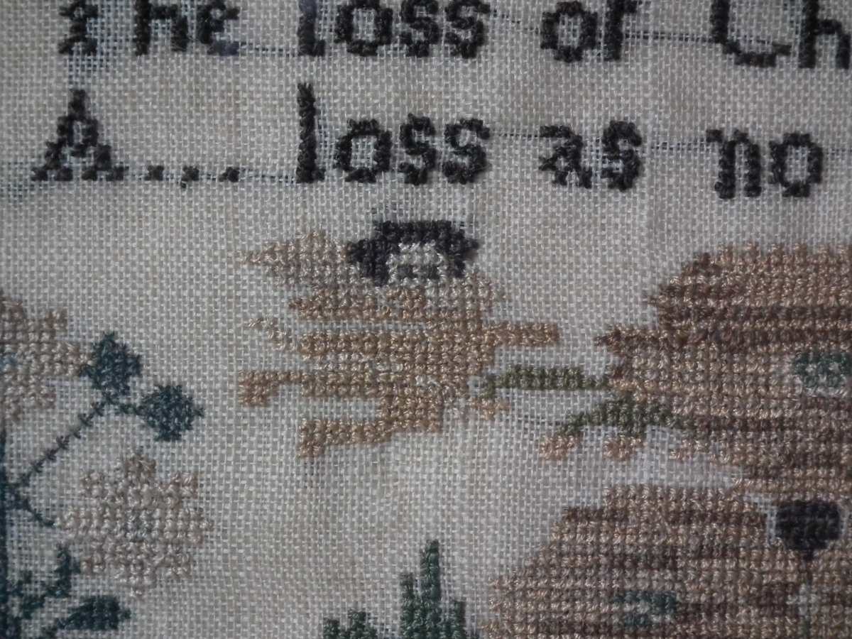 The sampler is worked in silk on linen ground, in cross stitch throughout.