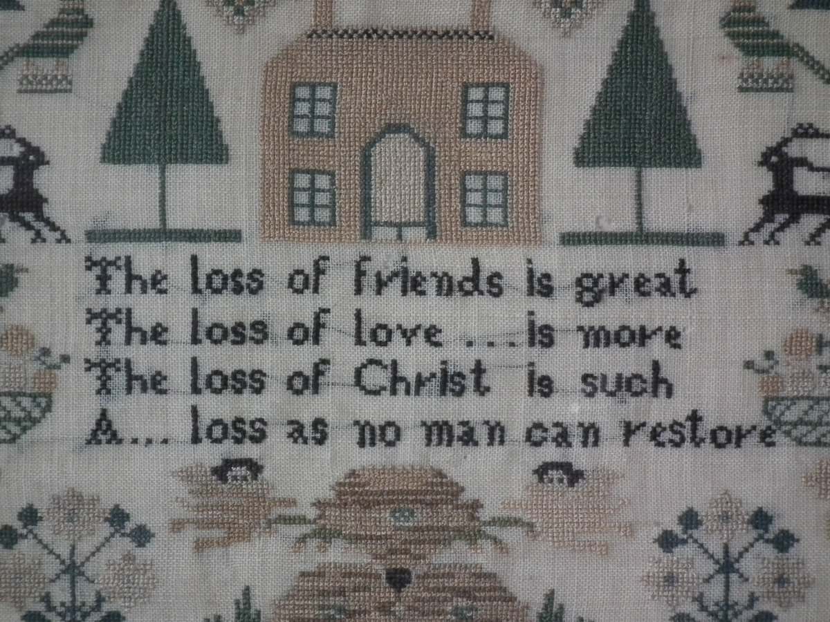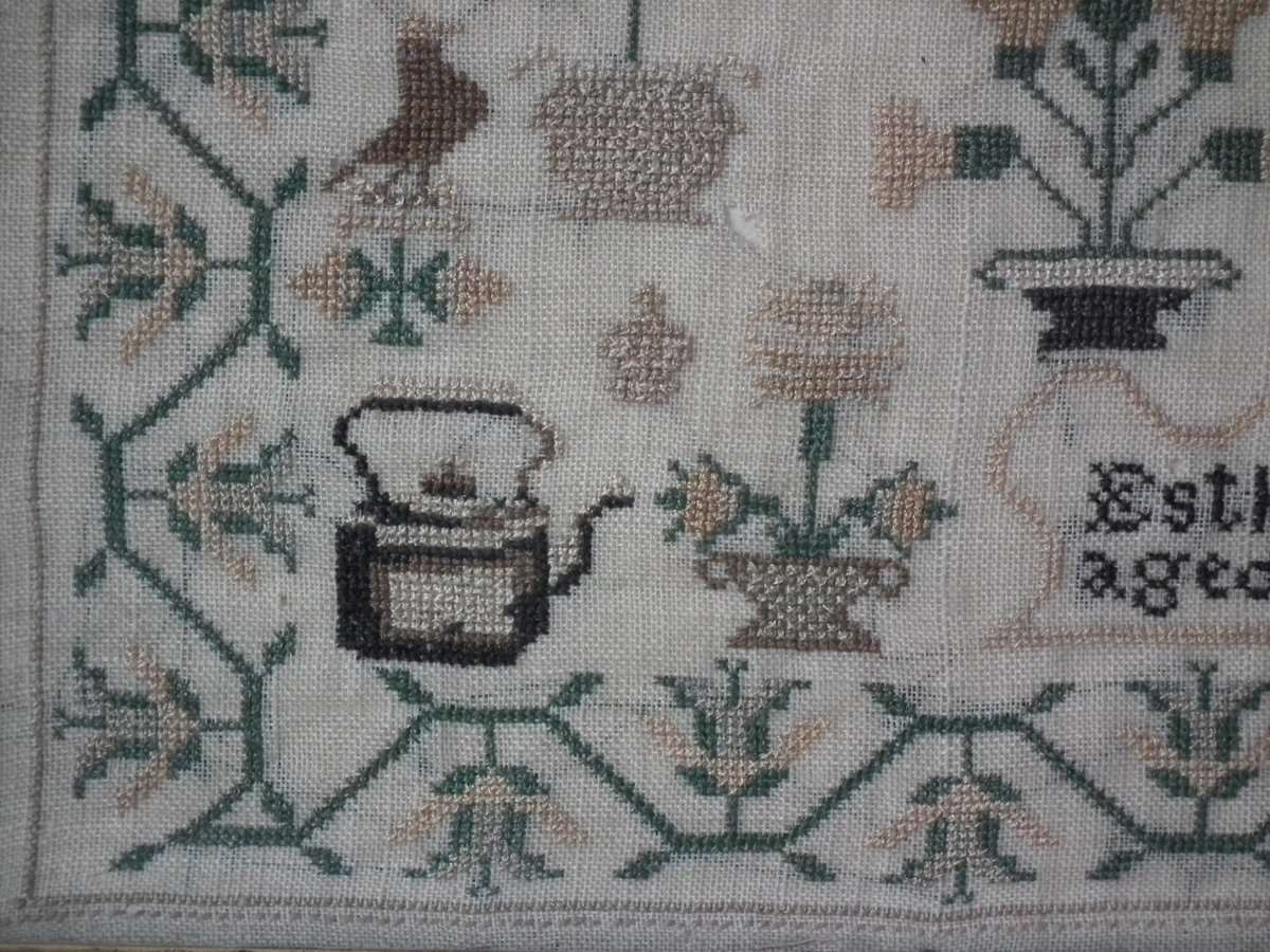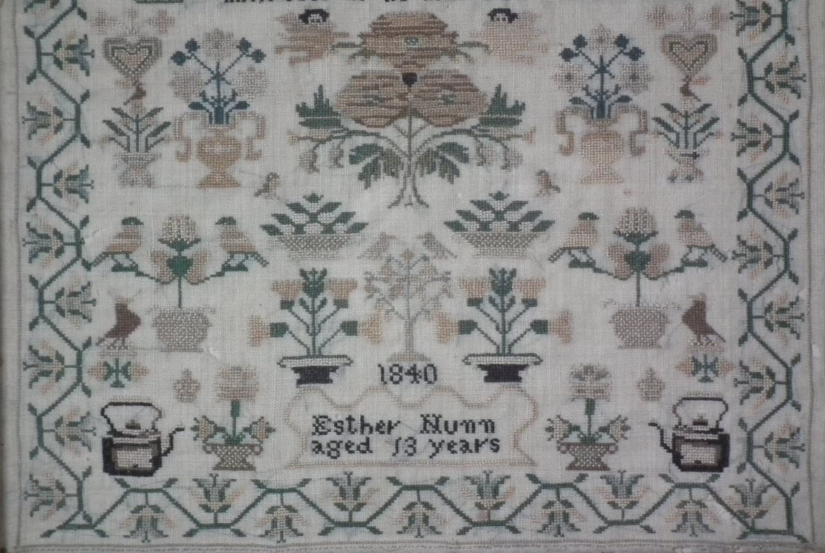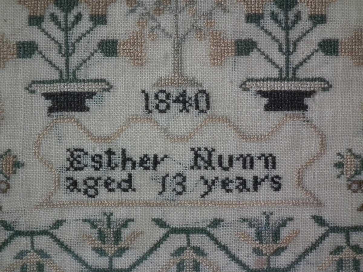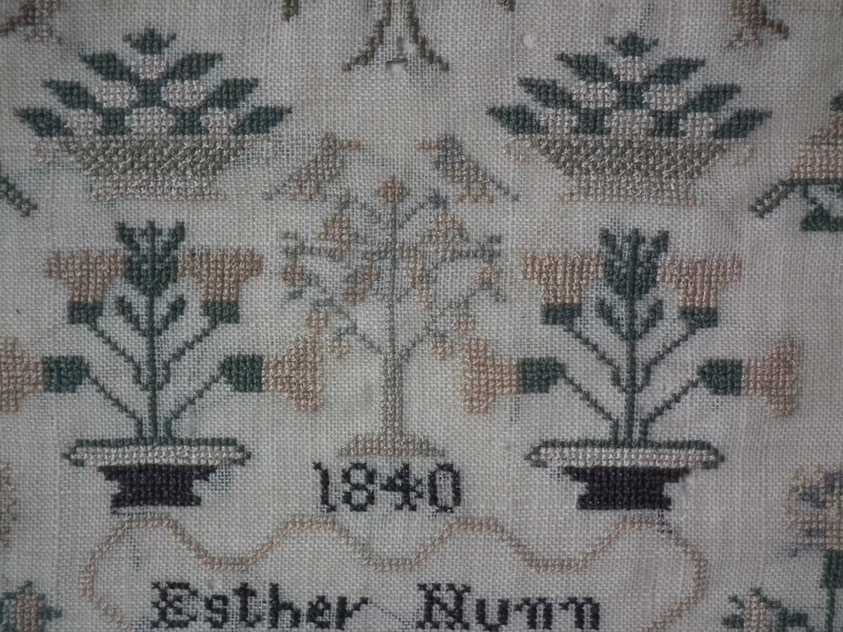 Dated 1840. 17.3ins high, 12.6ins wide, 0.6ins deep. Antique House Sampler, 1840 by Esther Nunn.
