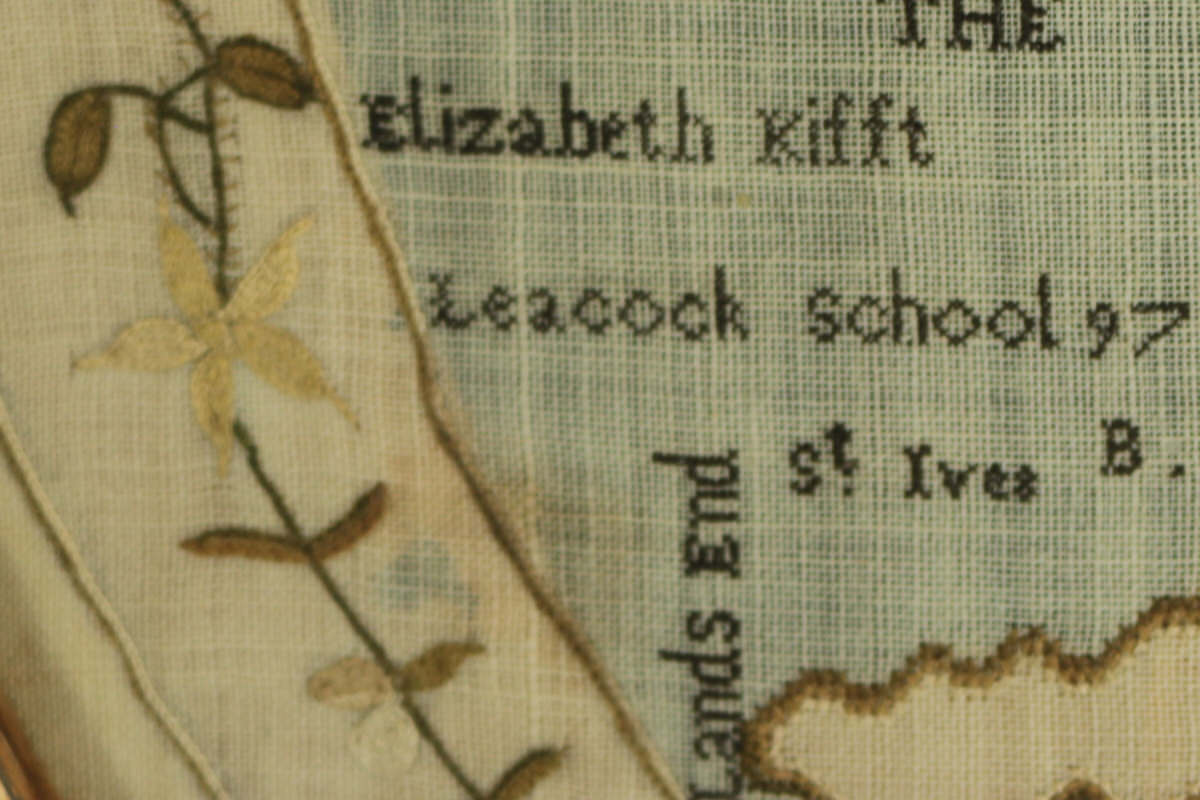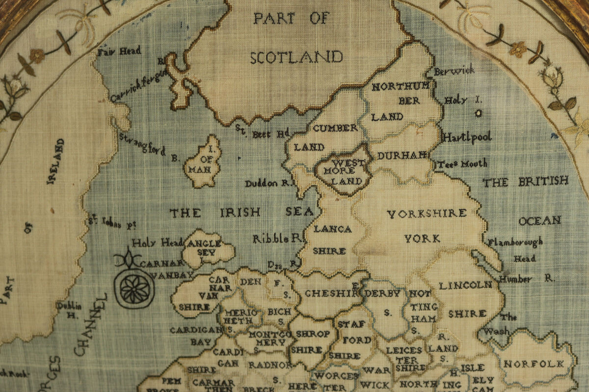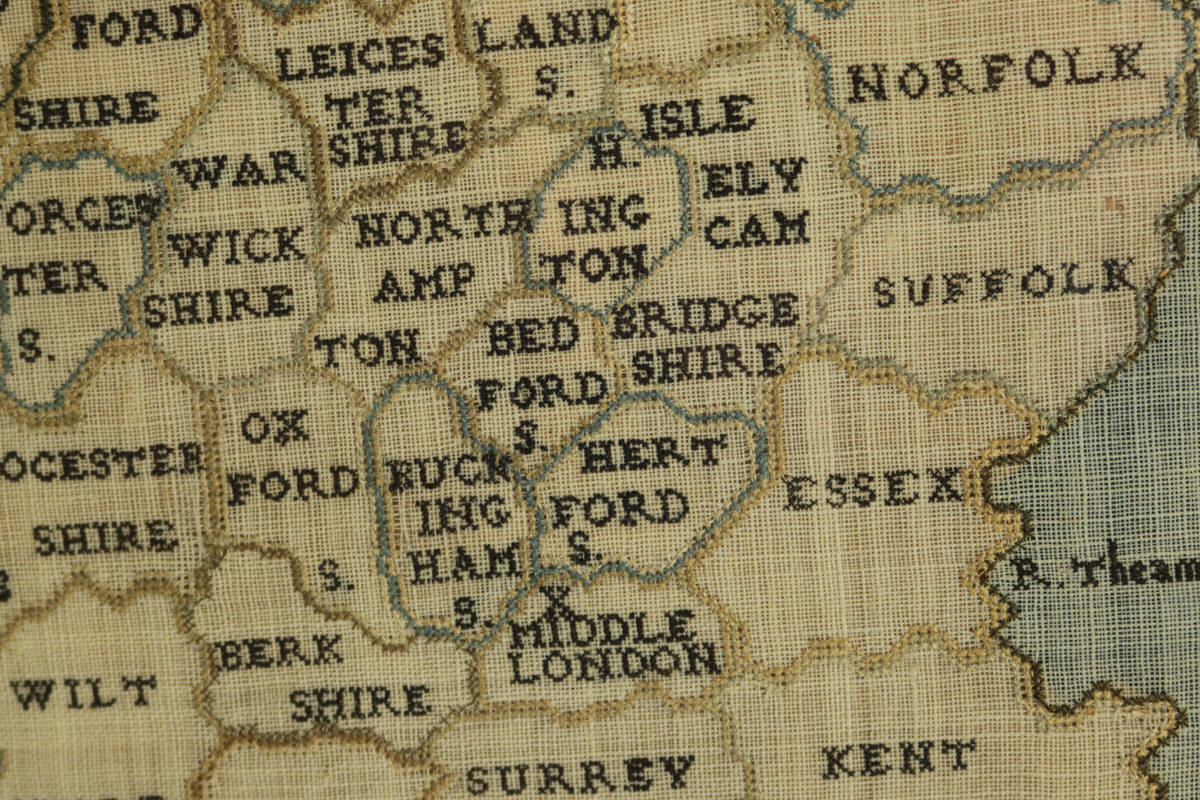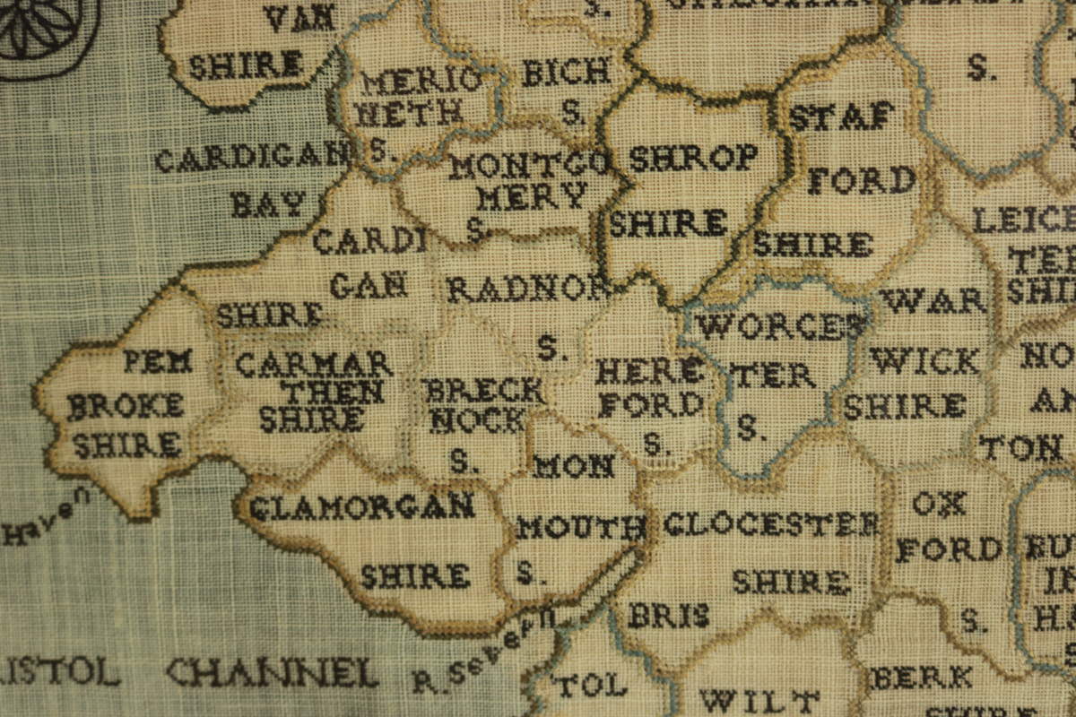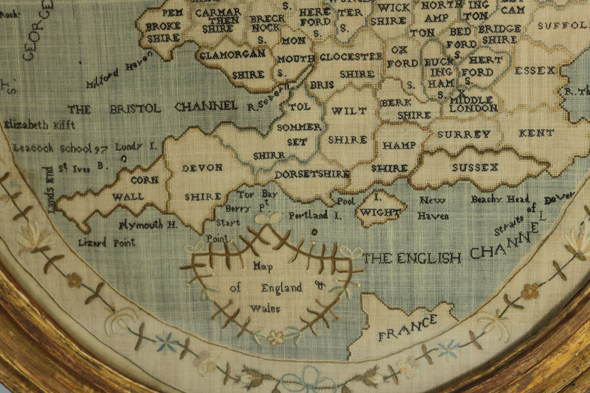 George III, dated 1797. 19.3ins high, 16.9ins wide, 2ins deep 1797 England & Wales Map Sampler by Elizabeth Kifft, Leacock School.