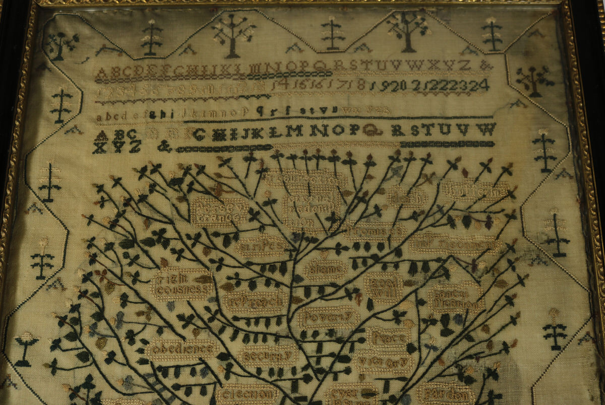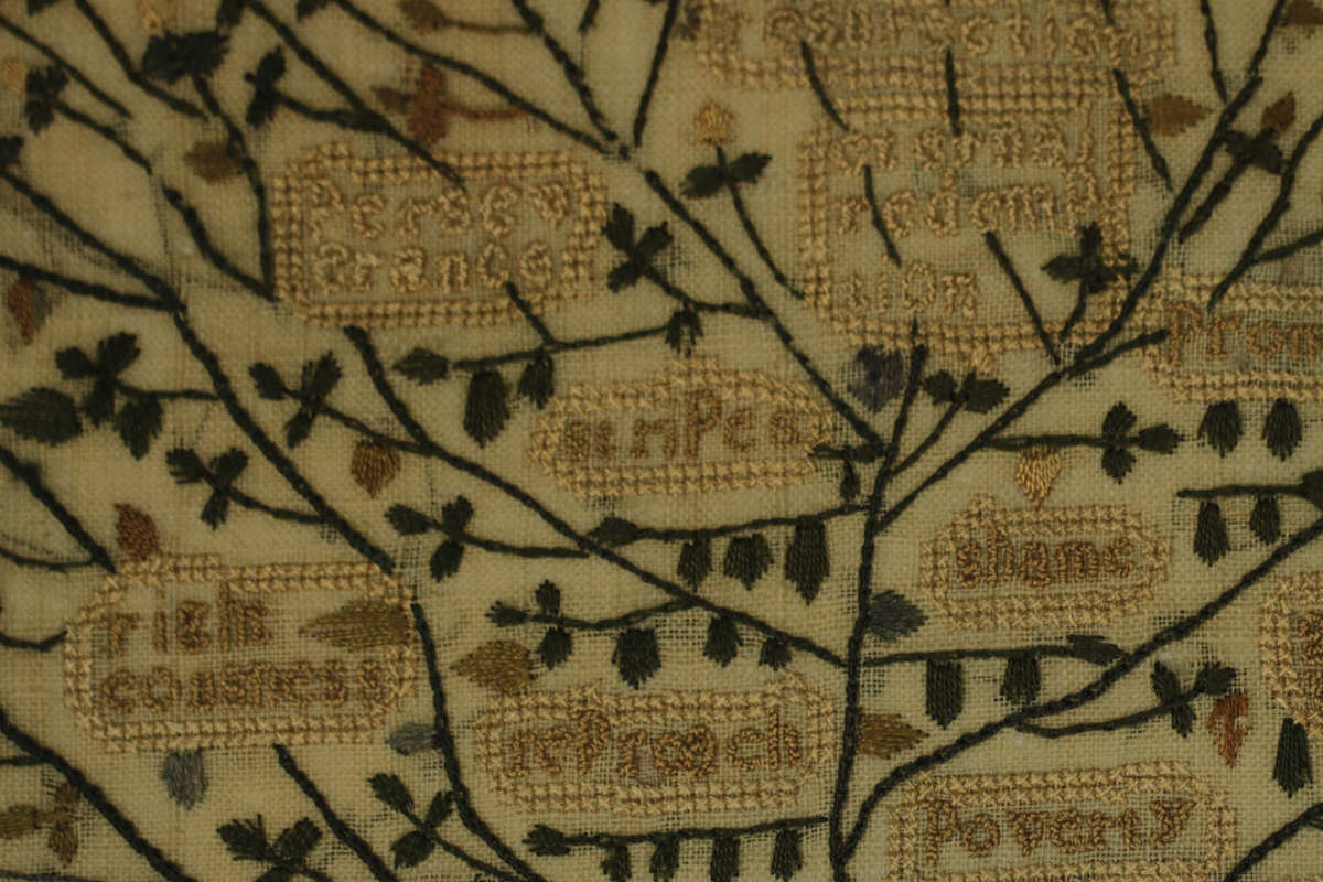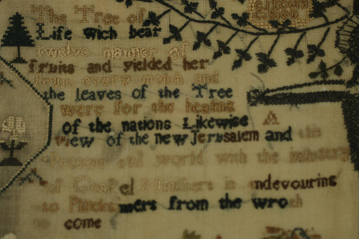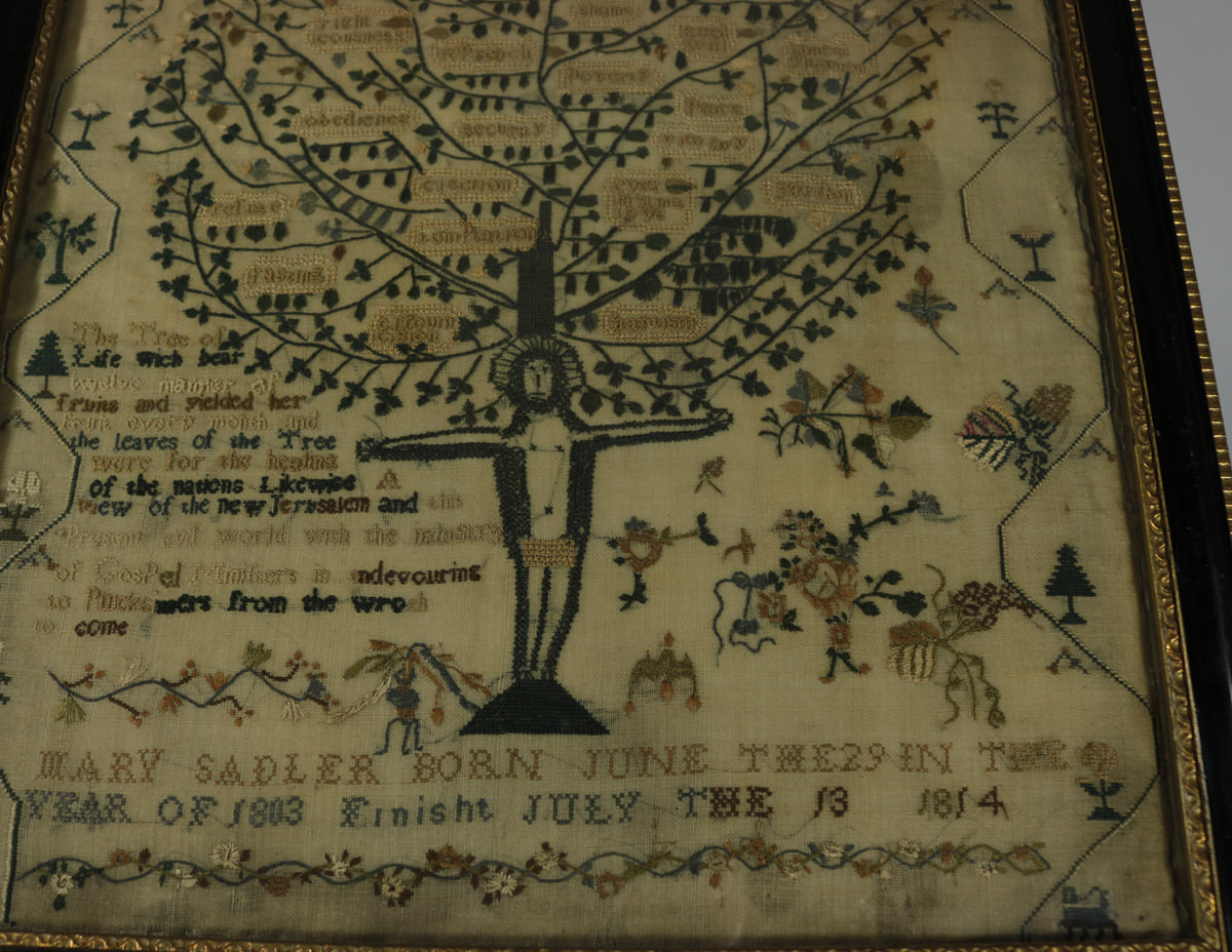 George III, dated 1814. 18.1ins high, 13ins wide, 1ins deep Antique Sampler, 1814, 'Tree of Life', by Mary Sandler.