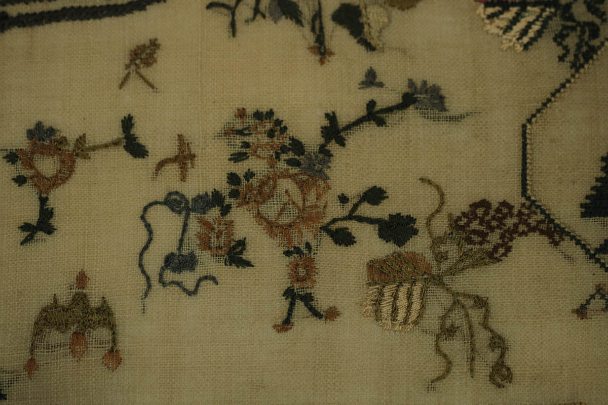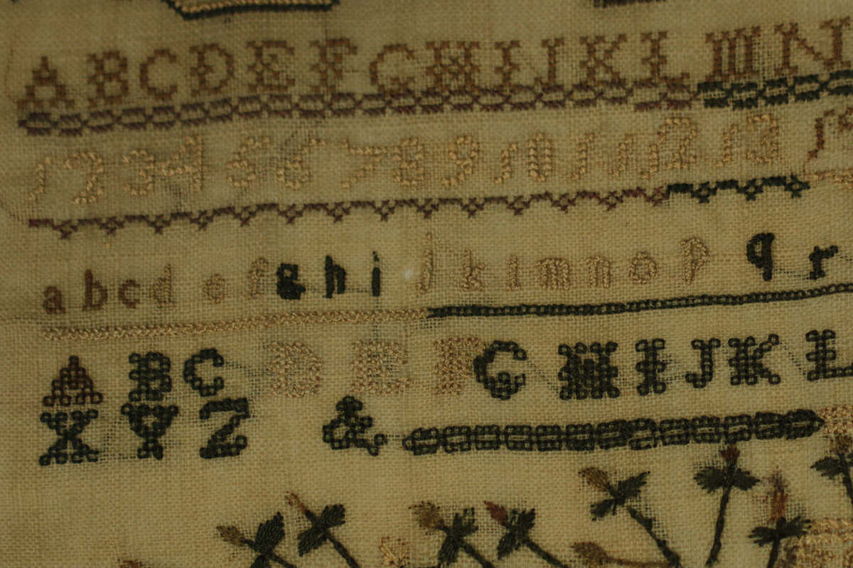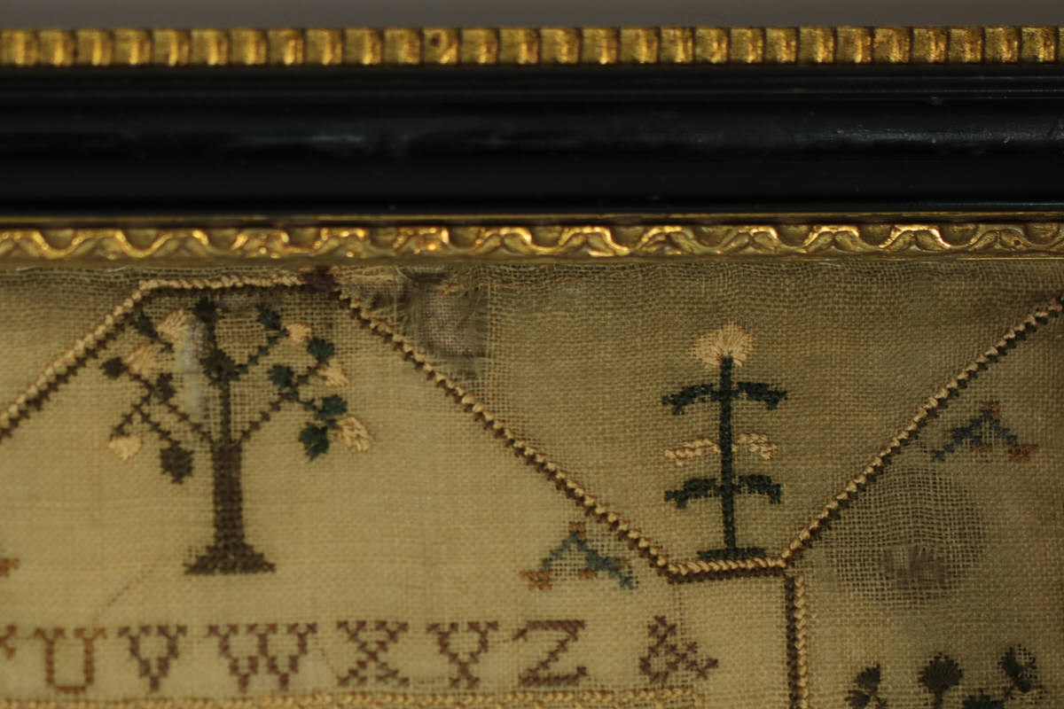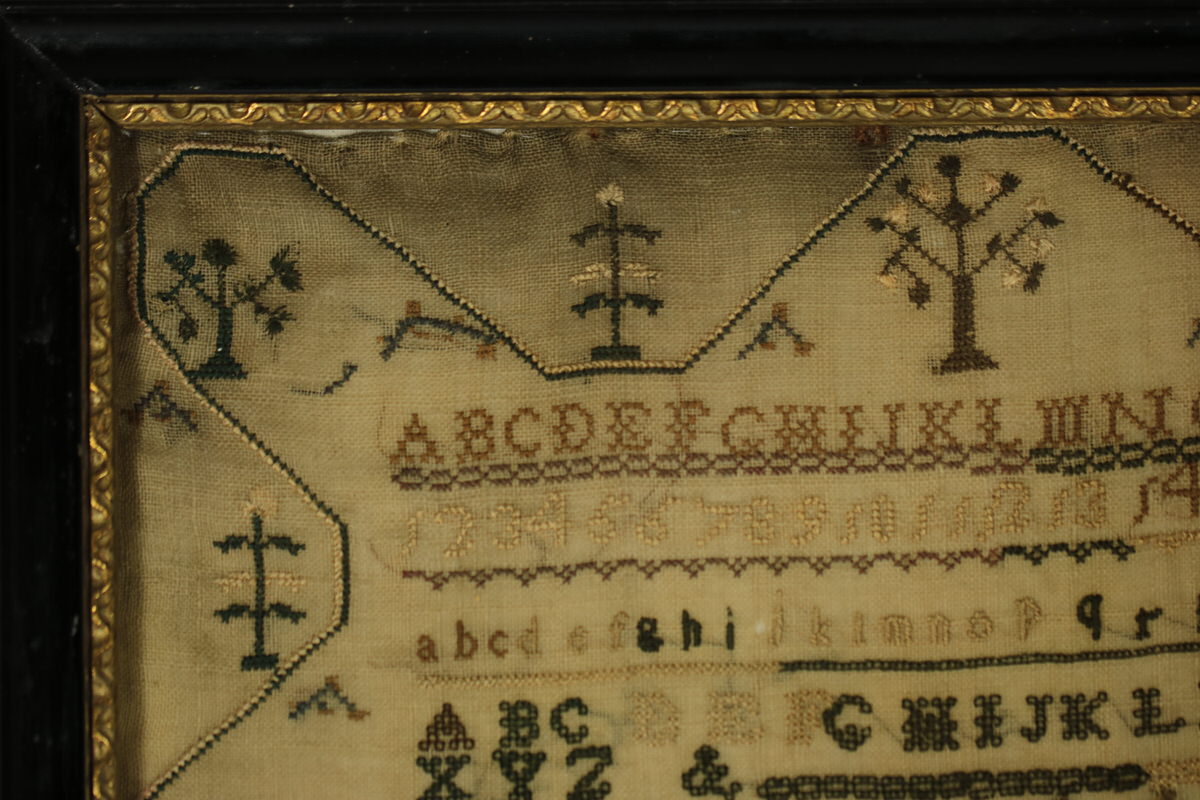 The sampler is worked in silk on linen ground, in a variety of stitches. Zig zag border.