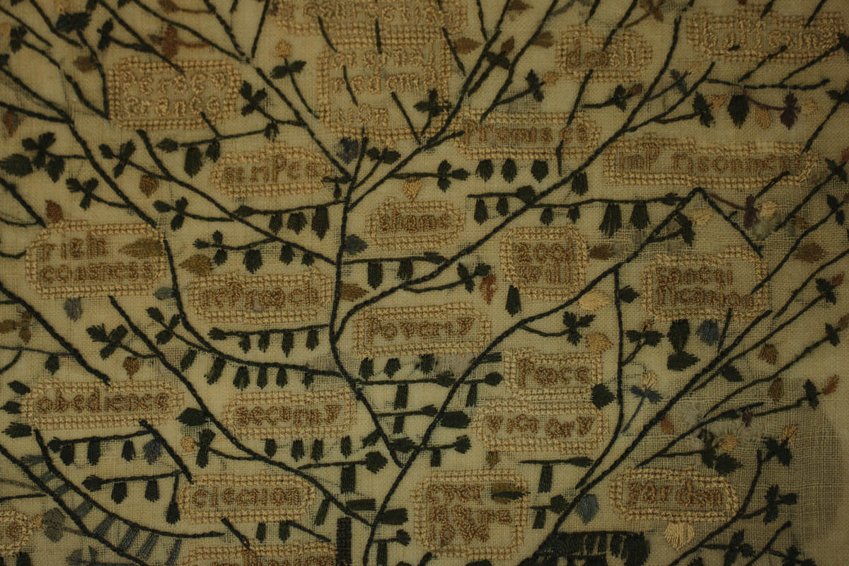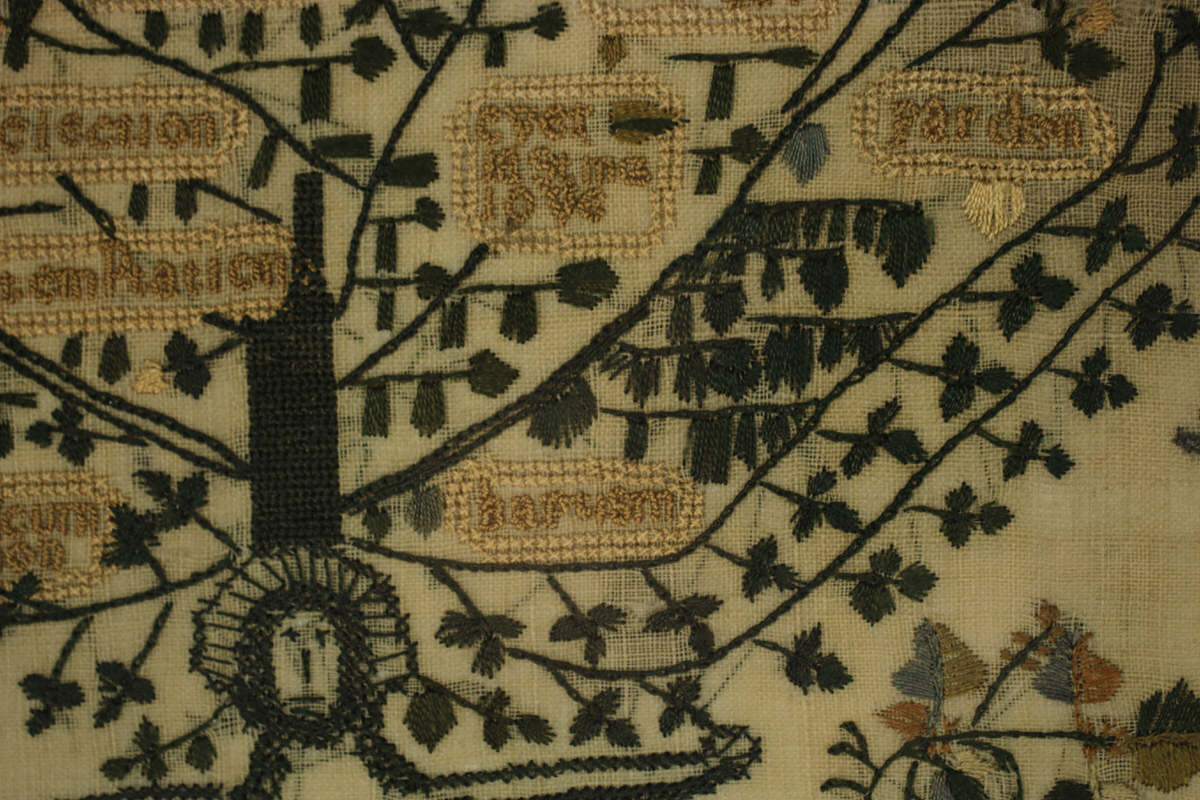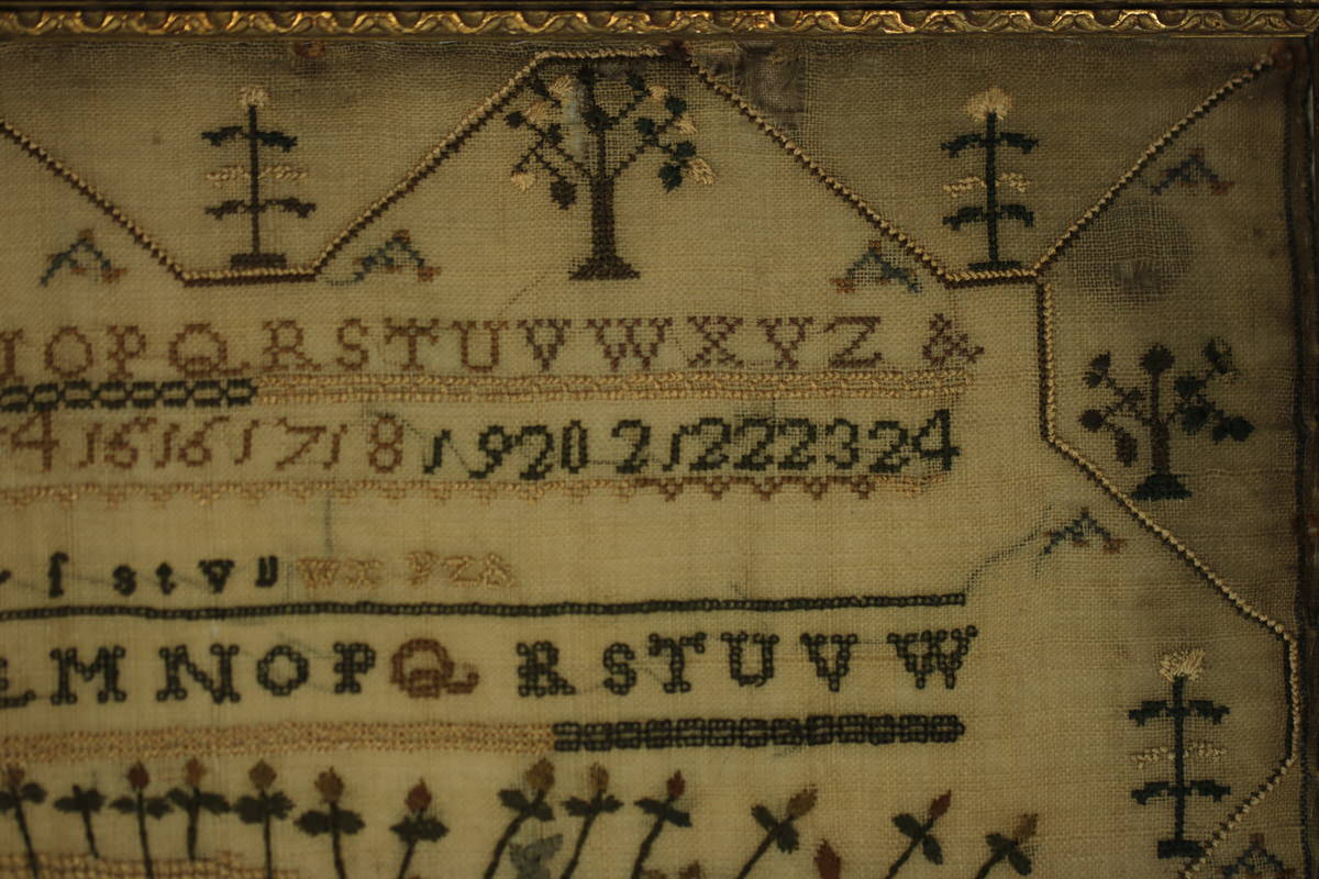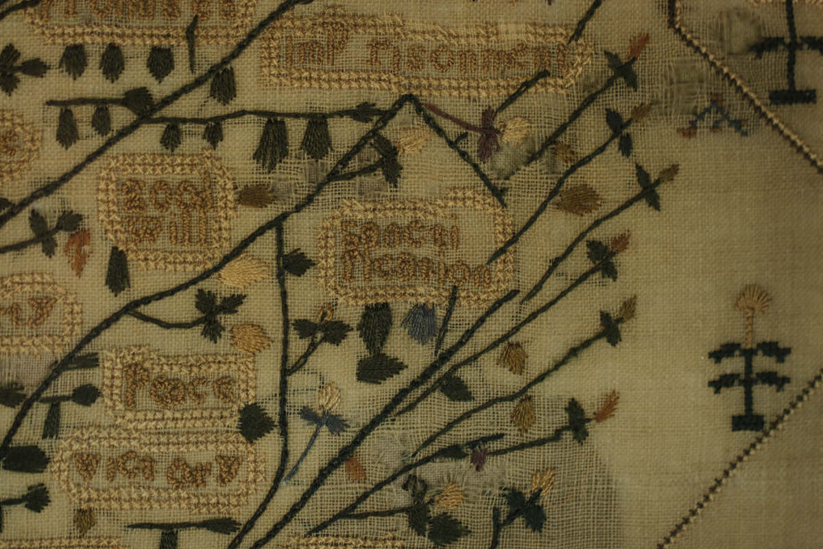 The sampler is worked in silk on linen ground, in a variety of stitches. Zig zag border.