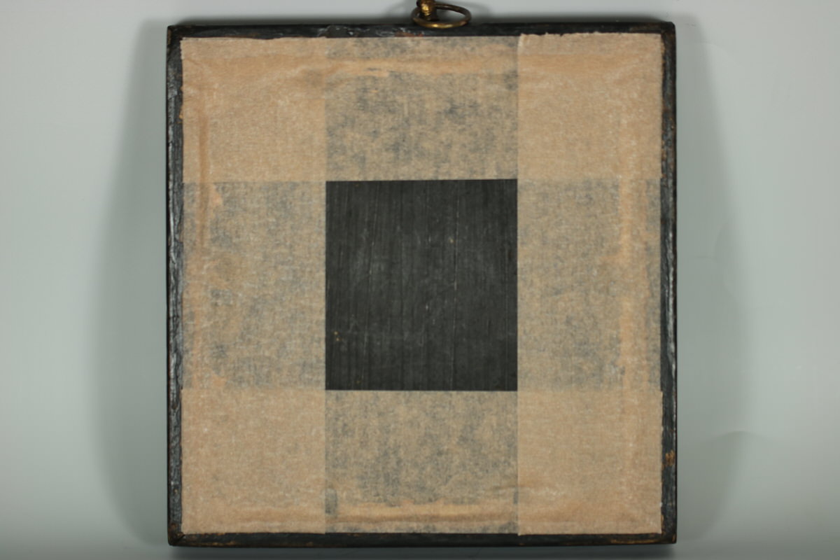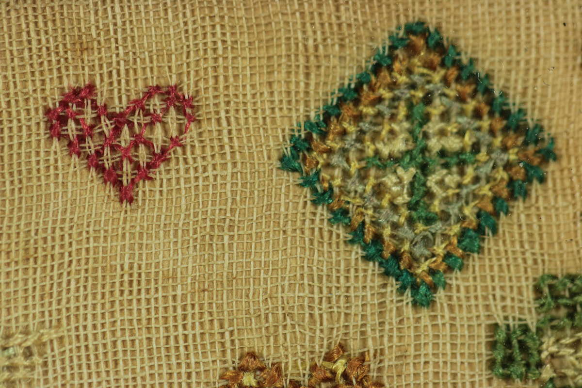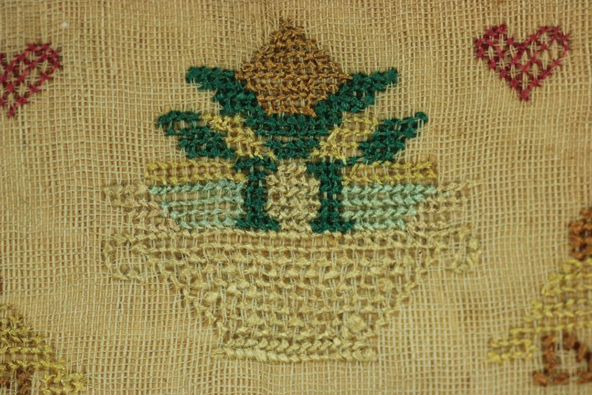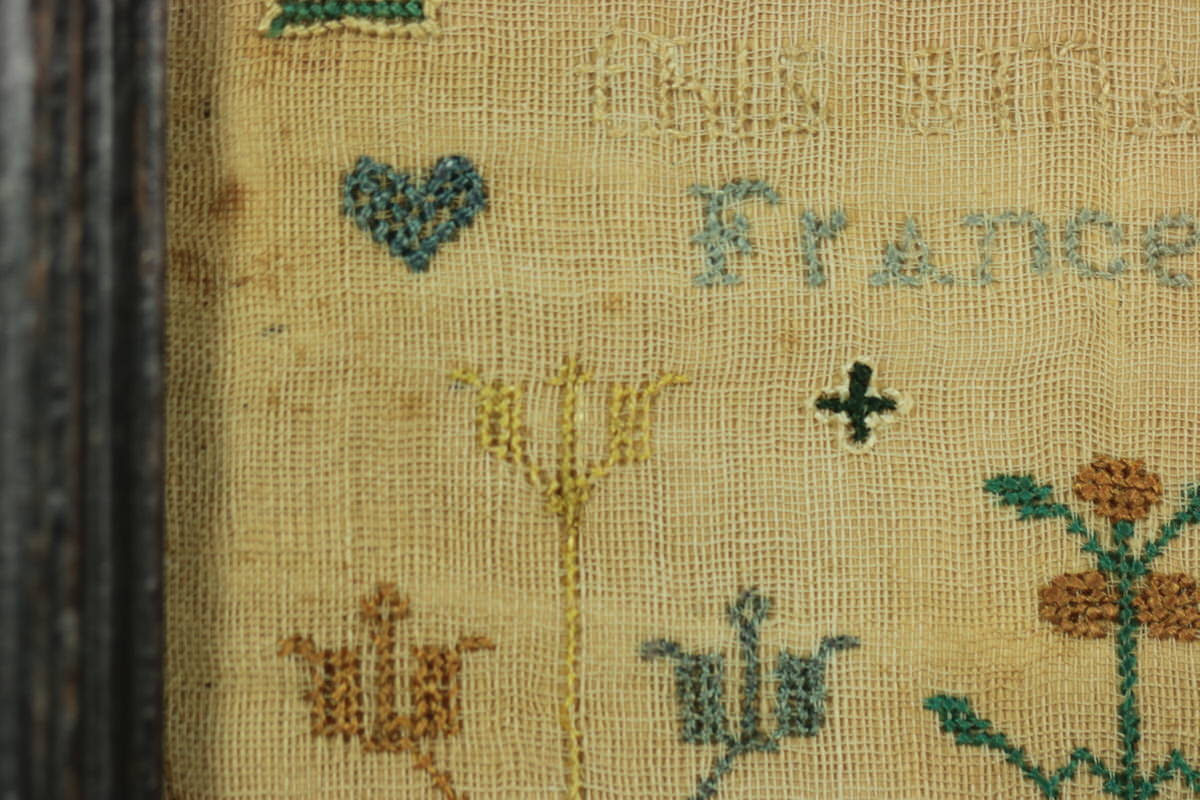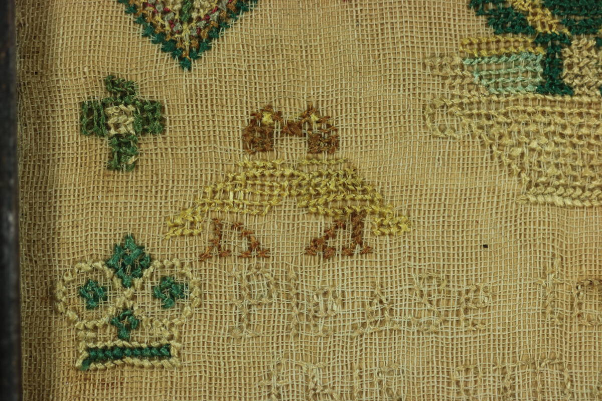 Mounting: The sampler is tacked to a wood panel which serves also as the backboard, sealed with tape.