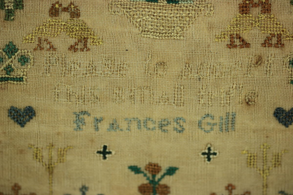 Georgian, circa 1800. 4.2ins high, 4.1ins wide, 0.9ins deep Miniature sampler by Frances Gill, worked in silk on a very fine ground in a variety of stitches.