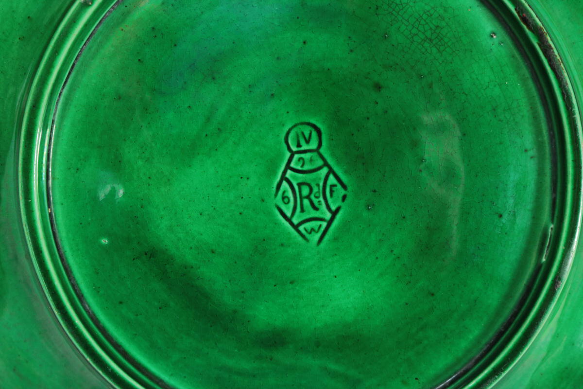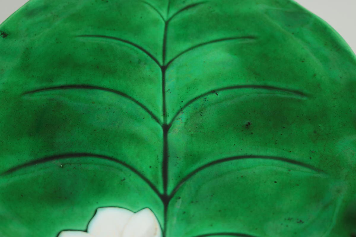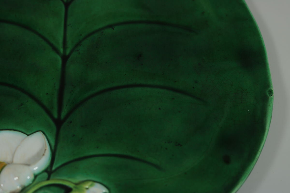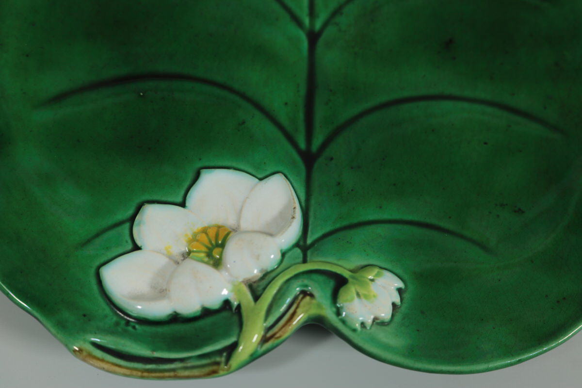 Victorian, circa 1873. 0.8ins high, 8.3ins wide, 7.7ins depth. George Jones Majolica plate which features a lily pad and flowers.
