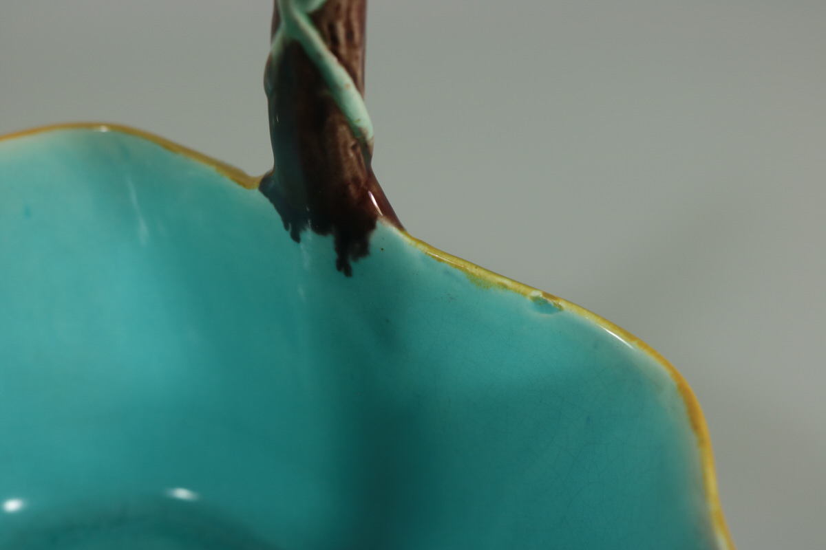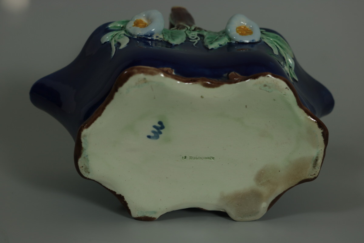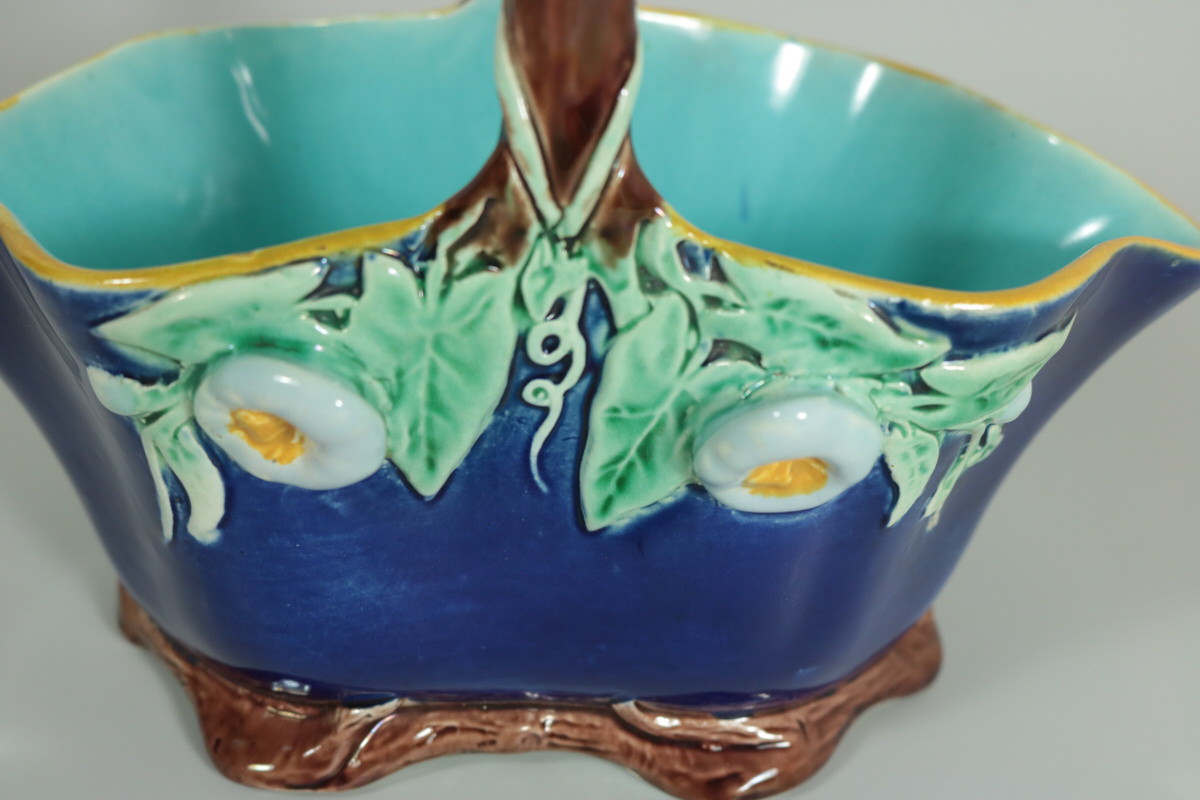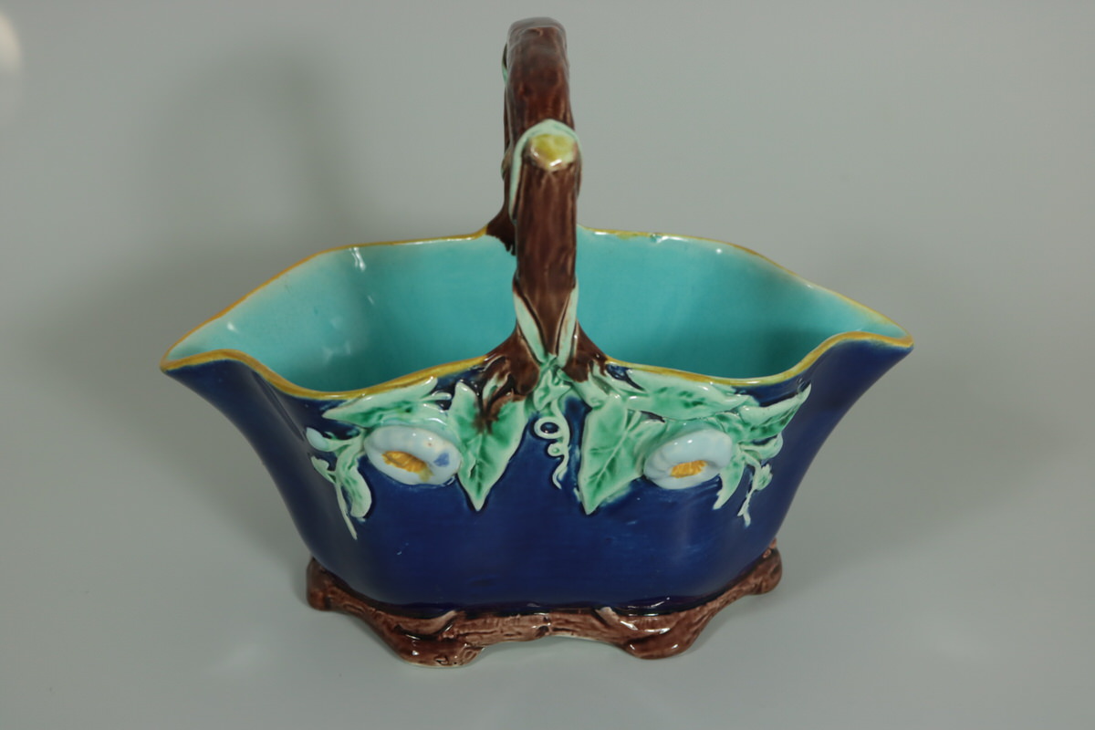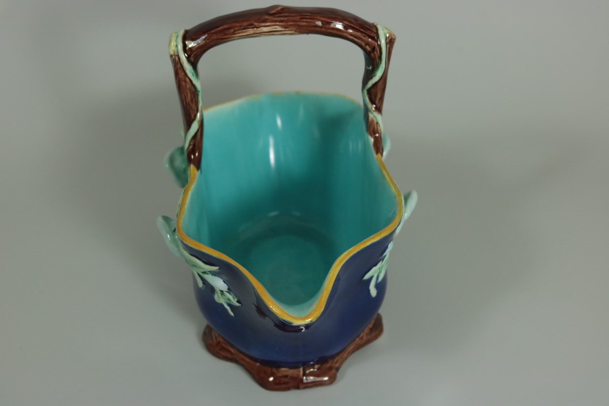 Victorian, circa 1870. 5.9ins high, 7.7ins wide, 3.9ins depth. Holdcroft Majolica basket which features flowers and leaves hanging from the branch-like handle.