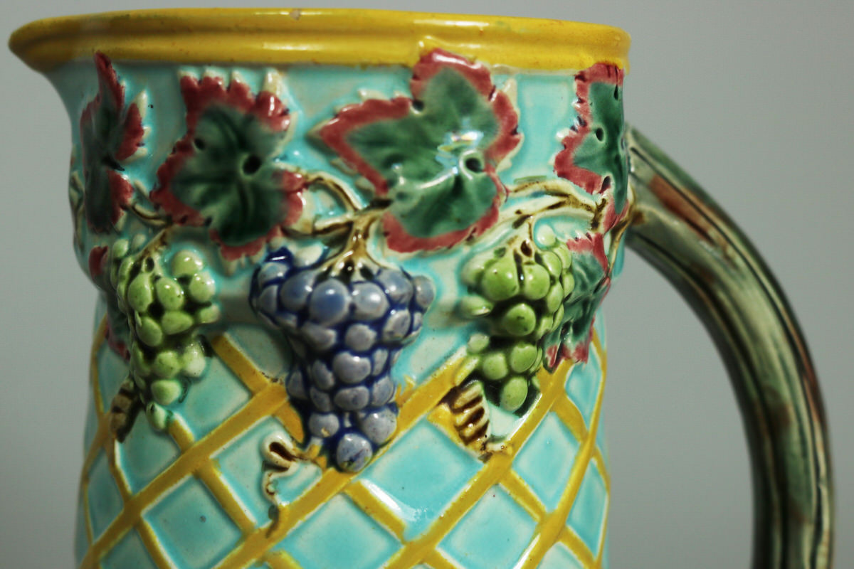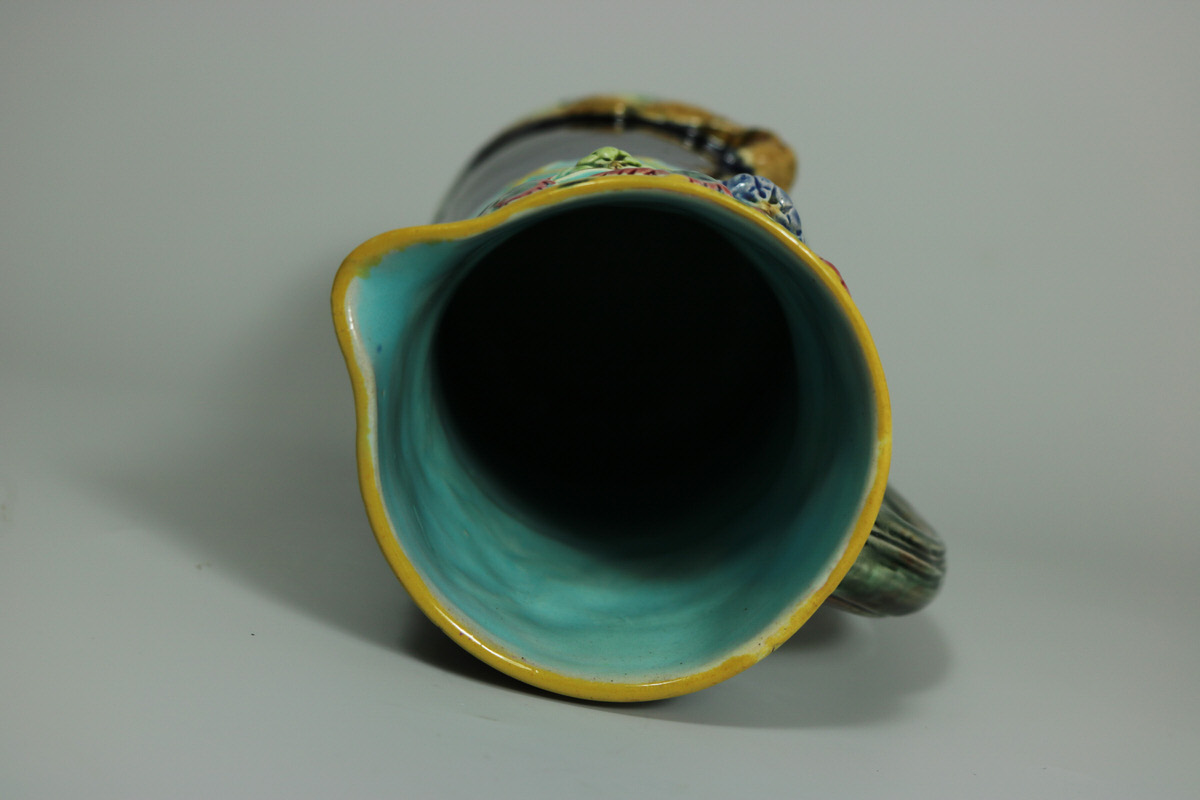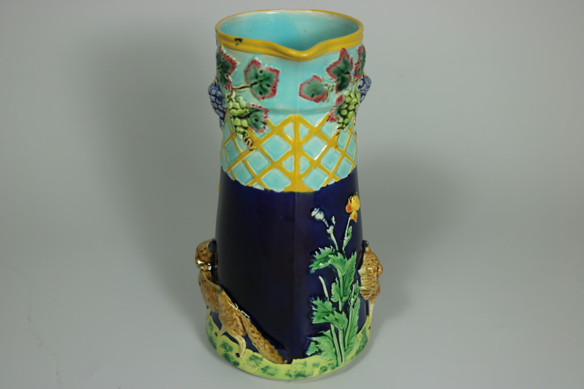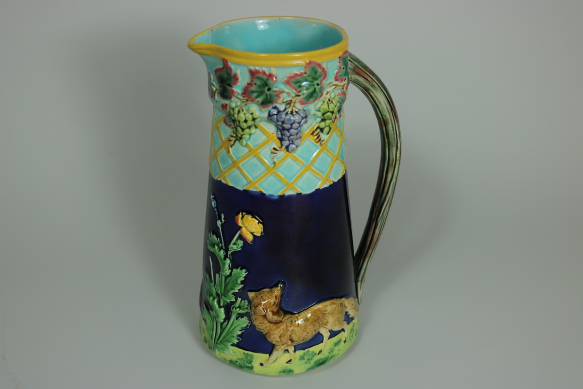 Victorian, circa 1876. 7.9ins high, 5.1ins wide, 3.9ins depth. Brown Westhead Moore and Co Majolica jug/pitcher which features a fox on either side at the bottom, with a grapevine border to the top.