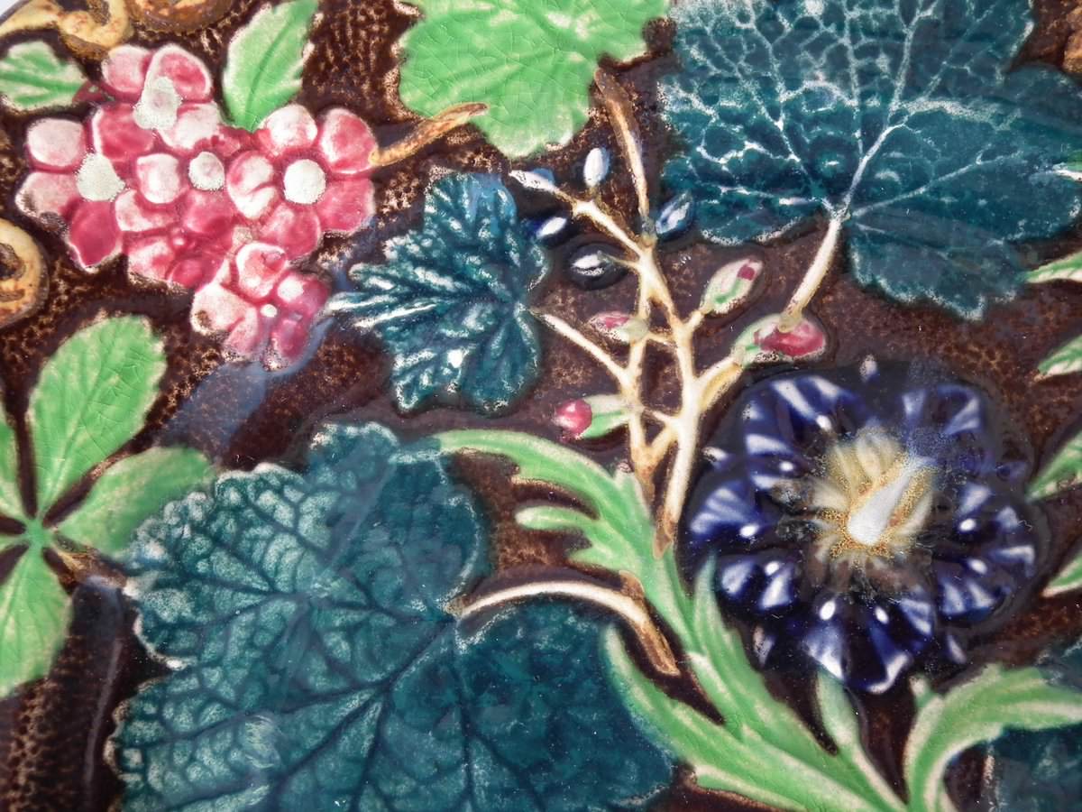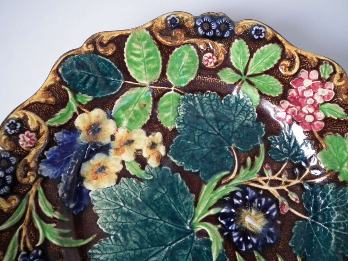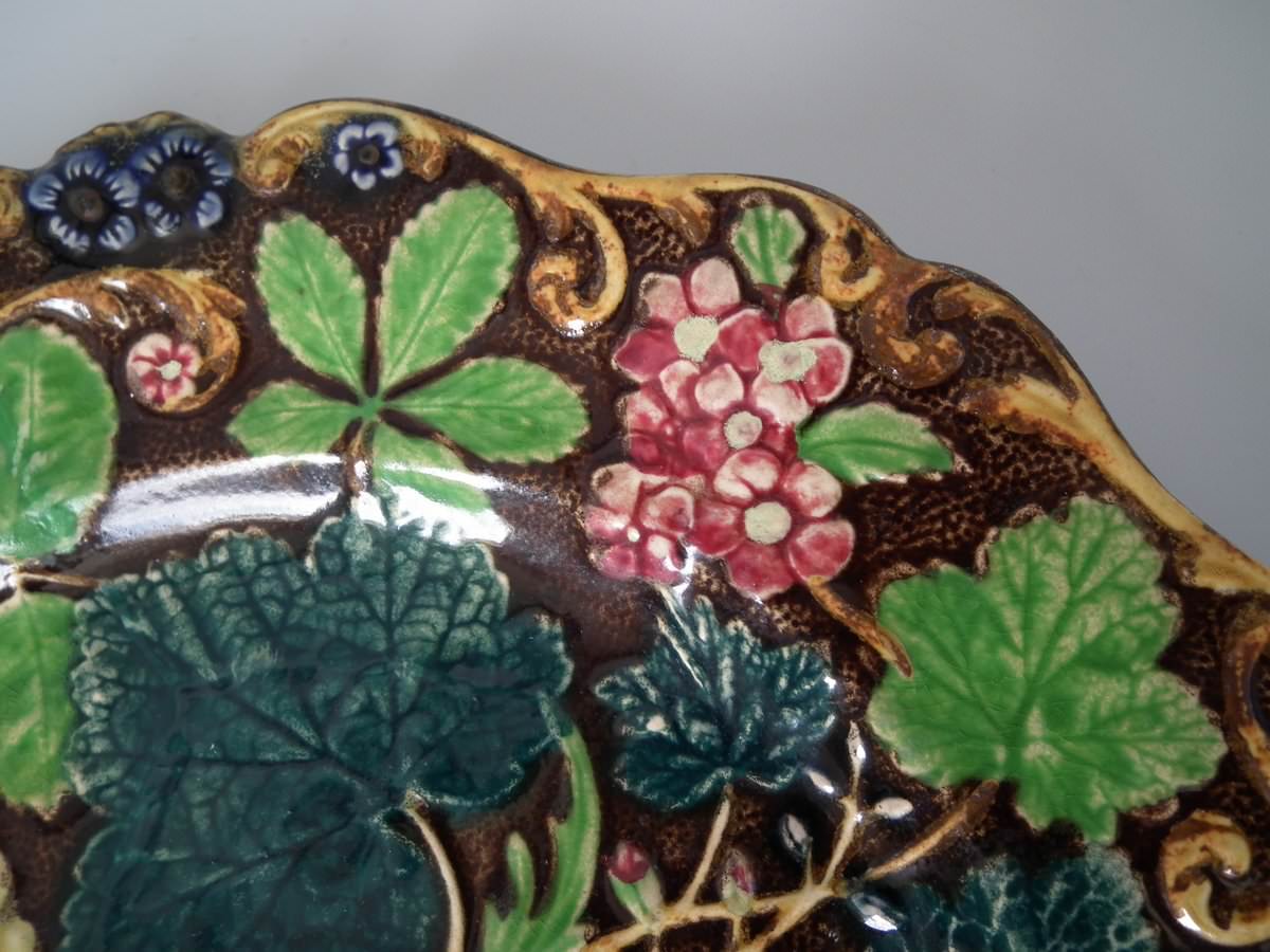 Victorian, circa 1880. 9.1ins high, 9.1ins wide, 1ins depth. Alcock Majolica plate which features flowers and leaves.