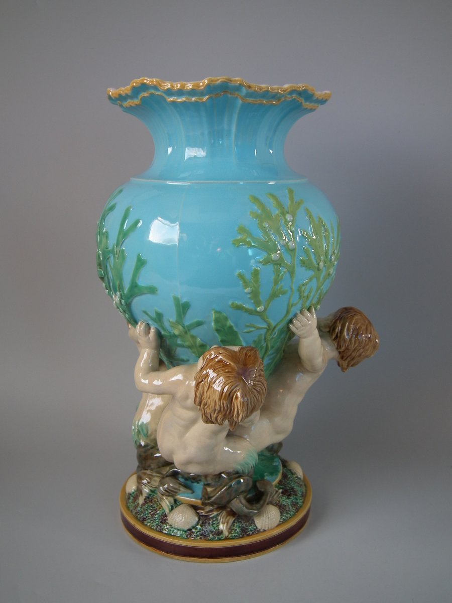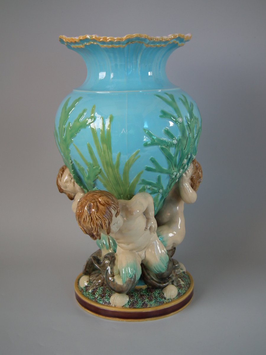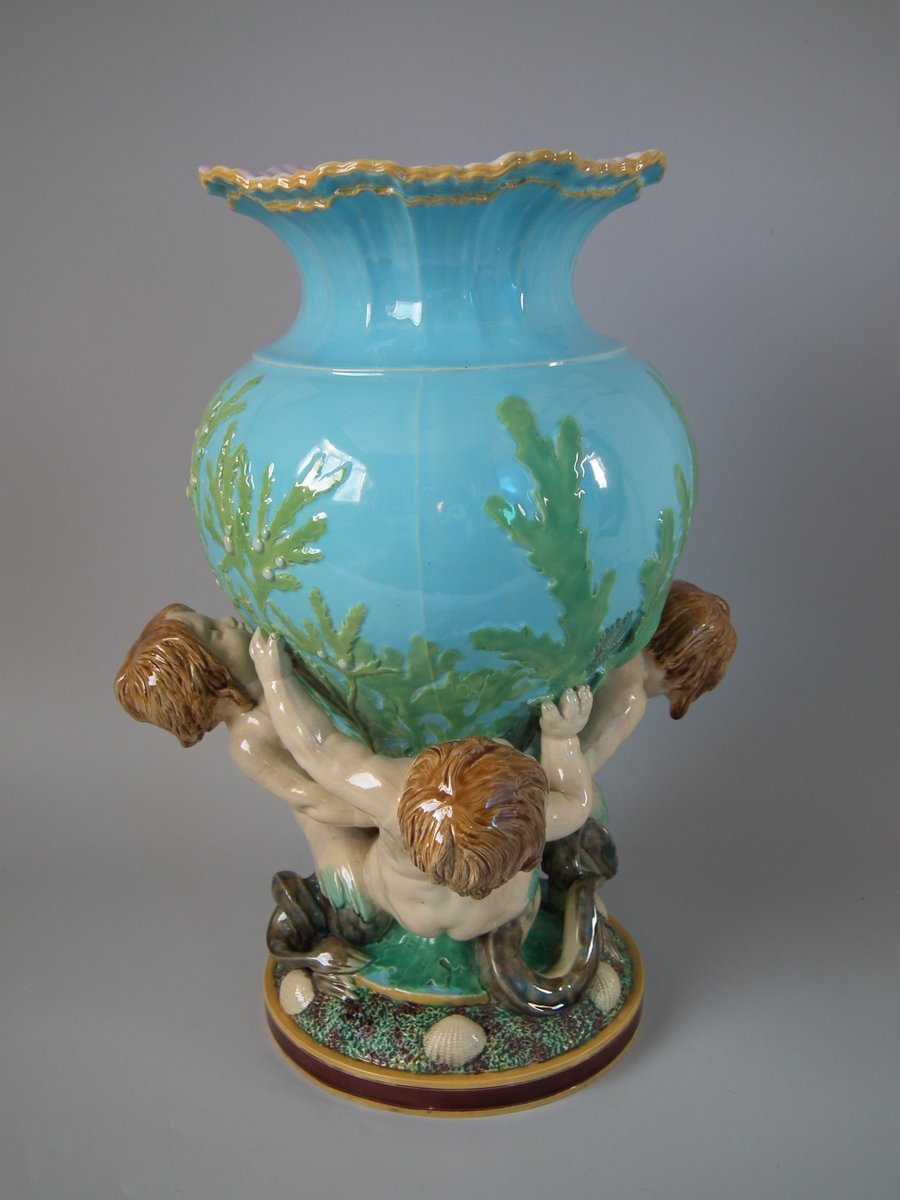 Victorian, circa 1870. 16.7ins high, 11.4ins wide, 12.2ins depth. Minton Majolica vase which features 3 merboys supporting a shell vase.