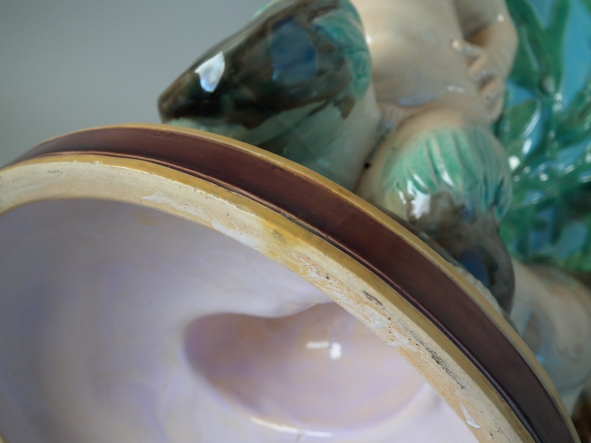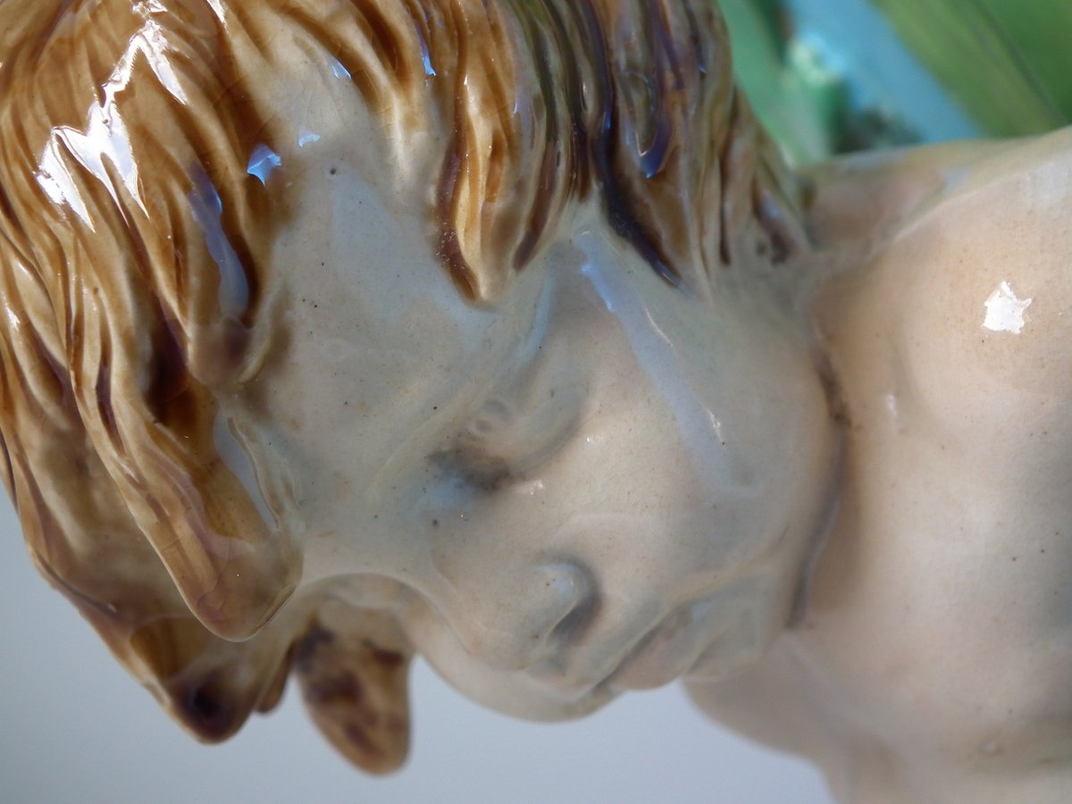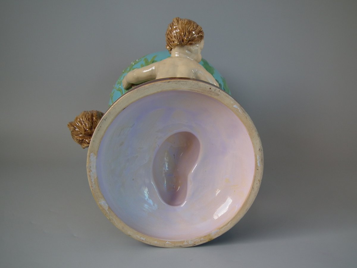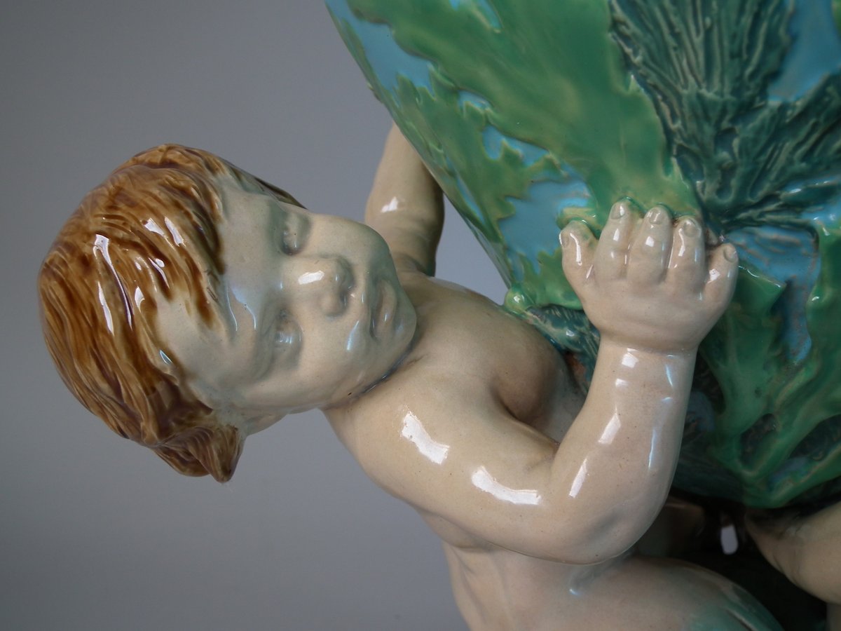 Victorian, circa 1870. 16.7ins high, 11.4ins wide, 12.2ins depth. Minton Majolica vase which features 3 merboys supporting a shell vase.
