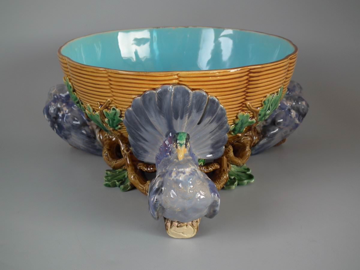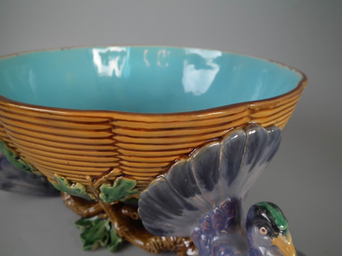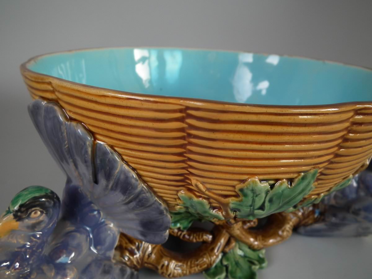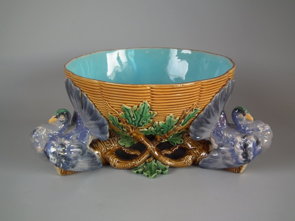 Victorian, circa 1870. 5.5ins high, 12.6ins wide, 12.6ins depth. Minton Majolica centrepiece bowl which features three pigeons with tails fanned out, supporting a basketweave bowl.