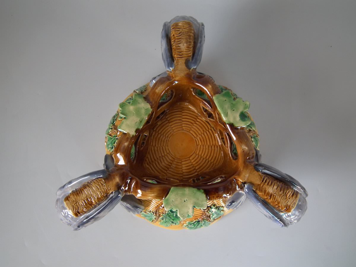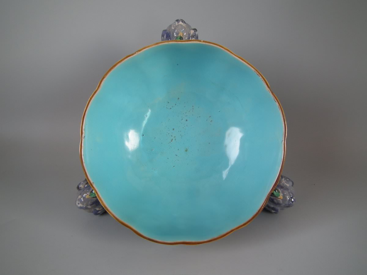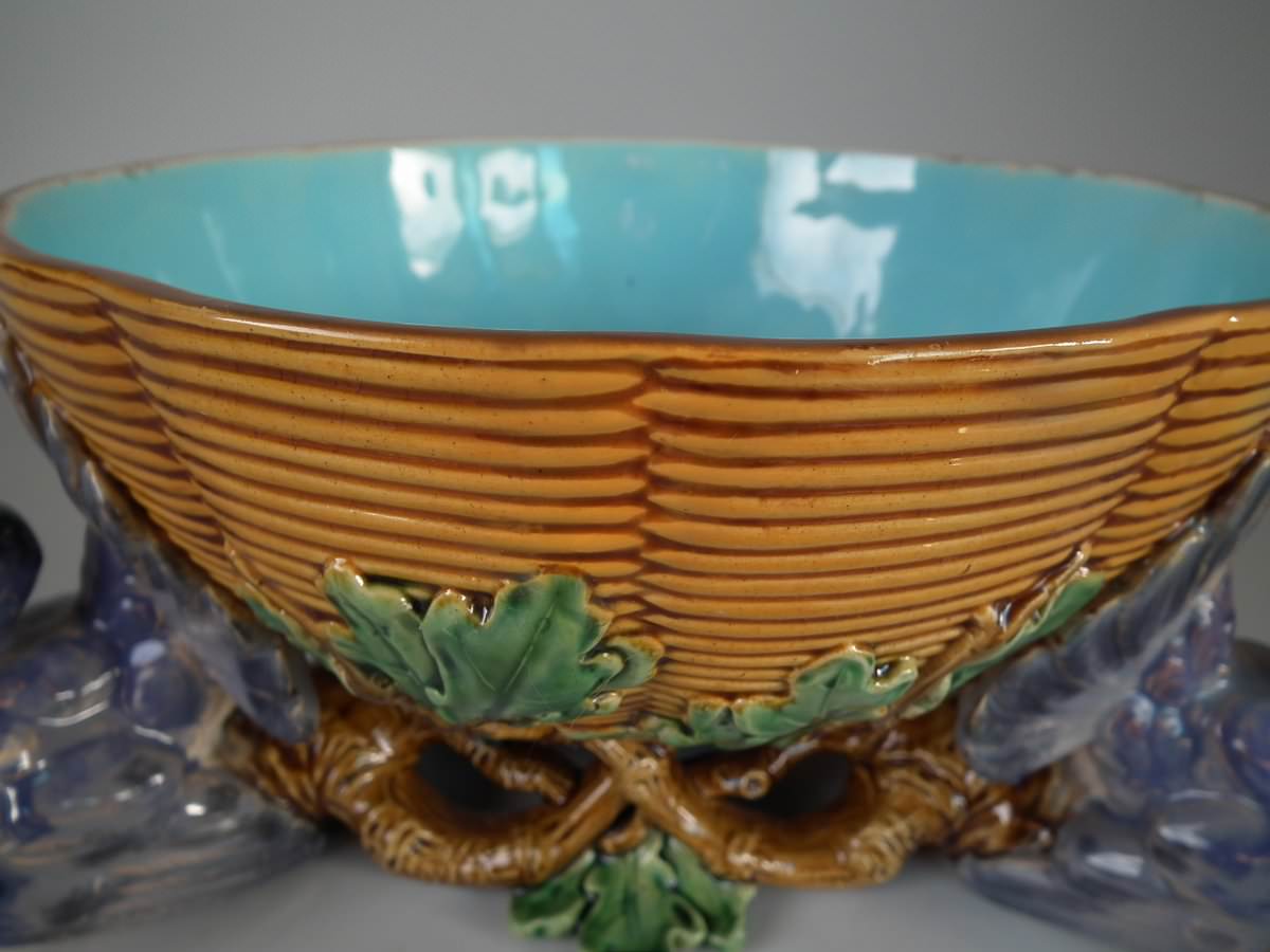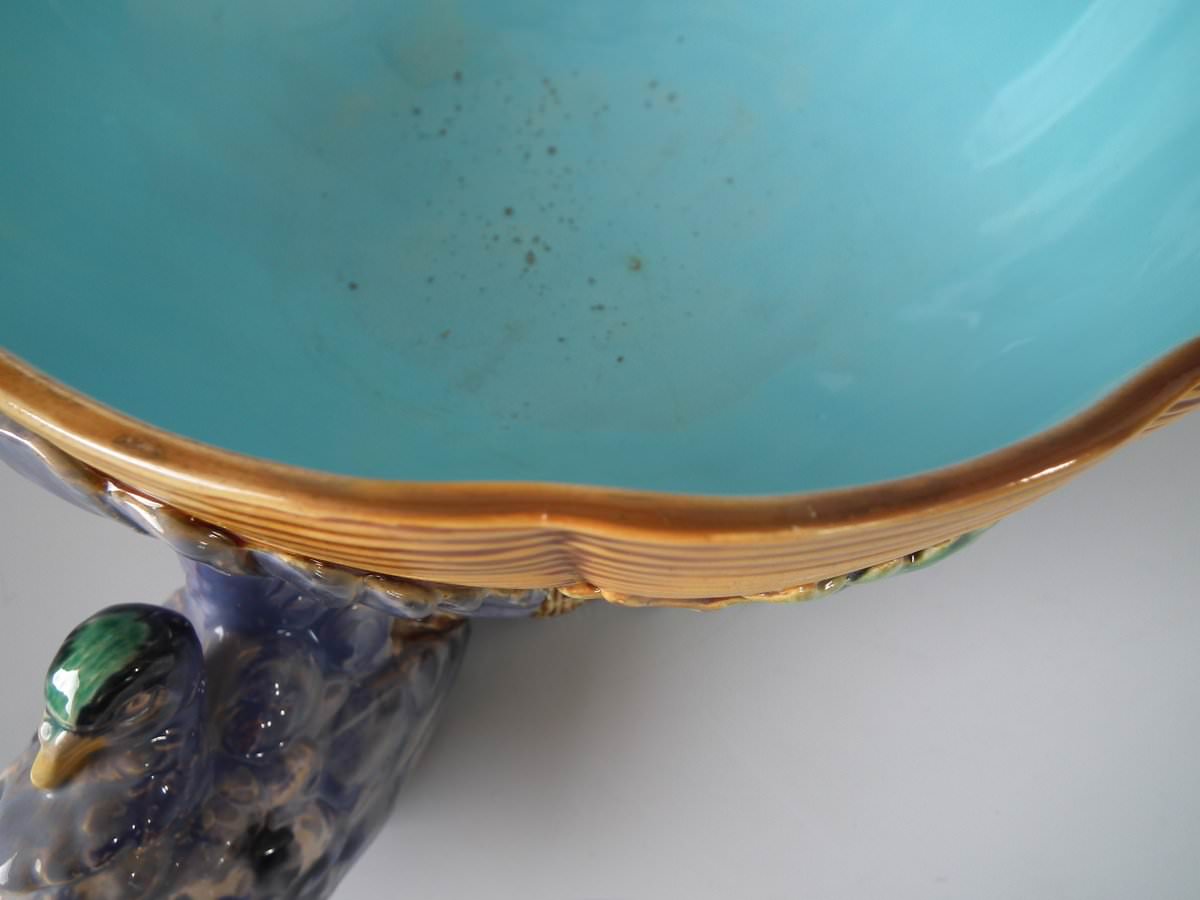 Victorian, circa 1870. 5.5ins high, 12.6ins wide, 12.6ins depth. Minton Majolica centrepiece bowl which features three pigeons with tails fanned out, supporting a basketweave bowl.