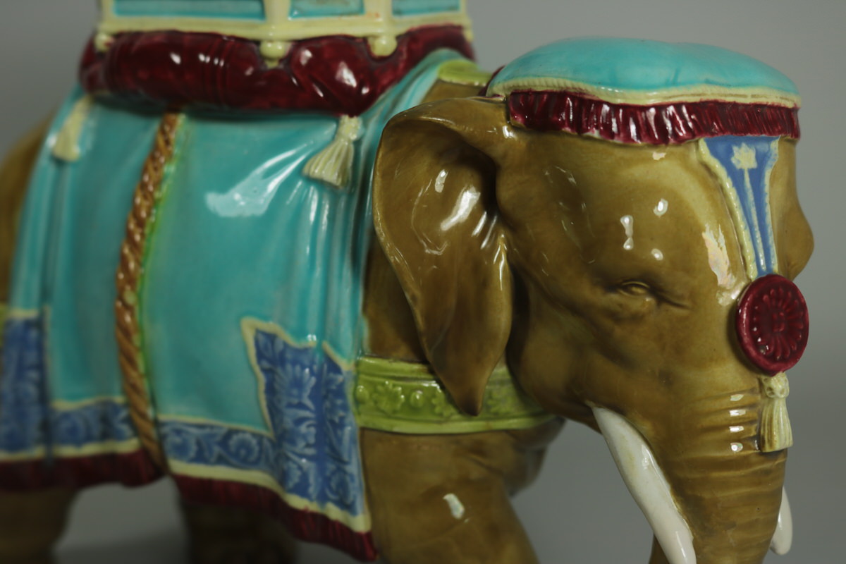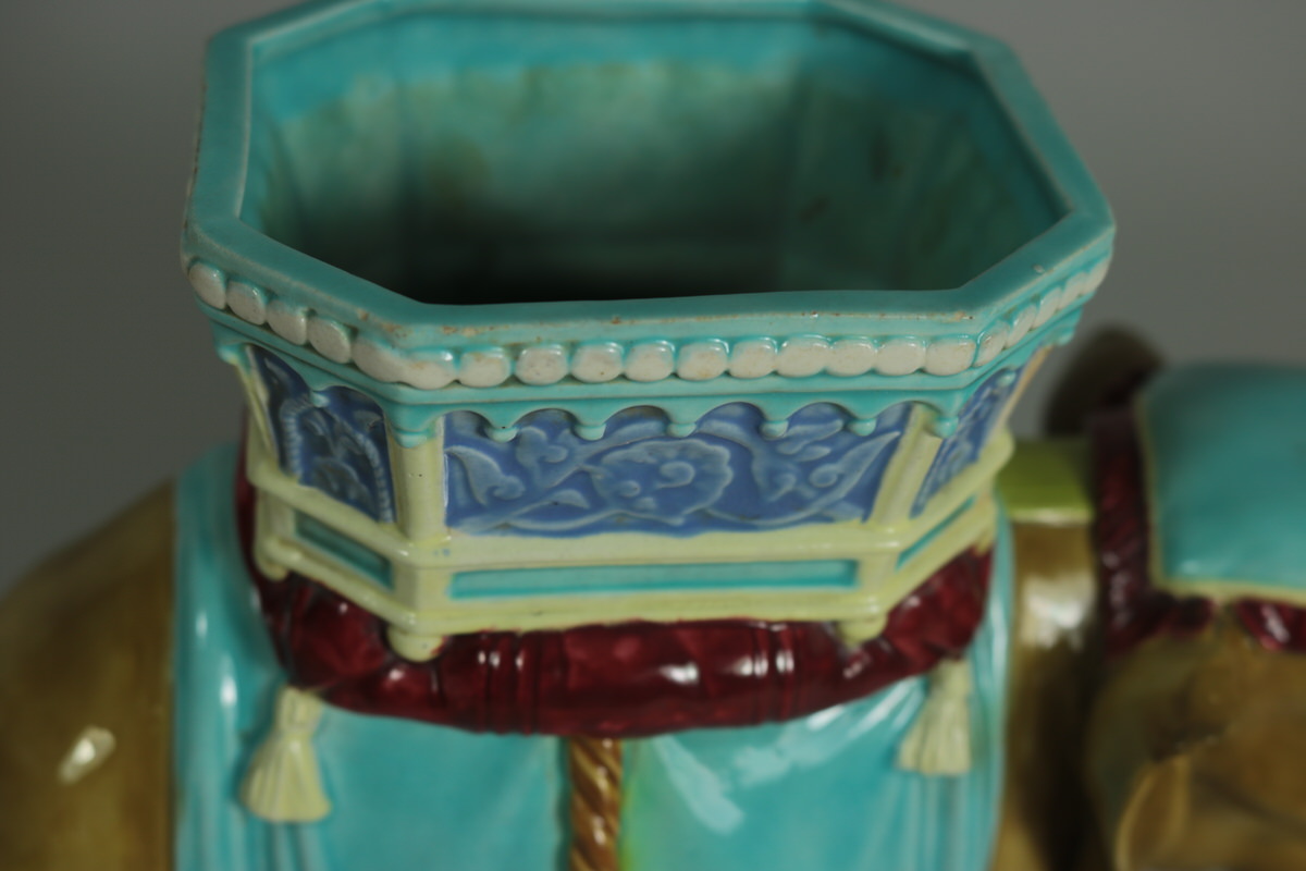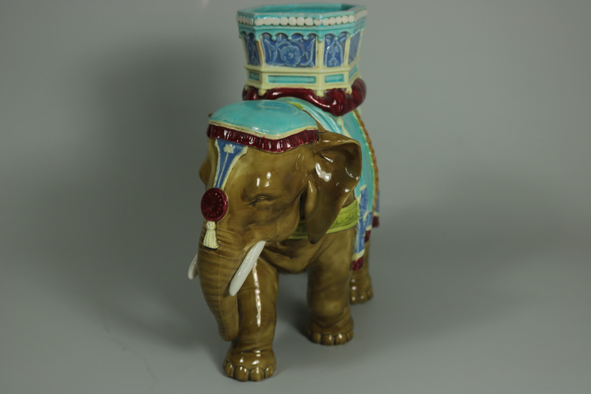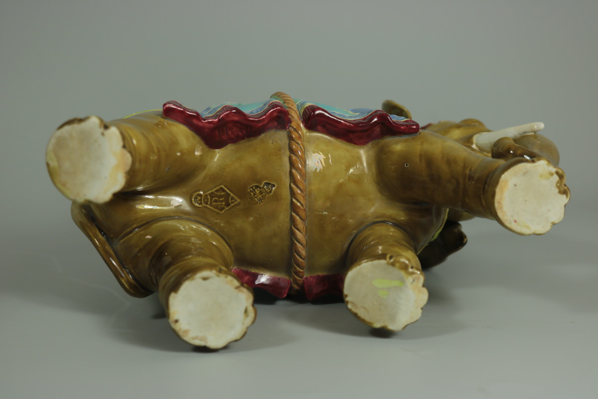 Victorian, circa 1869. 7.9ins high, 8.7ins wide, 3.5ins depth. Royal Worcester Majolica which features an elephant, with a howdah on it's back.