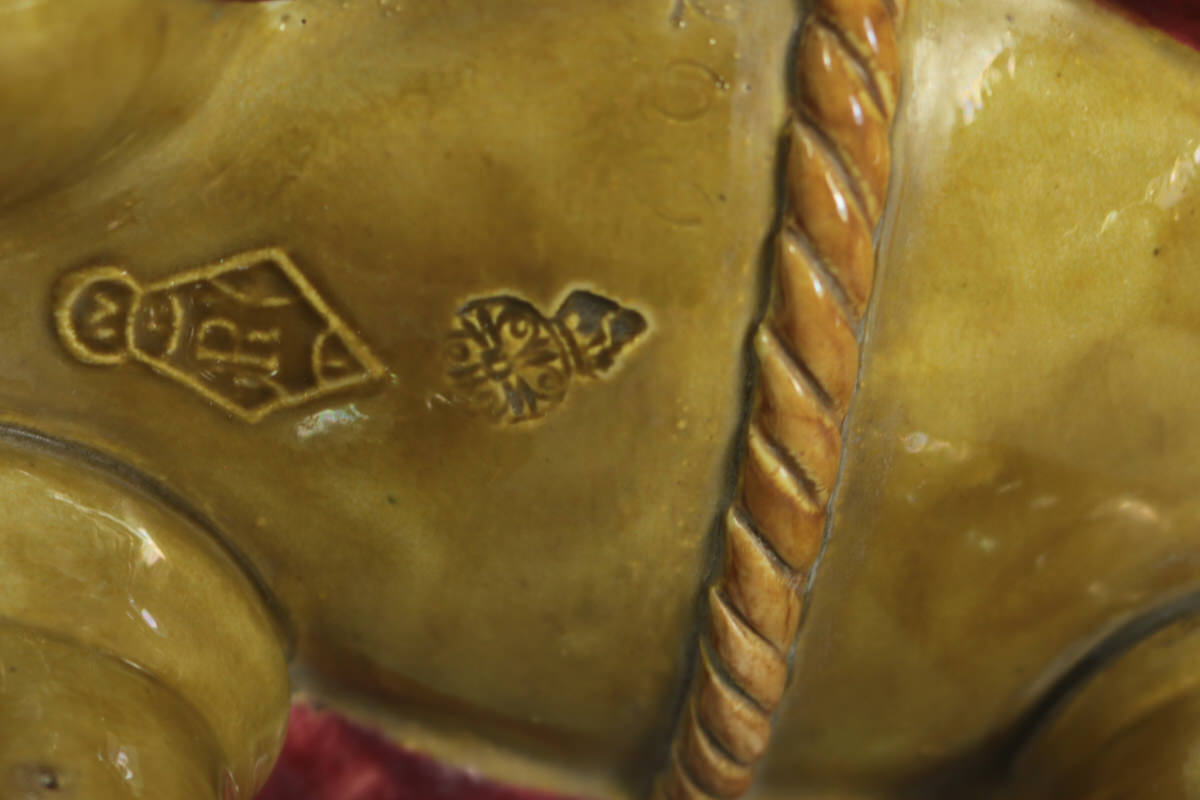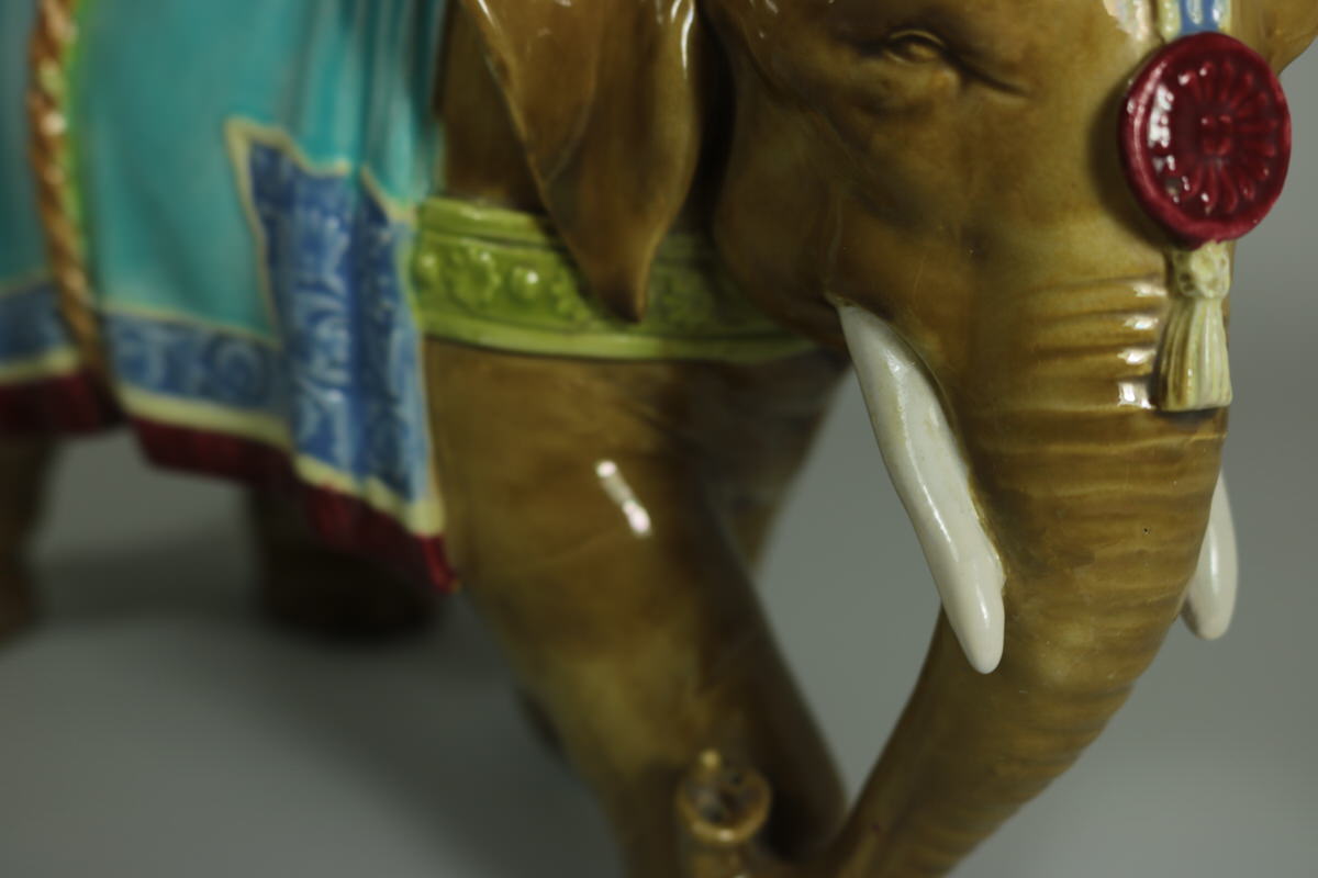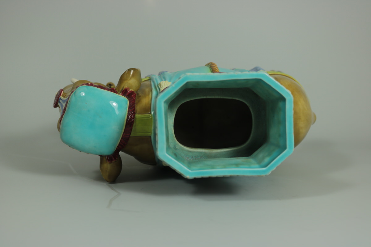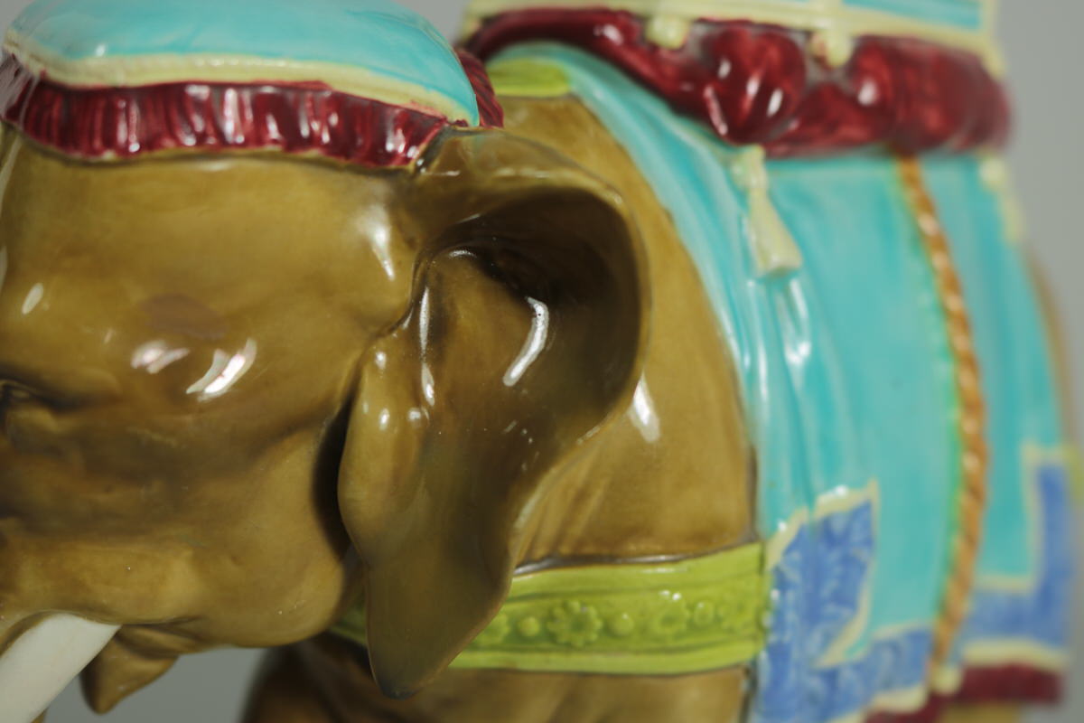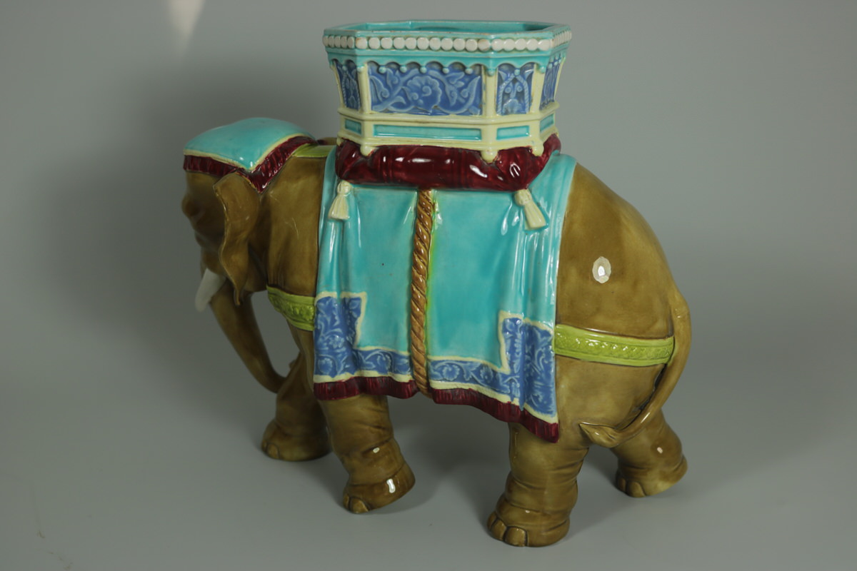 Victorian, circa 1869. 7.9ins high, 8.7ins wide, 3.5ins depth. Royal Worcester Majolica which features an elephant, with a howdah on it's back.