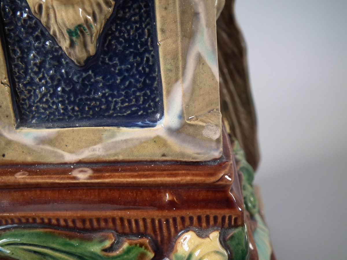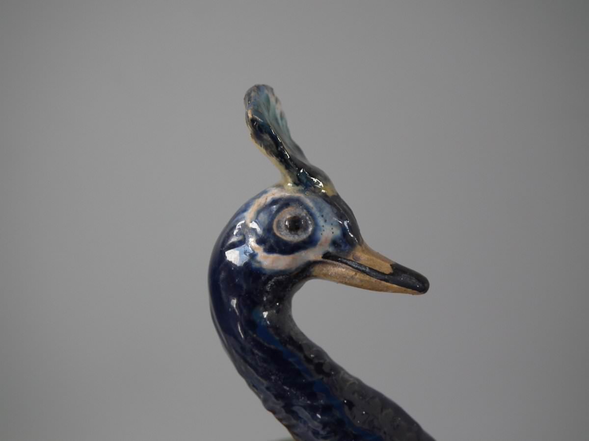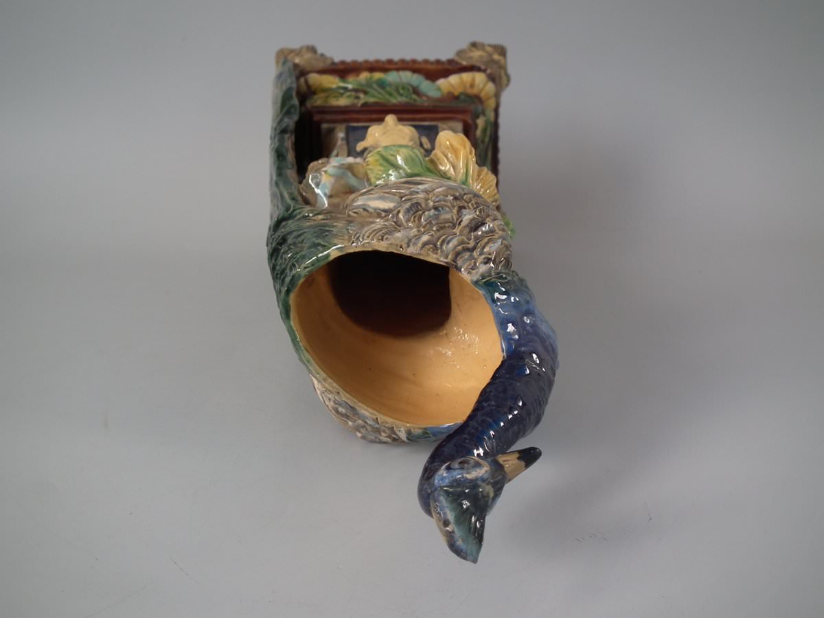 Circa 1880. 13.8ins high, 4.7ins wide, 5.3ins depth. Schiller Majolica vase which features a peacock seated on a pedestal.