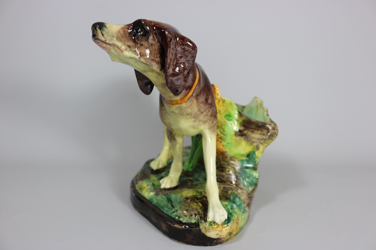 Circa 1910. 8.7ins high, 11ins wide, 7.1ins depth. Jerome Massier Fils French Majolica vase figural which features a hunting dog stood in front of a tree trunk.